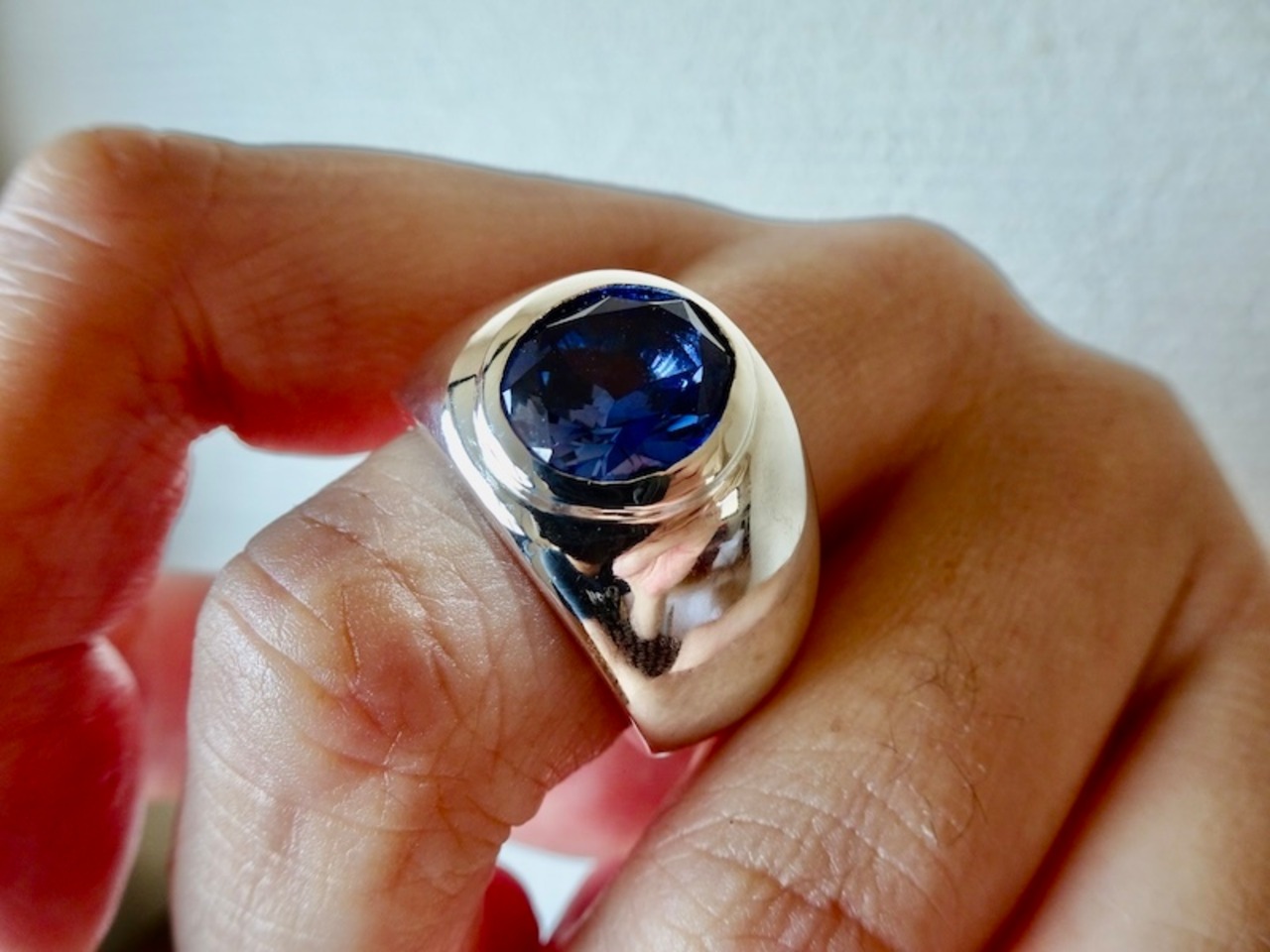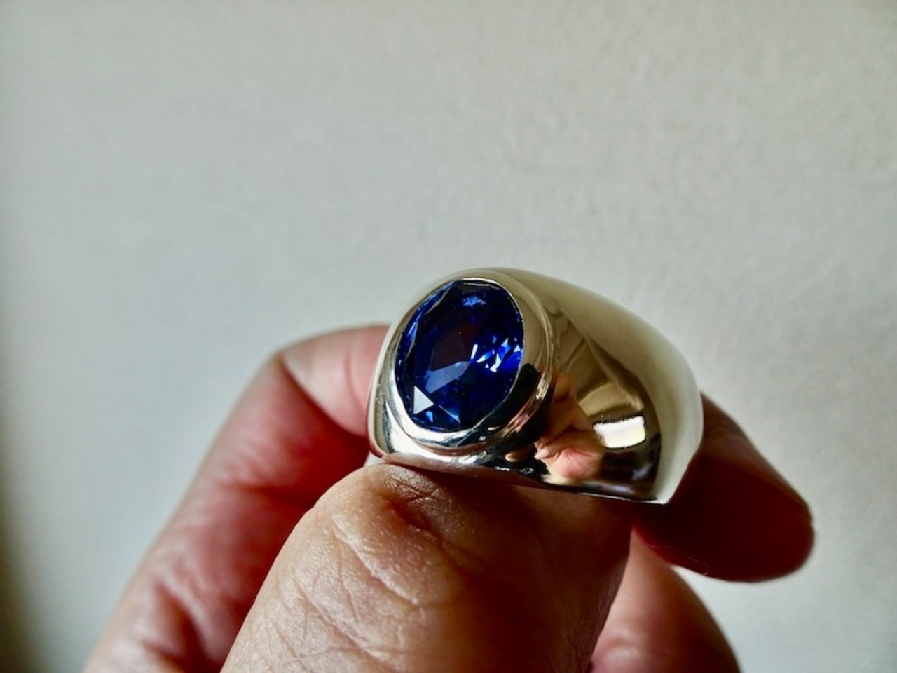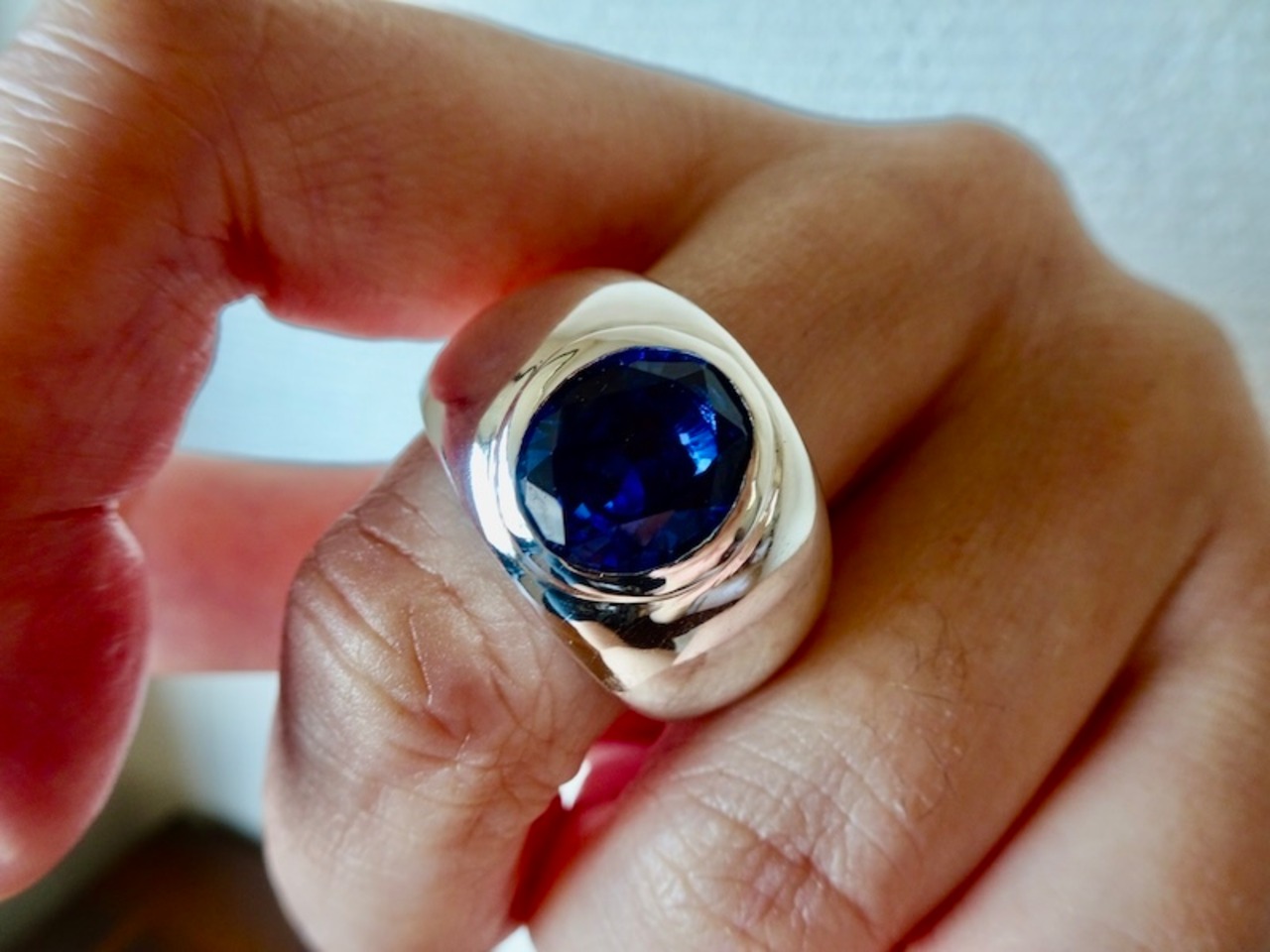 ごらん頂きありがとうございます。 オリジナルブランド 仁尾彫金『オーバルカット合成ブルーサファイア覆輪プラチナ、リング』を出品致します。オリジナルのアクセサリーを自ら制作しています。今回、最大幅1.6cmのリングに縦12ミリ、横10ミリのオーバルカットの合成ブルーサファイアを覆輪留め致しました。合成ですが本物と同じ成分、硬度になります。石も含め最大厚みは7mm弱と肉厚です。全てプラチナの塊でpt900を約55gとズシリと大胆に使用しています。全てプラチナの塊なので変色する事はありません!!オリジナリティを追求しデザイン、制作を私自身で行っている為、今回、新品をご用意致します!!