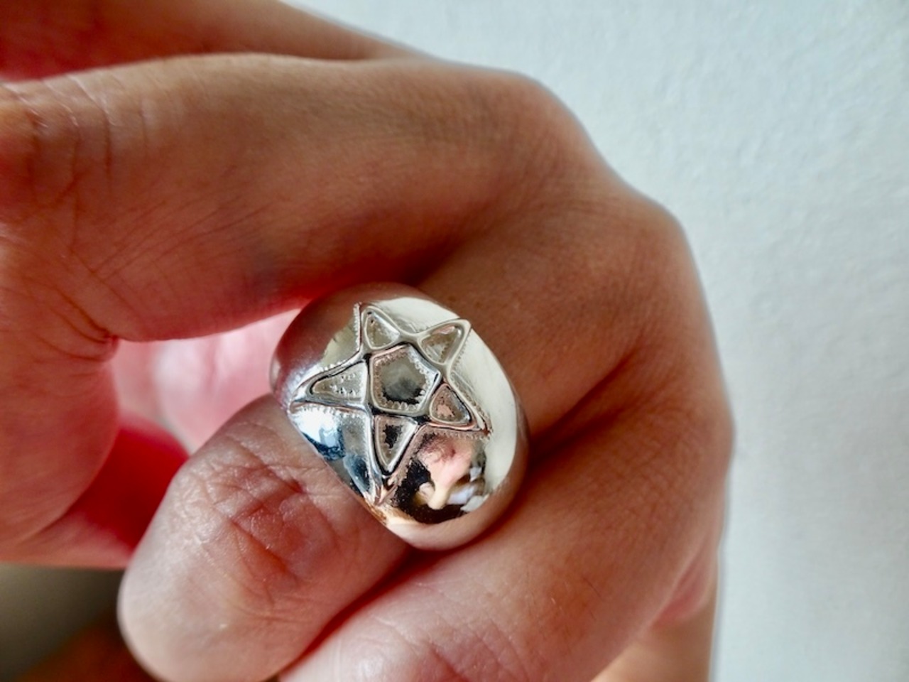 ごらん頂きありがとうございます。 オリジナルブランド 仁尾彫金『プラチナ、スター甲丸リング』を出品致します。オリジナルのアクセサリーを自ら制作しています。今回、シンプルな甲丸リングを制作致しましました。そこにスターのモチーフを造形致しました。最大幅は約1.5cm、最大厚みは約6mmで重量も約48gとプラチナをズシリ大胆に使用し、しっかりとした作りになっています。全てプラチナの塊なので変色する事はありません!!オリジナリティを追求しデザイン、制作を私自身で行っている為、今回、新品をご用意致します!!