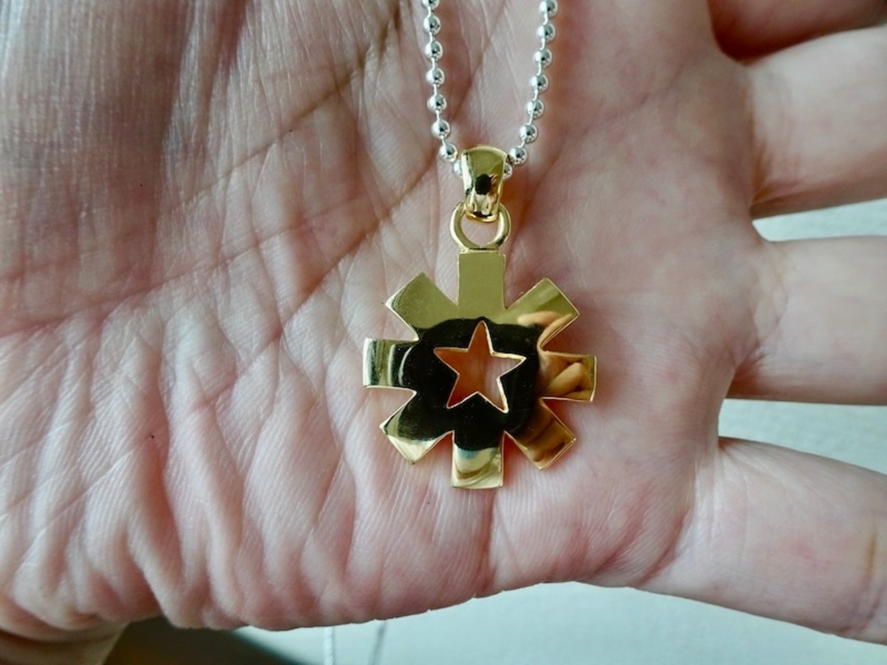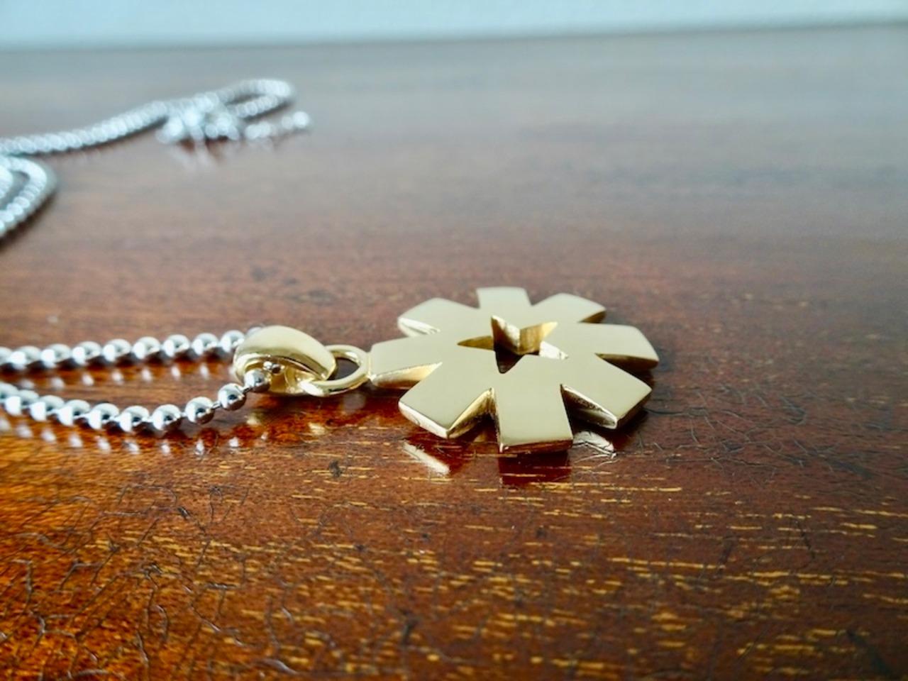 ごらん頂きありがとうございます。 オリジナルブランド 仁尾彫金『クリ抜きk18スターペンダント』を出品致します。 オリジナルのアクセサリーを自ら制作しています。今回、長方形を重ね合わせた幾何学立体を造形から、スターの形をクリ抜きました。バチカンを含めまして縦約3.2cm、横2.2cmです。最大厚みは約2.6mmあります。全て金の塊で重量も約10gあります。全てk18の塊なので永久にゴールドに輝き続けます!! デザイン、制作を私自身で行っている為、新品をご用意致します!! シルバー925ボールチェーンネックレス50cm(45から50cmサイズ調節可)も付属致します。