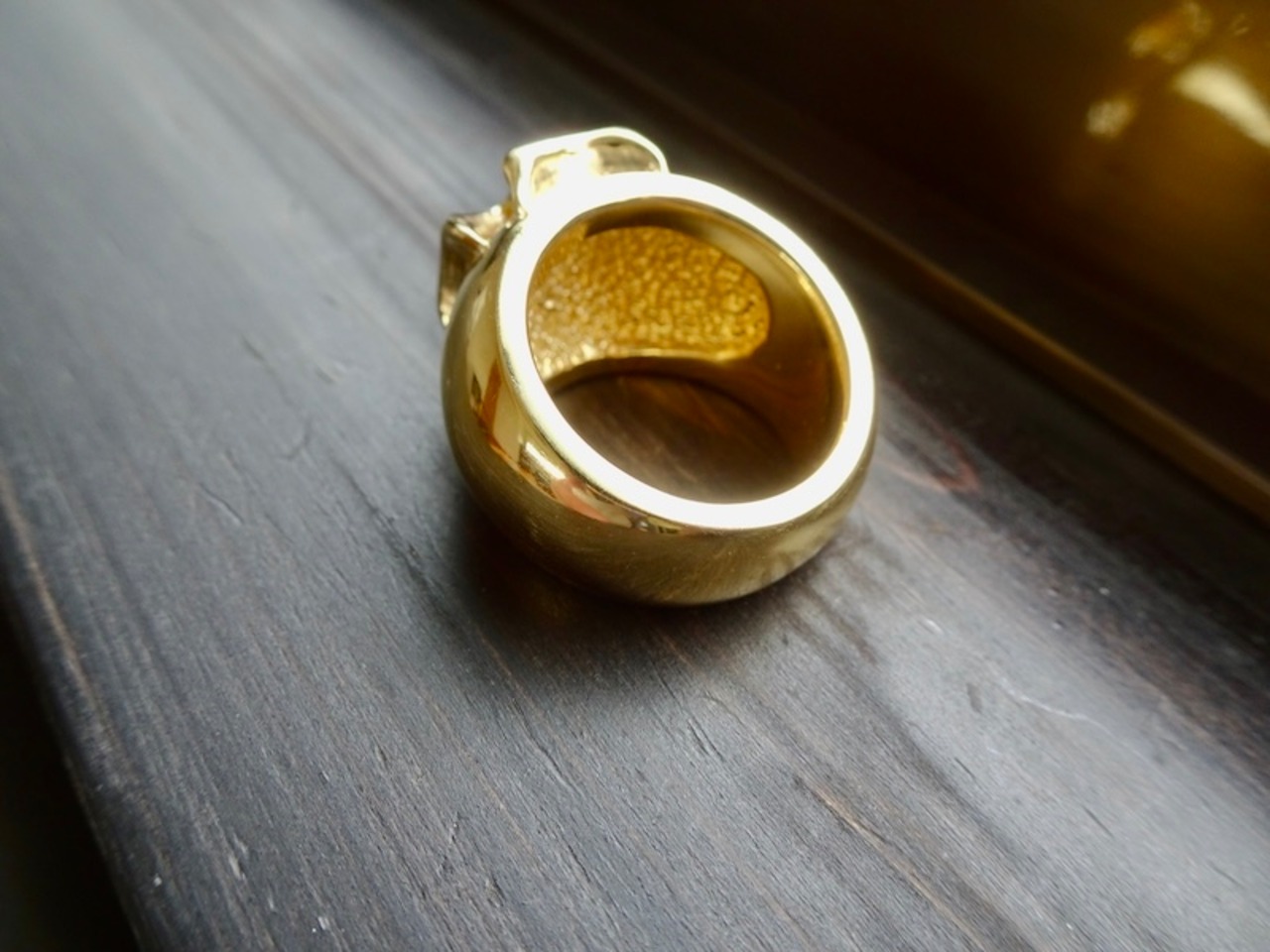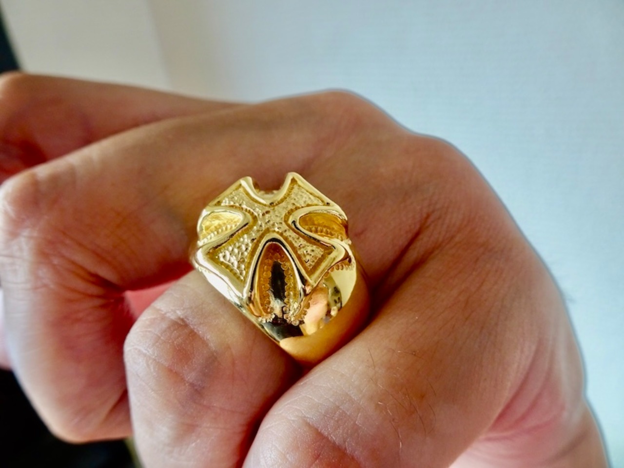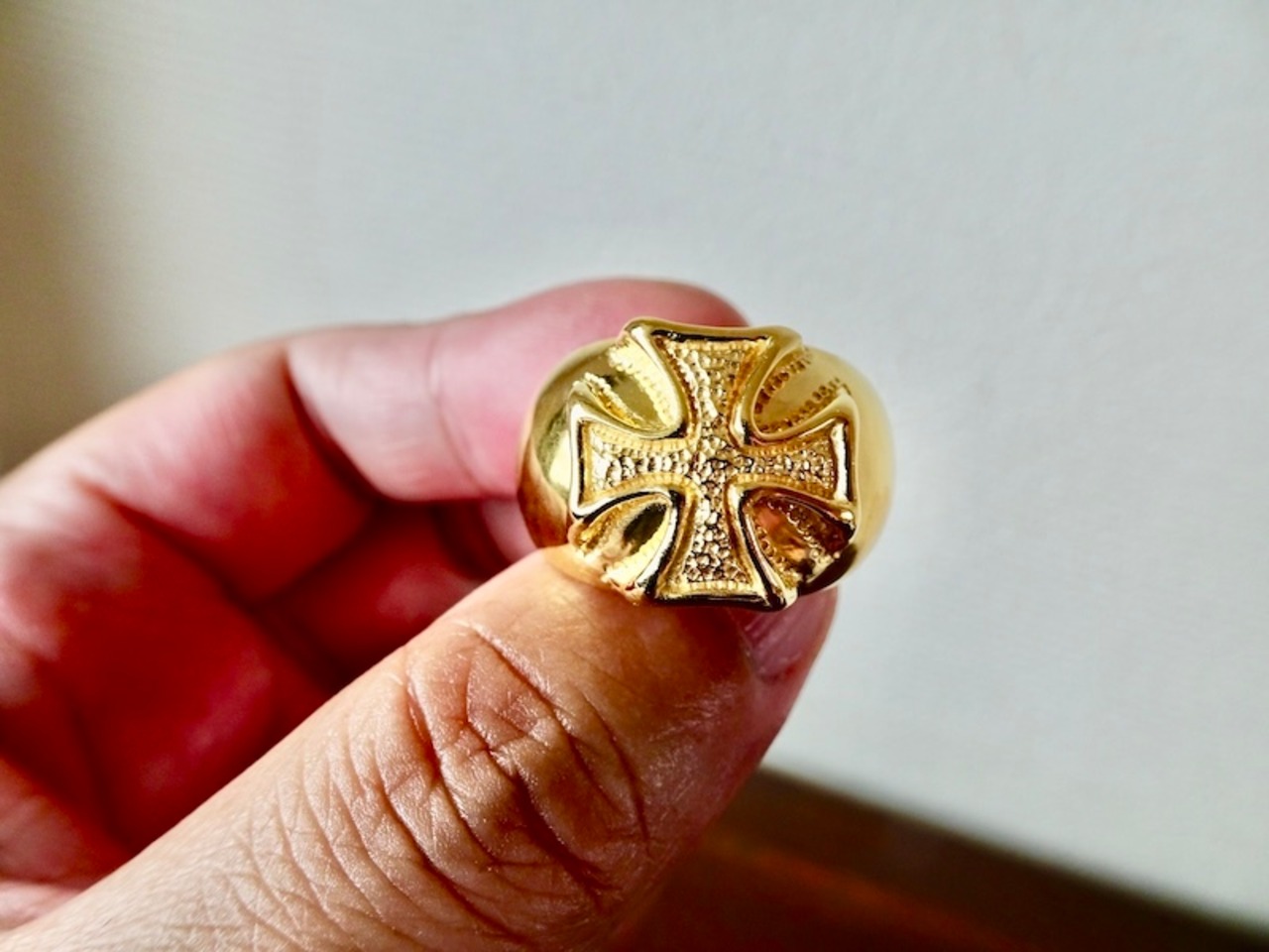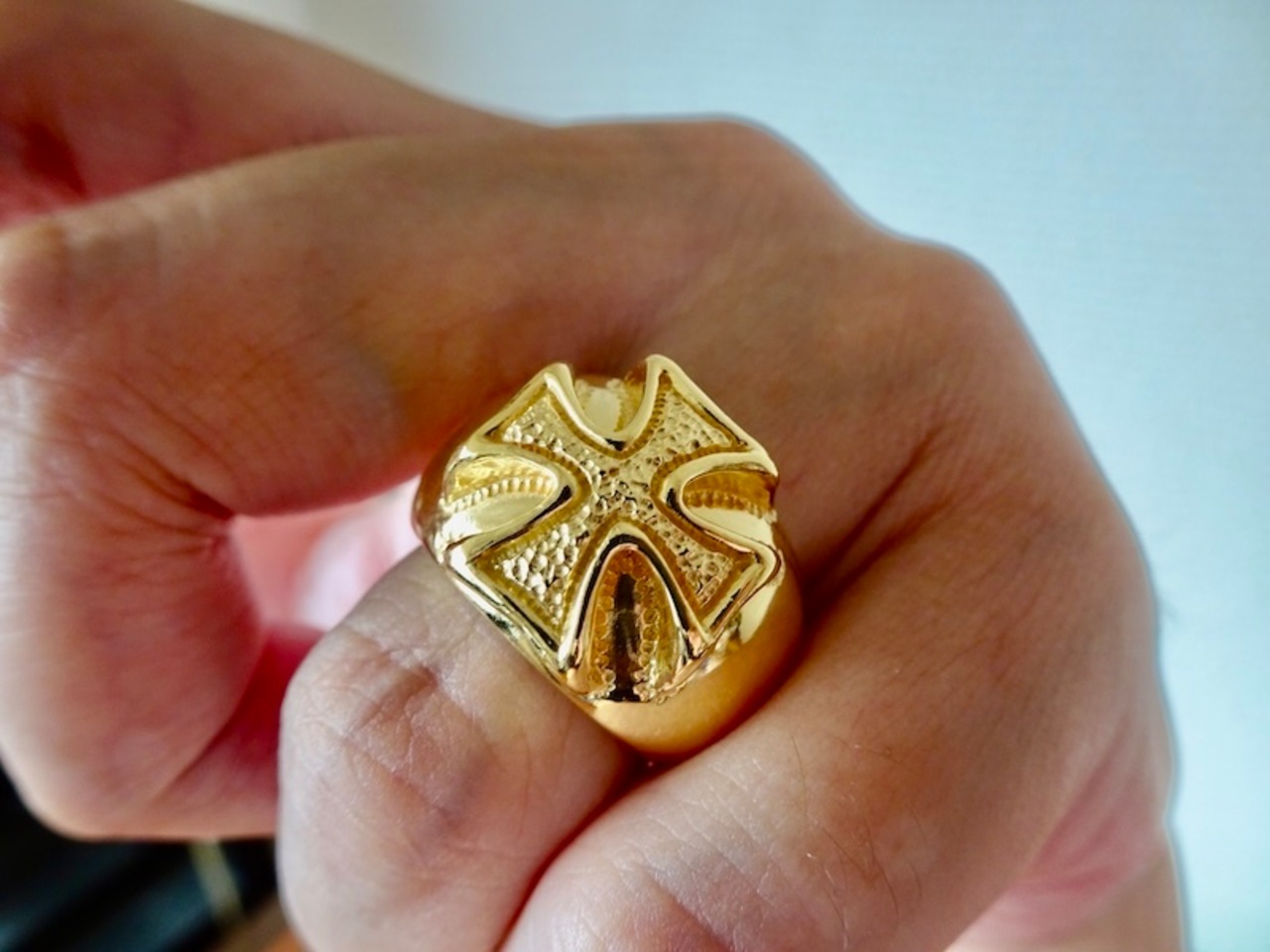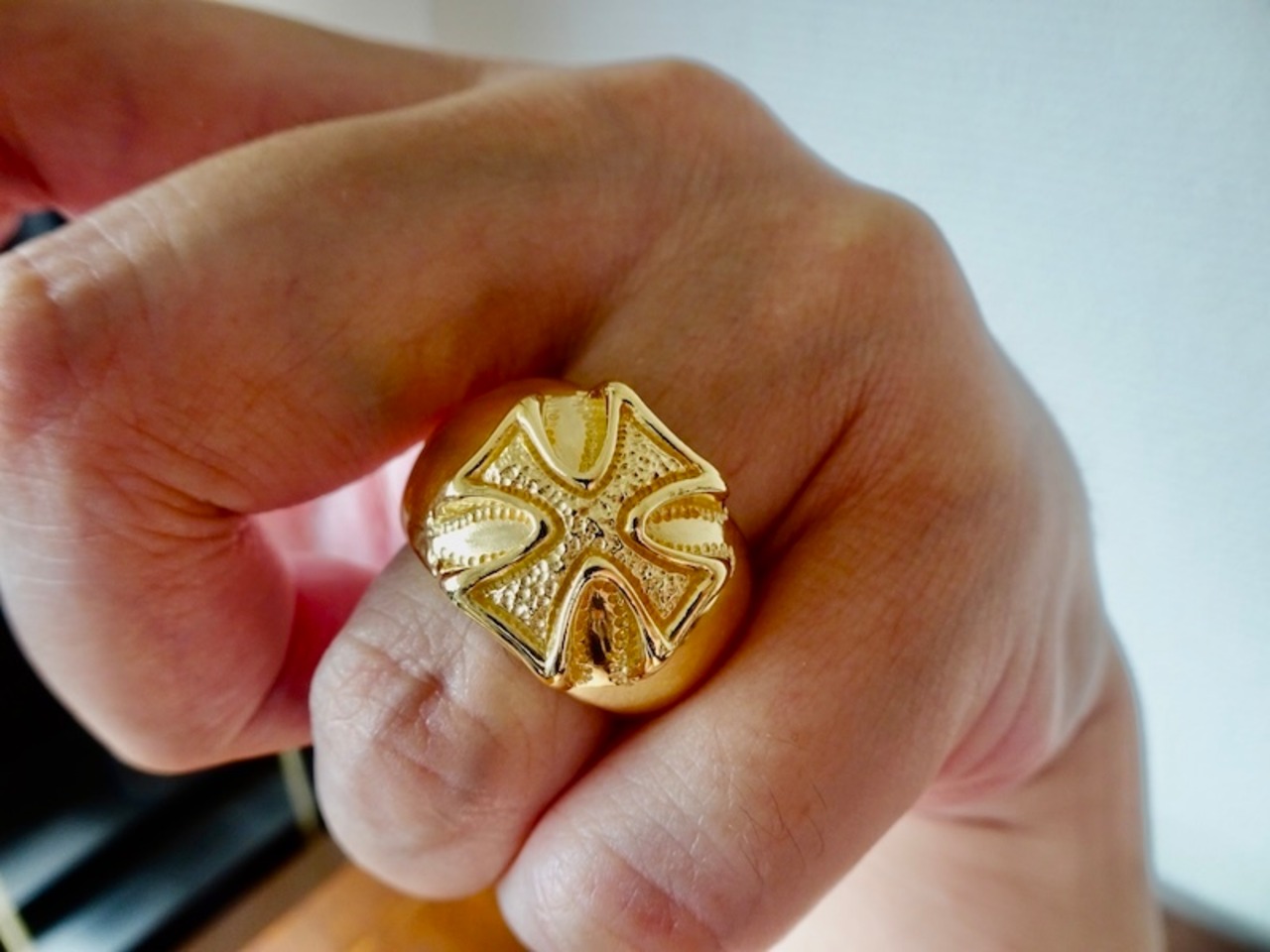 ごらん頂きありがとうございます。 オリジナルブランド 仁尾彫金『k18ゴールド、ギャラクシーアイアンクロス甲丸リング』を出品致します。宇宙をテーマにしたオリジナルのアクセサリーを自ら制作しています。今回、甲丸リングを制作致しました。そこに立体的なアイアンクロスのモチーフを立体的に造形致しました。アイアンクロスに輝く星をイメージした凸凹のテクスチャをいれています。最大幅は約1.6cm、最大厚みは約8.5mmです。全て金の塊で重量も約42gとk18をズッシリと使用し、しっかりとした作りになっています。全て金の塊なので永久にゴールドに輝き続けます!!オリジナリティを追求しデザイン、制作を私自身で行っている為、今回、新品をご用意致します!!