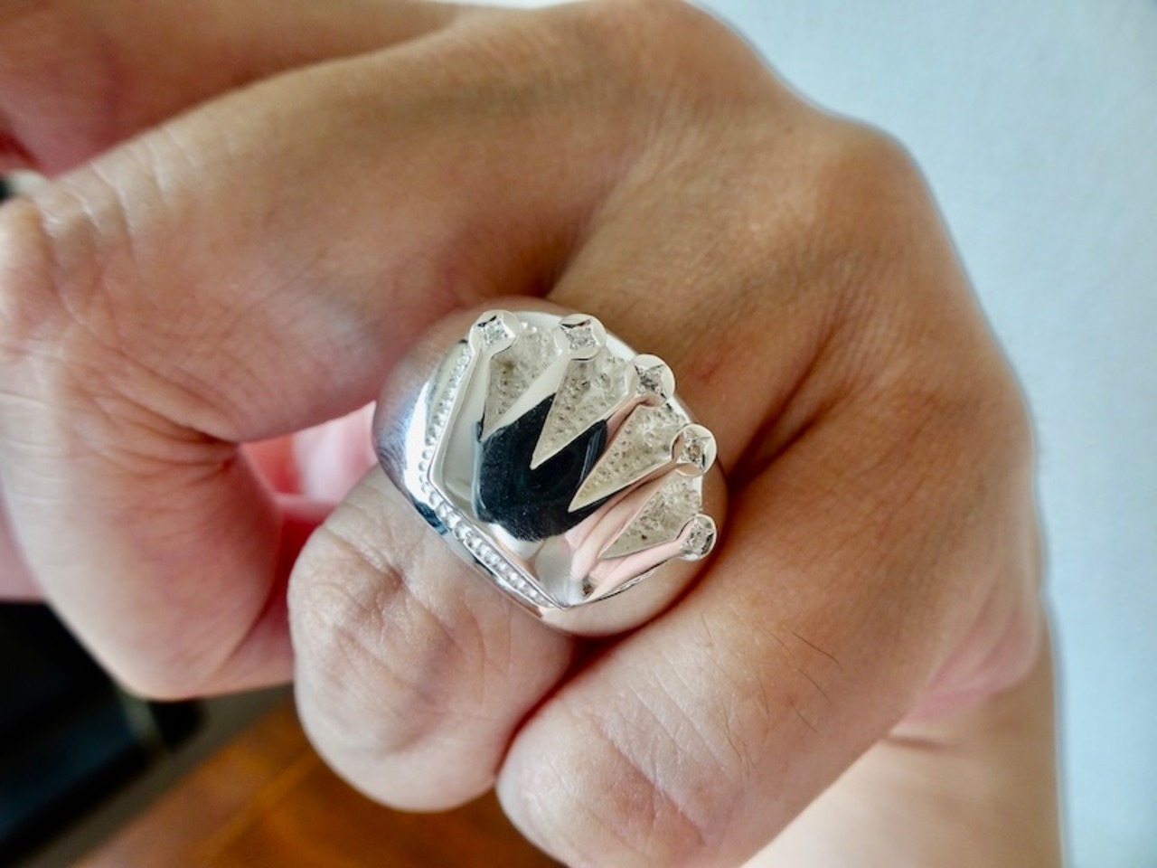 ごらん頂きありがとうございます。 オリジナルブランド 仁尾彫金『5つ星ダイヤ、プラチナ、クラウン甲丸リング』を出品致しますオリジナルのアクセサリーを自ら制作しています。今回、甲丸リングを制作致しました。そこに王冠モチーフを立体的に造形致しました。王冠の先に1.3mmのダイヤモンドを5石埋め込みました。使用ダイヤは上級クラスなので無色透明で照り輝きも最高です。大幅は約1.6cm強、最大厚みは約7mm弱です。全てプラチナの塊で重量も約47gとずっしりとしっかりとした作りになっています。全てプラチナの塊なので変色する事はありません。オリジナリティを追求しデザイン、制作を私自身で行っている為、今回、新品をご用意致します!!