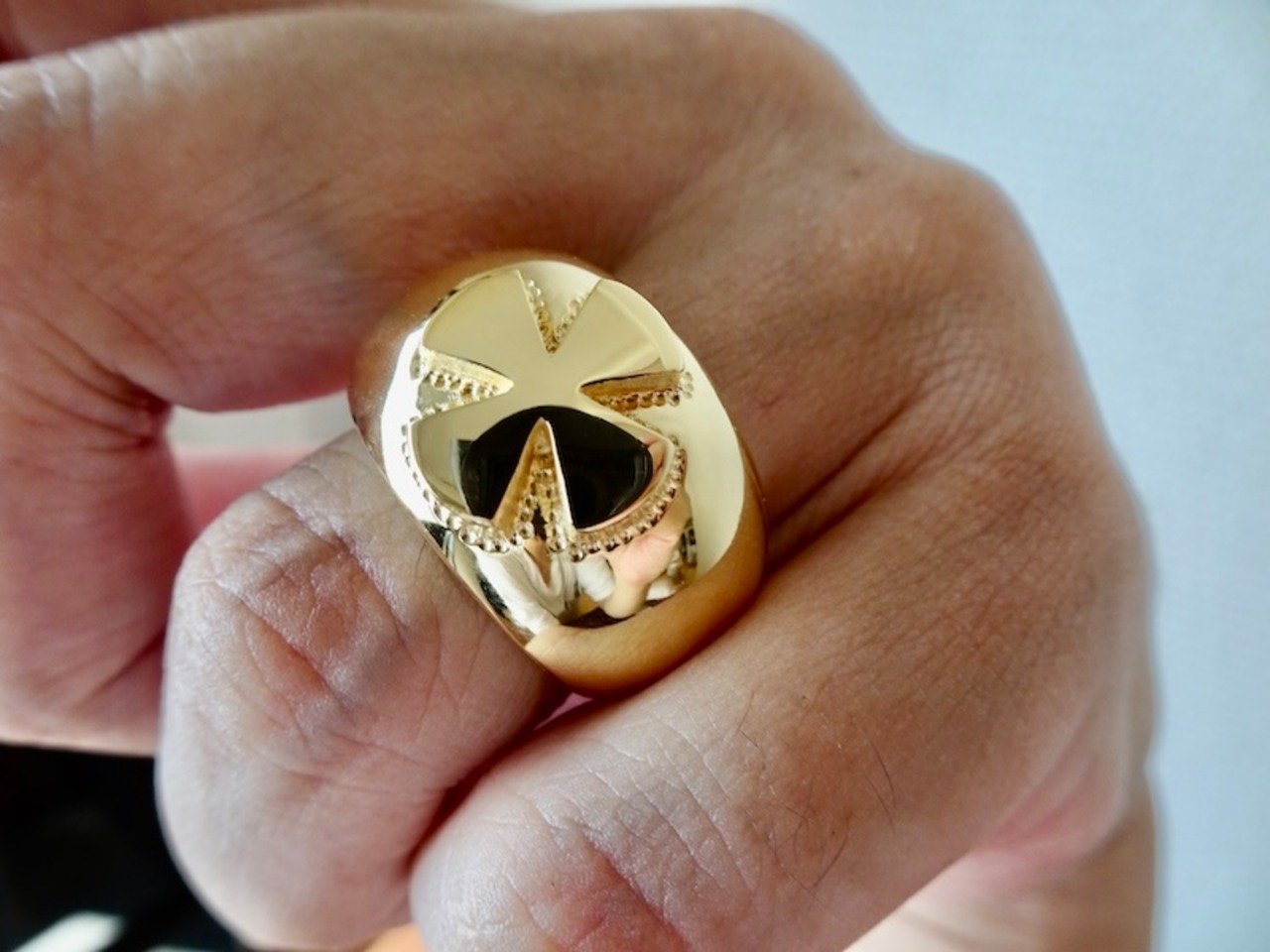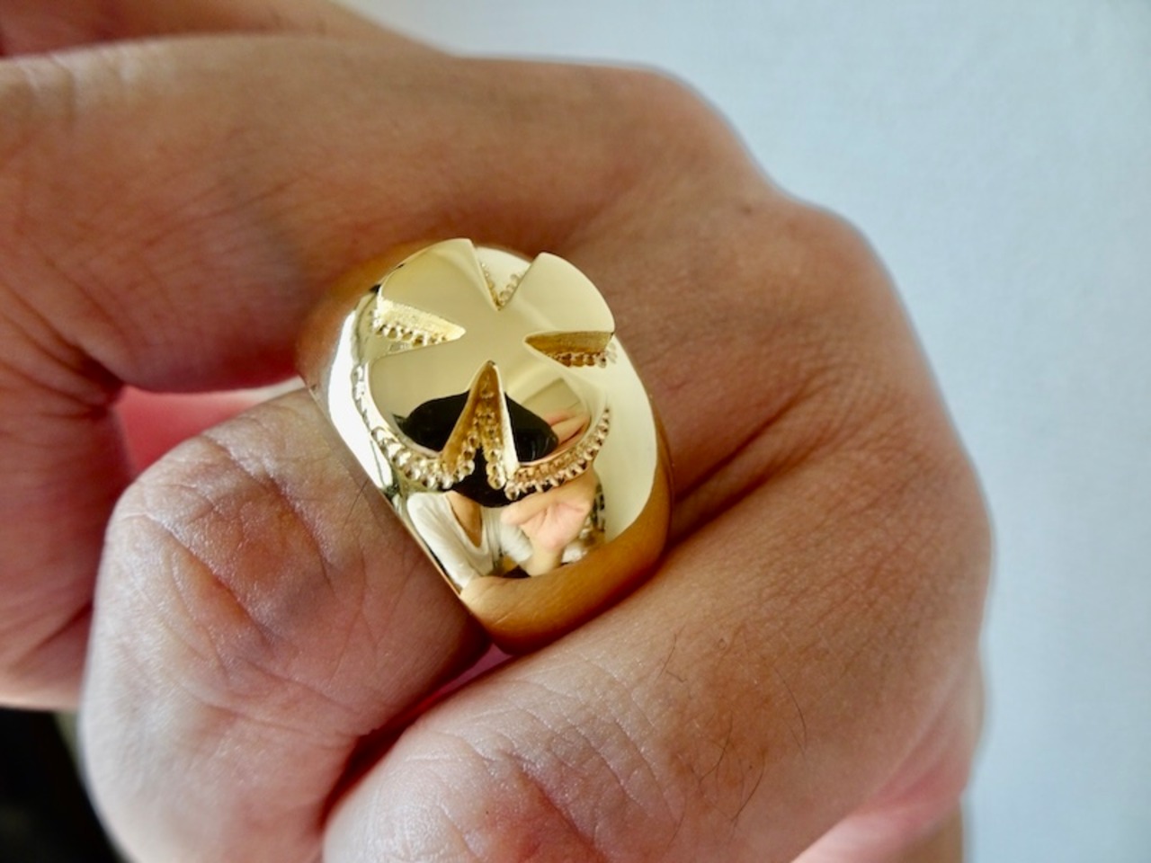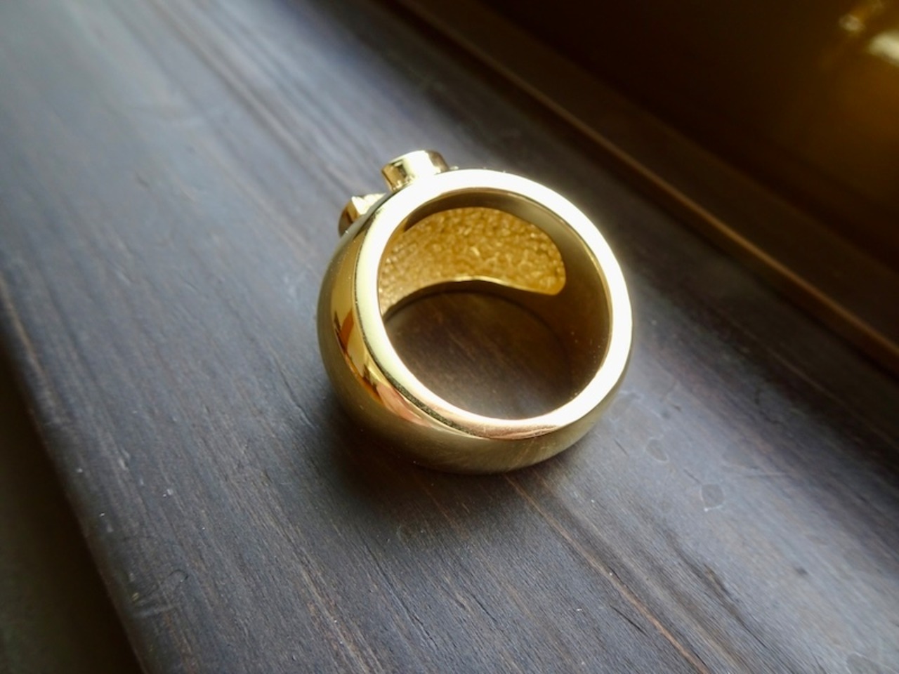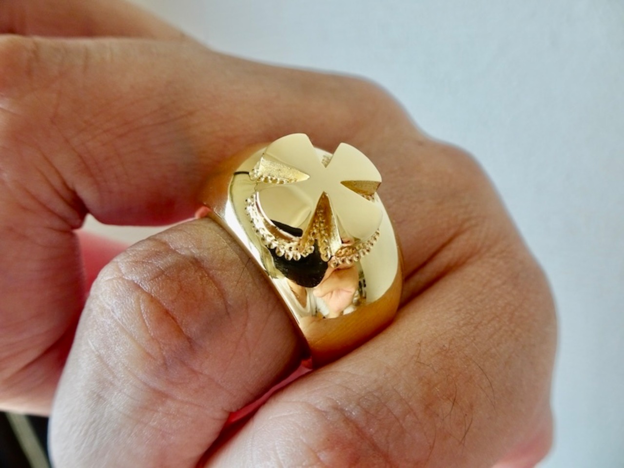 ごらん頂きありがとうございます。 オリジナルブランド 仁尾彫金『k18ゴールド、アイアンクロス甲丸リング』を出品致します。オリジナルのアクセサリーを自ら制作しています。今回、甲丸リングを制作致しました。そこにアイアンクロスモチーフを立体的に造形致しました。最大幅は約1.6cm弱、最大厚みは約7mm弱です。全てk18の塊で重量も金を約37gとずっしりとしっかりとした作りになっています。全て金の塊なので永久にゴールドに輝き続けます。オリジナリティを追求しデザイン、制作を私自身で行っている為、今回、新品をご用意致します!!