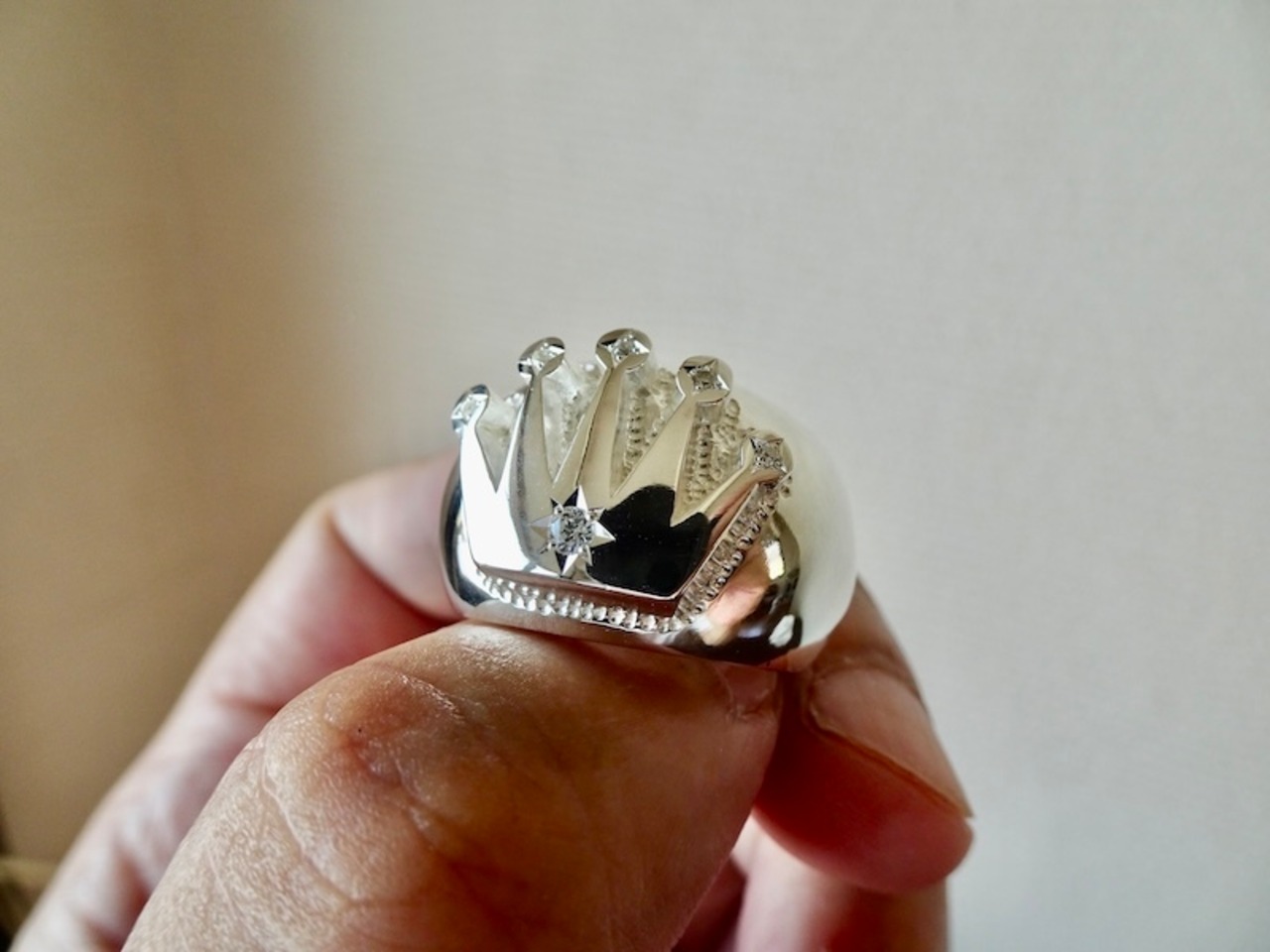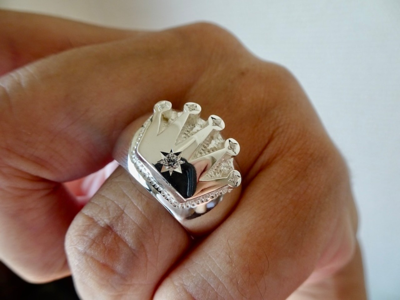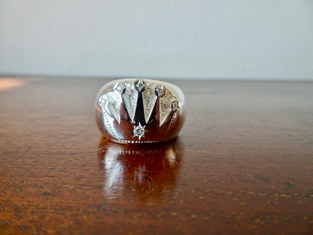 ごらん頂きありがとうございます。 オリジナルブランド 仁尾彫金『6つ星ダイヤ、クラウン甲丸リング』を出品致しますオリジナルのアクセサリーを自ら制作しています。今回、甲丸リングを制作致しました。そこに王冠モチーフを立体的に造形致しました。王冠の先に1.3mmのダイヤモンドを5石、クラウンの中央に2.3mmのダイヤモンドを1石埋め込みました。使用ダイヤは上級クラスなので無色透明で照り輝きも最高です。大幅は約1.6cm強、最大厚みは約7mm弱で重量も約24gとシルバーをズシリ使用し、しっかりとした作りになっています。使い込むとリングはシルバーなので独特の味が出てきます。オリジナリティを追求しデザイン、制作を私自身で行っている為、今回、新品をご用意致します!!