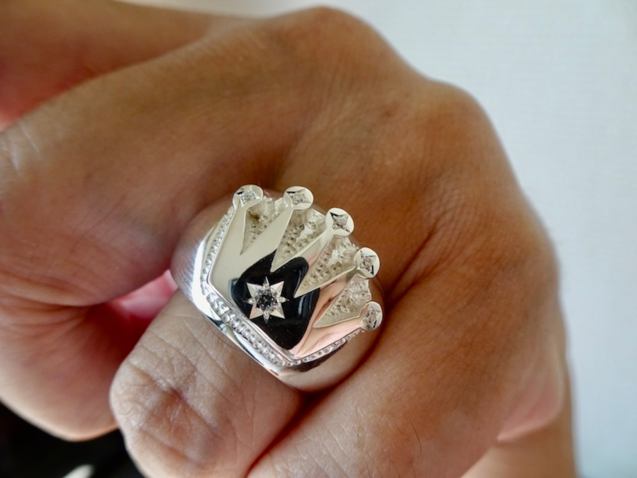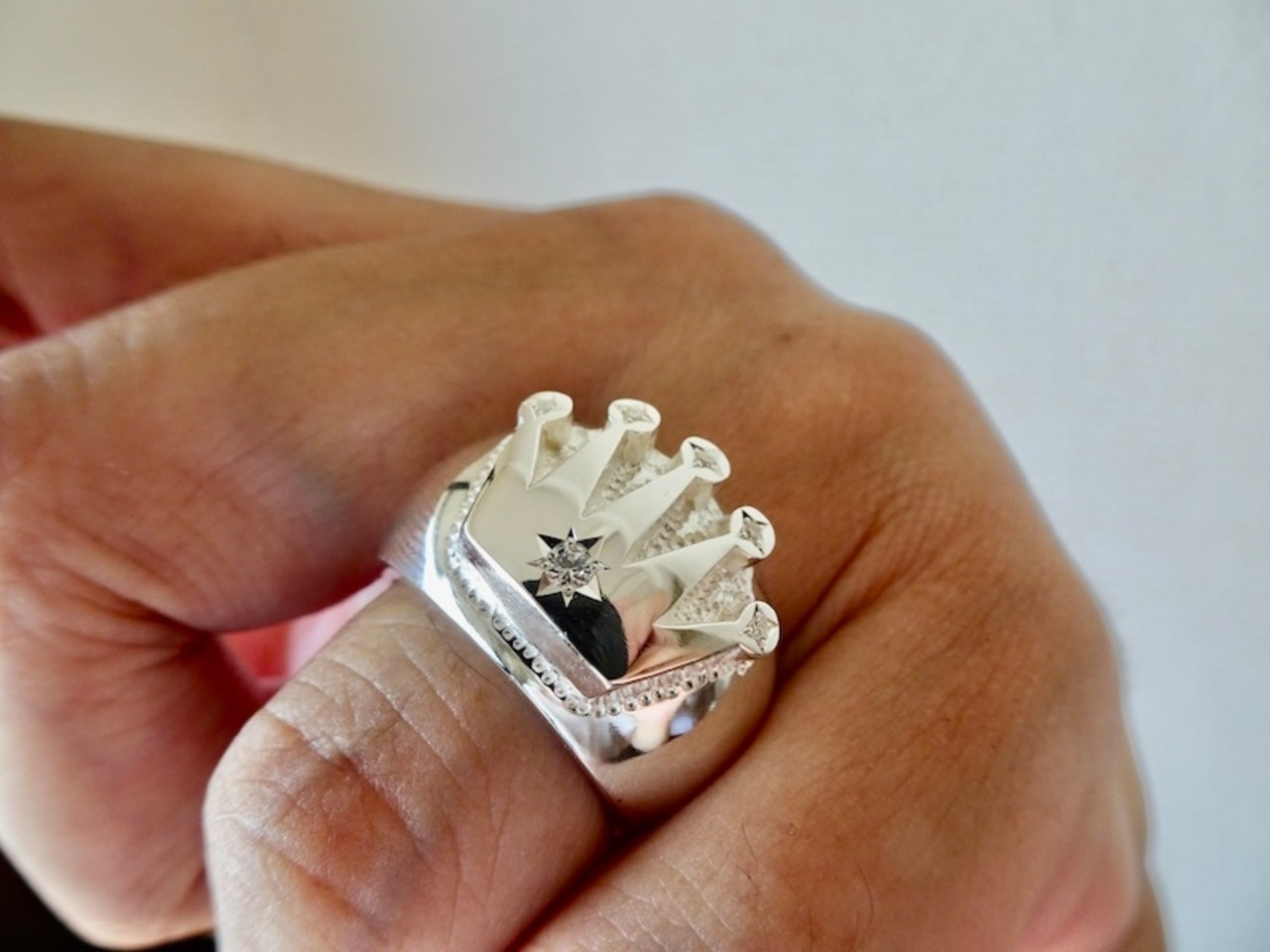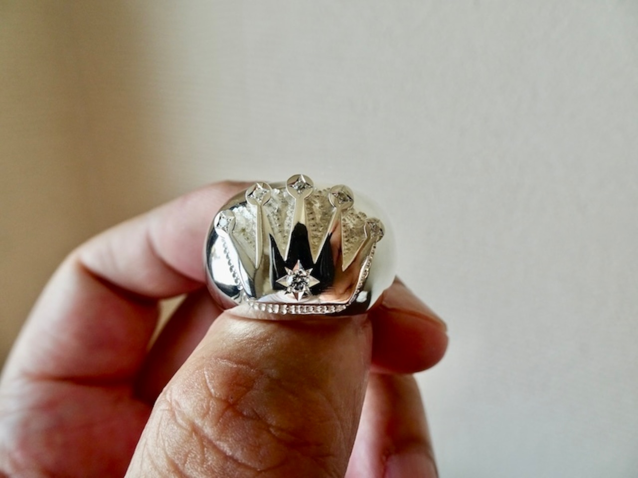 ごらん頂きありがとうございます。 オリジナルブランド 仁尾彫金『6つ星ダイヤ、クラウン甲丸リング』を出品致しますオリジナルのアクセサリーを自ら制作しています。今回、甲丸リングを制作致しました。そこに王冠モチーフを立体的に造形致しました。王冠の先に1.3mmのダイヤモンドを5石、クラウンの中央に2.3mmのダイヤモンドを1石埋め込みました。使用ダイヤは上級クラスなので無色透明で照り輝きも最高です。大幅は約1.6cm強、最大厚みは約7mm弱で重量も約24gとシルバーをズシリ使用し、しっかりとした作りになっています。使い込むとリングはシルバーなので独特の味が出てきます。オリジナリティを追求しデザイン、制作を私自身で行っている為、今回、新品をご用意致します!!