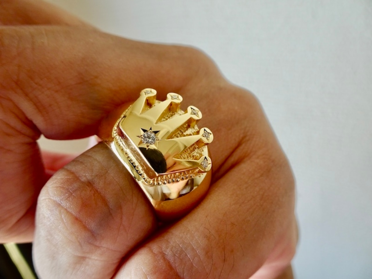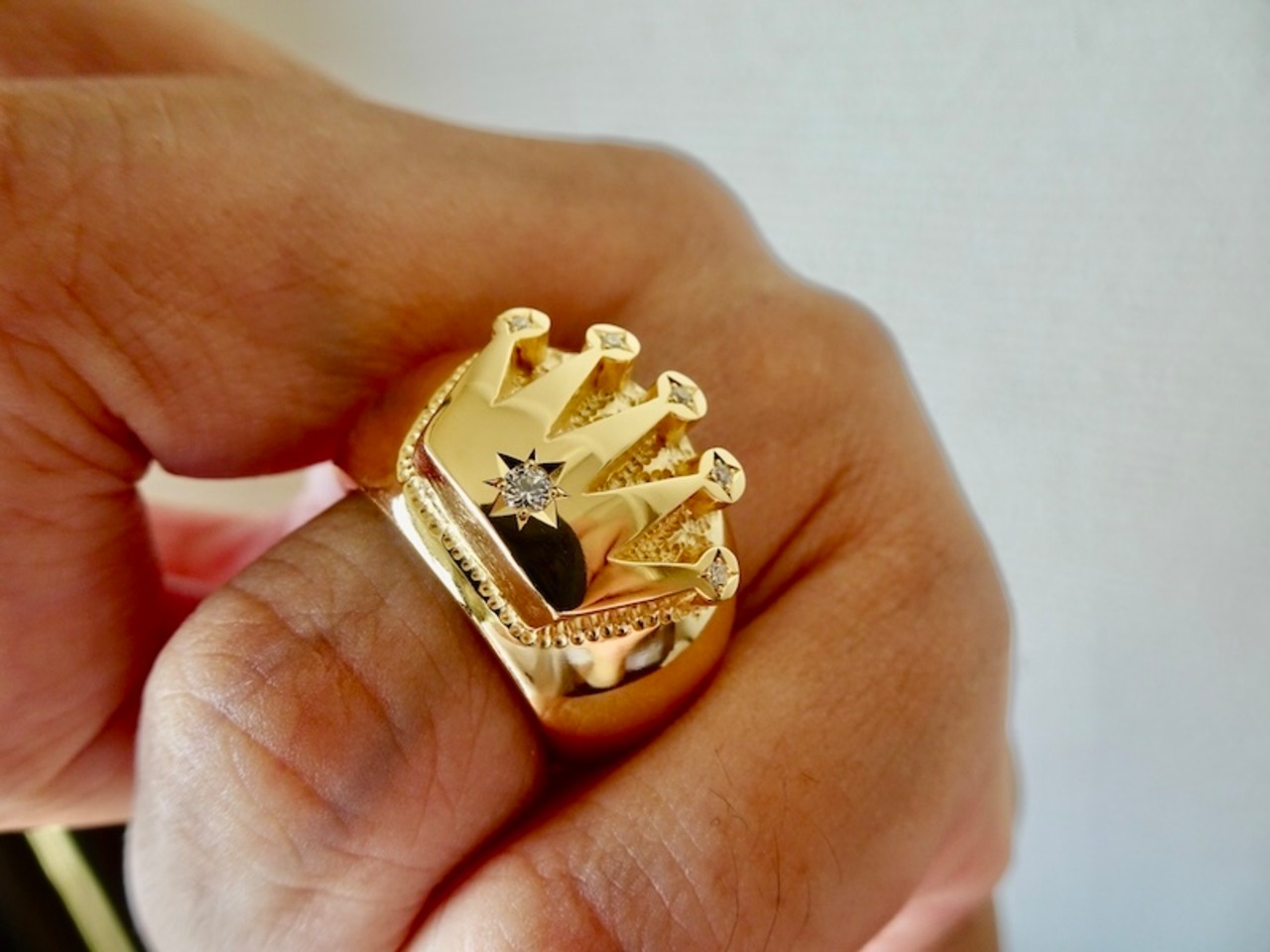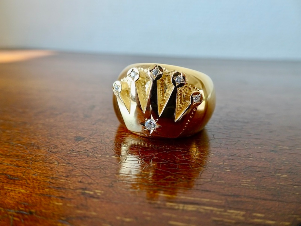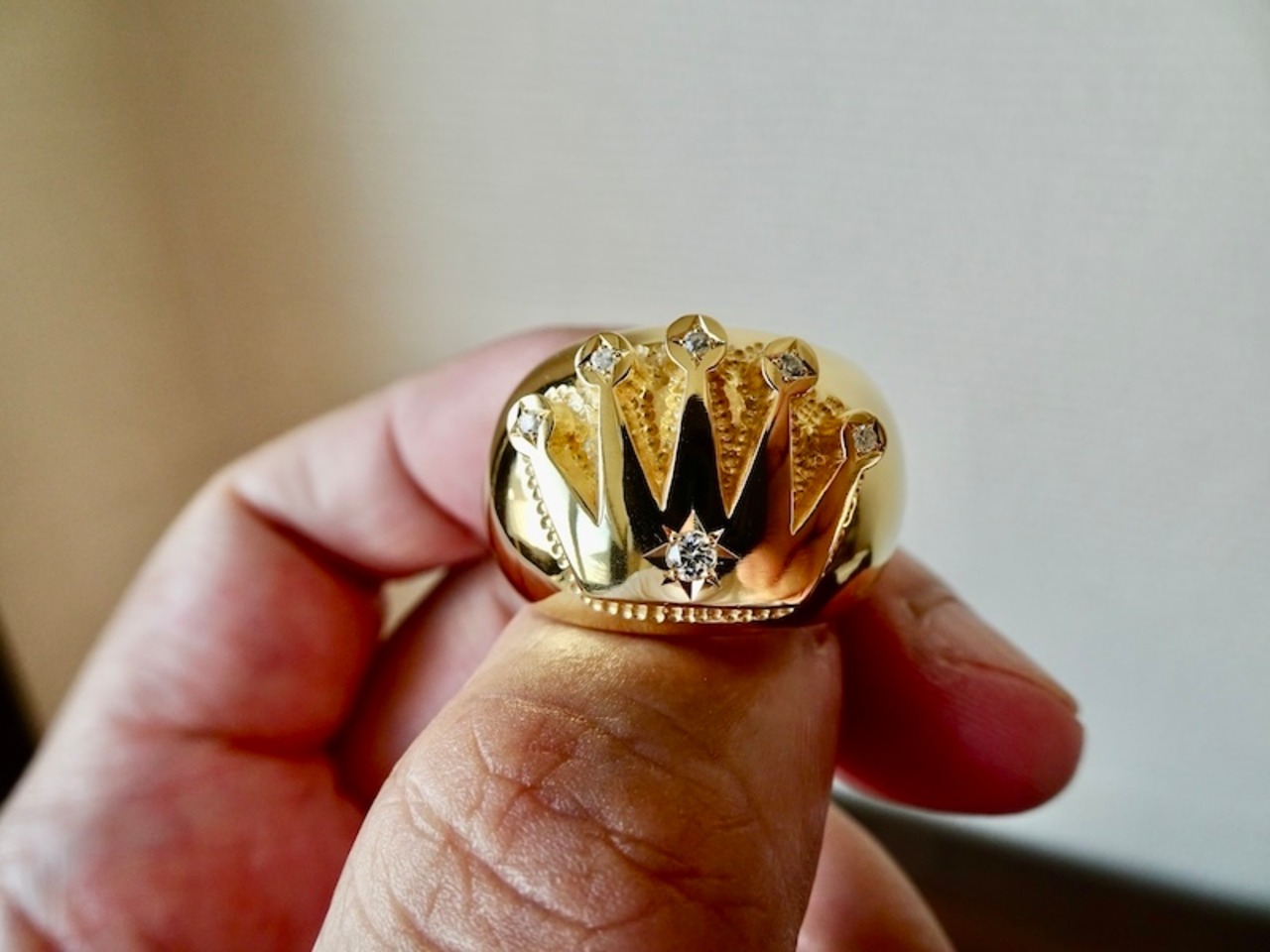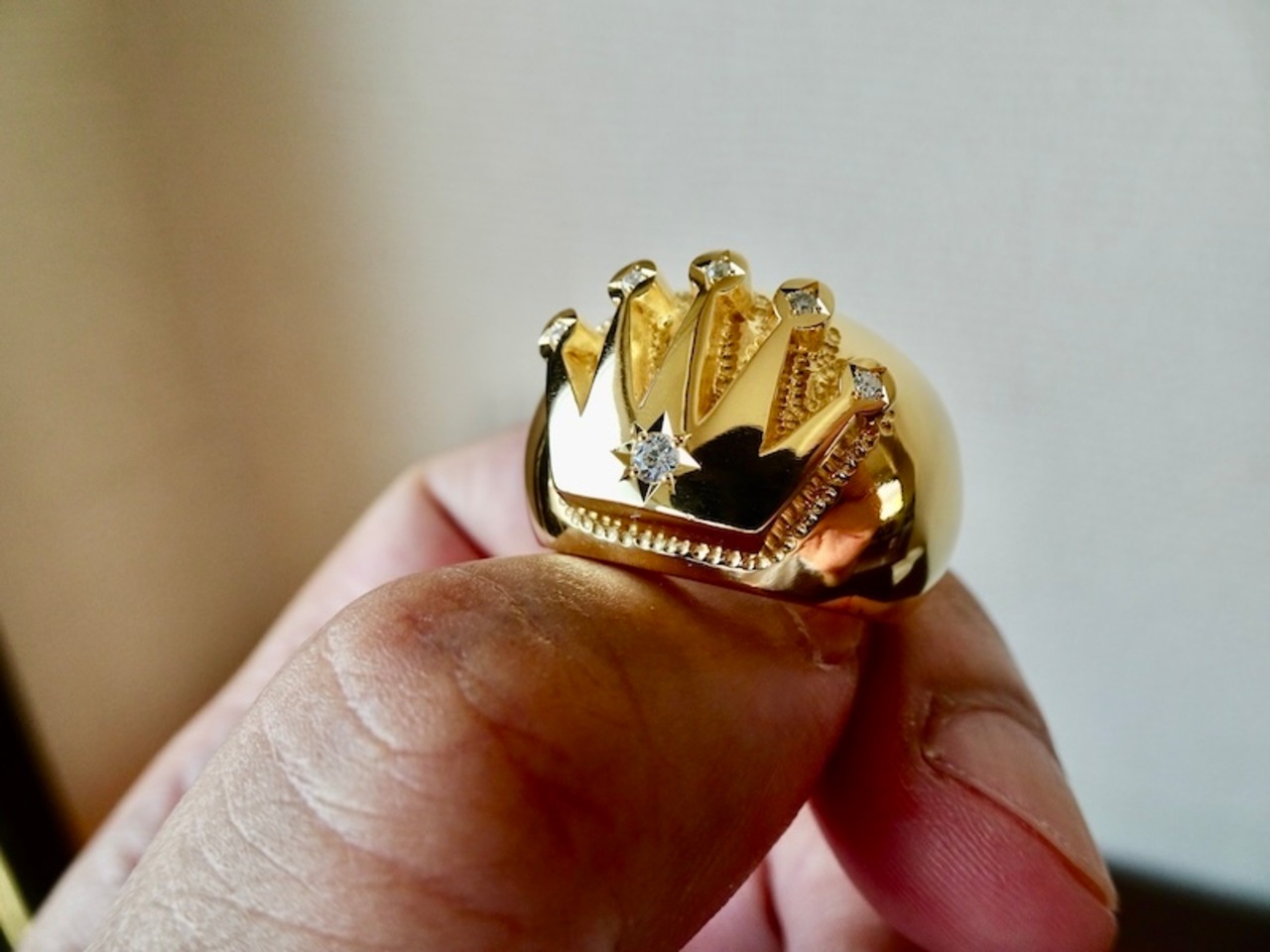 ごらん頂きありがとうございます。 オリジナルブランド 仁尾彫金『6つ星ダイヤ、k18ゴールド、クラウン甲丸リング』を出品致しますオリジナルのアクセサリーを自ら制作しています。今回、甲丸リングを制作致しました。そこに王冠モチーフを立体的に造形致しました。王冠の先に1.3mmのダイヤモンドを5石、クラウンの中央に2.3mmのダイヤモンドを1石埋め込みました。使用ダイヤは上級クラスなので無色透明で照り輝きも最高です。最大幅は約1.6cm強、最大厚みは約7mm弱です。全てk18の塊で重量も金を約34gとずっしりとしっかりとした作りになっています。全て金の塊なので永久にゴールドに輝き続けます。オリジナリティを追求しデザイン、制作を私自身で行っている為、今回、新品をご用意致します!!