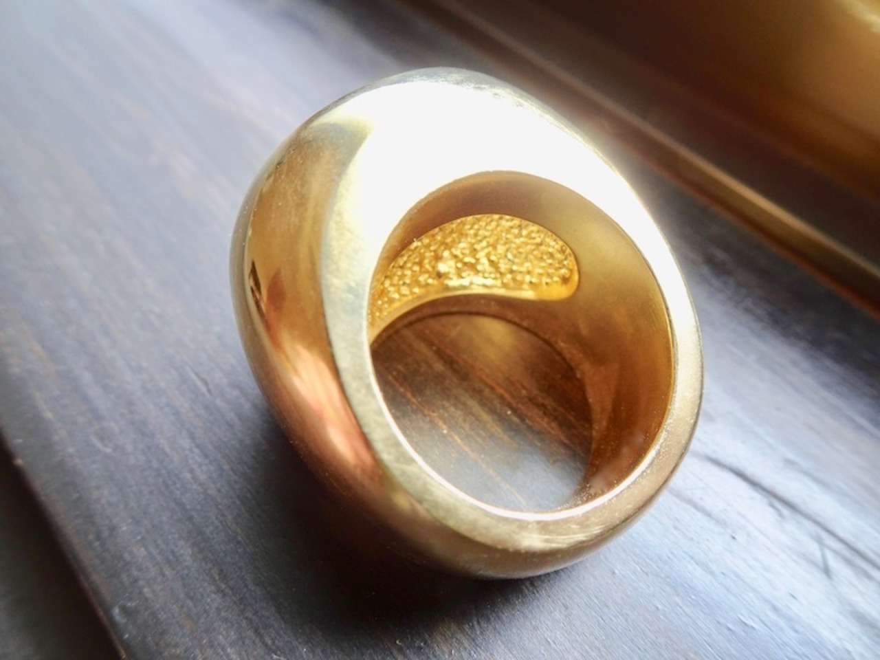 ごらん頂きありがとうございます。 オリジナルブランド 仁尾彫金『ゴールドナンバー9リング』を出品致します。オリジナルのアクセサリーを自ら制作しています。今回 、幅2.3cm強、厚み9ミリ弱の9をモチーフに印台リングを制作致しました。印台面はつや消ししています。全て金の塊でk18を約103gと圧倒的な重量感です。全て金の塊なので永久にゴールドに輝き続けます!オリジナリティを追求しデザイン、制作を私自身で行って為、今回、新品をご用意致します!!