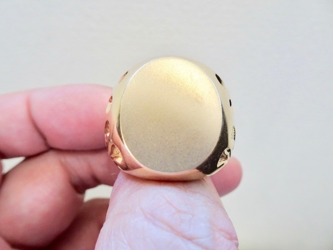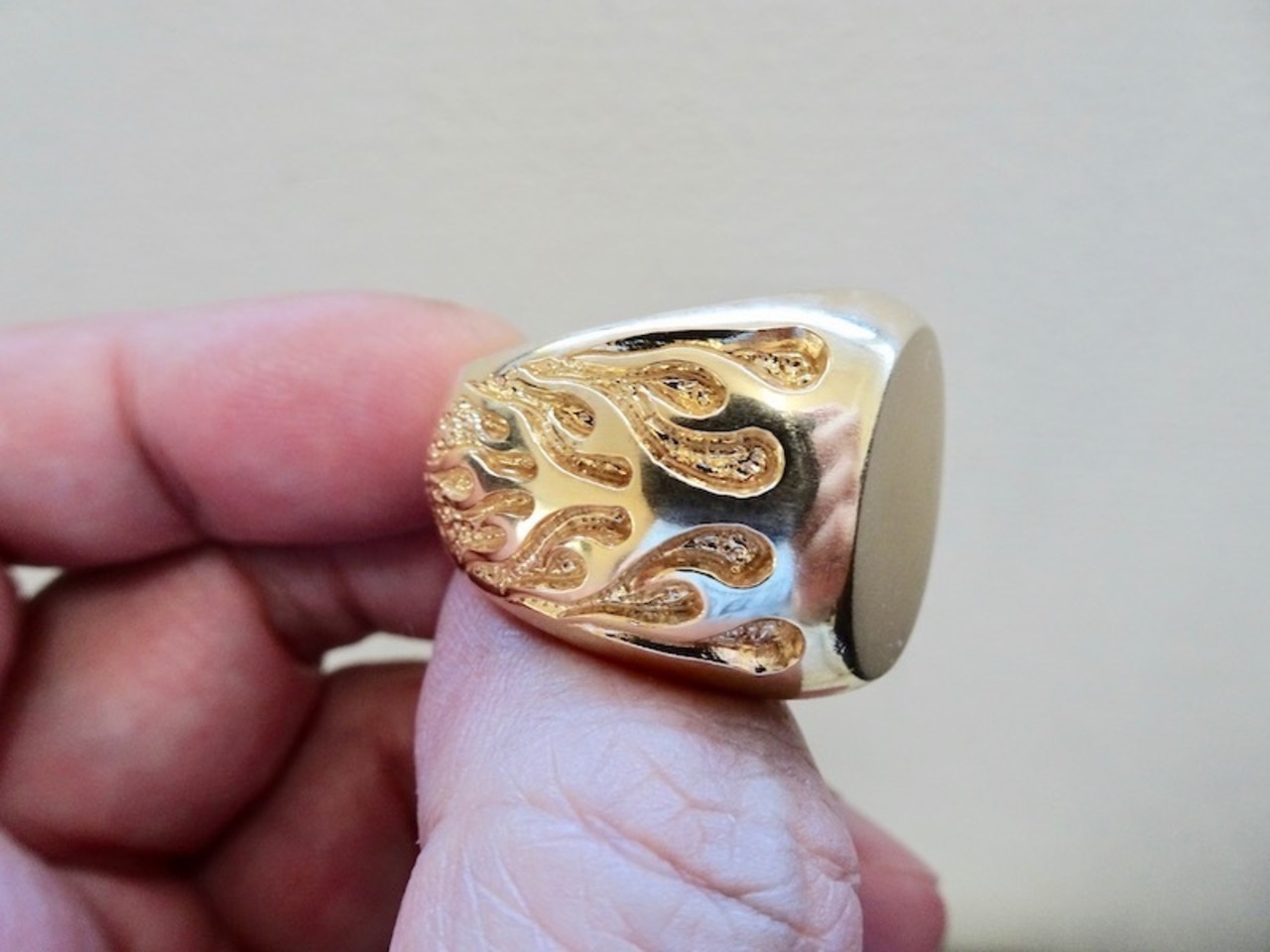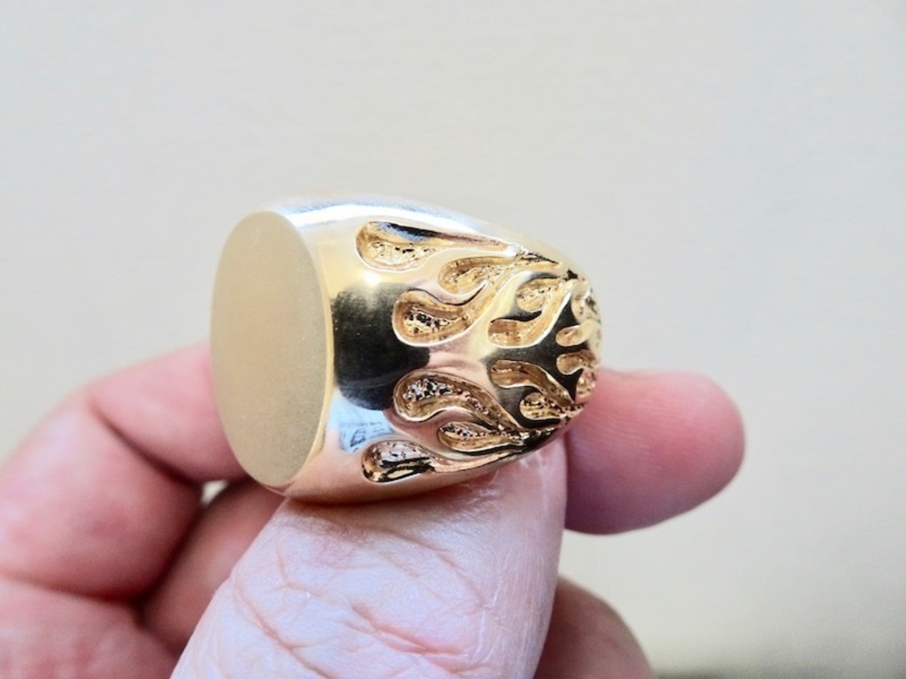 ごらん頂きありがとうございます。 オリジナルブランド 仁尾彫金『ゴールドファイヤーパターン楕円の印台リング』を出品致します。オリジナルのアクセサリーを自ら制作しています。今回、幅2.1cm強、厚み7mmのつや消し加工したシンプルな楕円の印台リングを制作致しました。そこに今回、両サイドにオリジナルのファイヤーパターンの造形を表現してみました。全て金の塊でK18を約69gズシリと大胆に使用しています!! 全て金の塊なので永久にゴールドに輝き続けます!!オリジナリティを追求しデザイン、制作を私自身で行っている為、今回、新品をご用意致します!!
