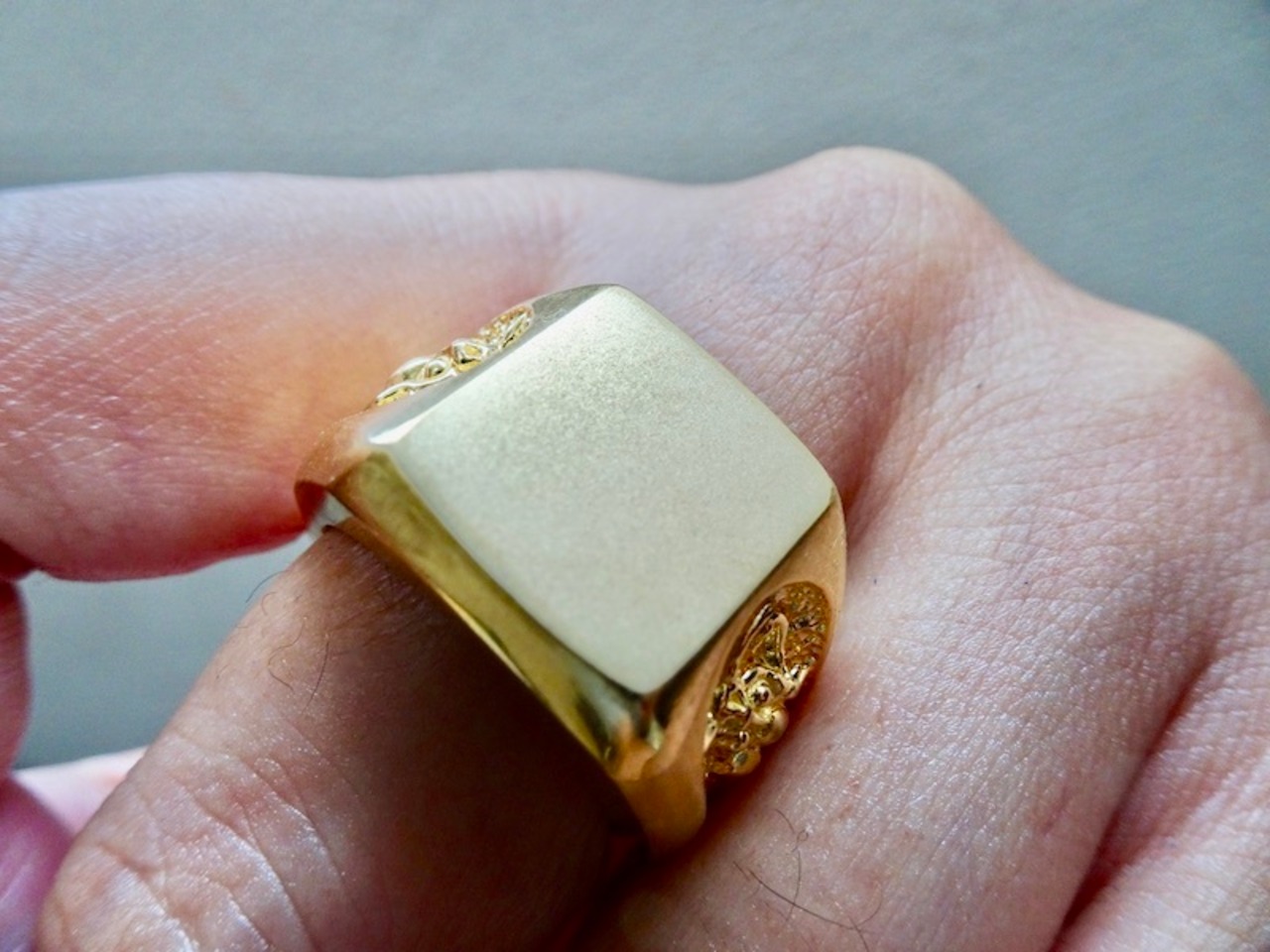 ごらん頂きありがとうございます。 オリジナルブランド 仁尾彫金『ゴールド双龍印台リング』を出品致します。縁起物のモチーフのアクセサリーをオリジナルで自ら制作しています。今回、幅1.6×のシンプルな印台リングの両サイドに、昔から出世の象徴とされる龍をオリジナル造形で立体的に表現致しました。印台部分はつや消し加工しています。重量も約45gと全てK18の塊で金を大胆に使用しています。全て金の塊なので永遠にゴールドに輝き続けます!!オリジナリティを追求しデザイン、制作を私自身で行っている為、今回、新品をご用意致します!!