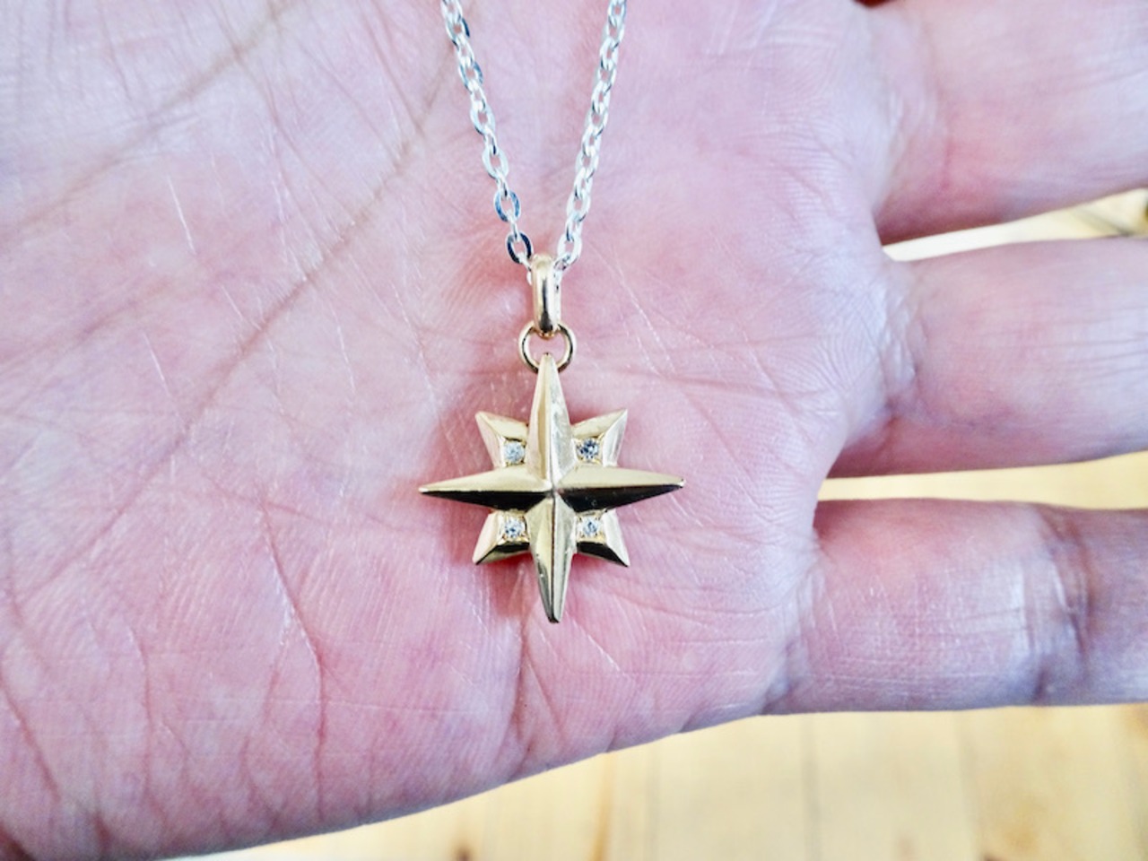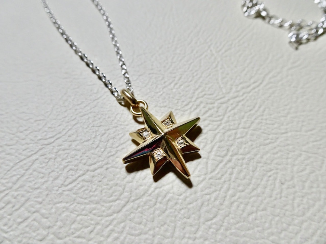 ごらん頂きありがとうございます。 オリジナルブランド仁尾彫金『ゴールドギャラクシーダイヤペンダント』を出品致します。 宇宙をテーマにしたアクセサリーをオリジナルで自ら制作しています。今回、バチカンを含めまして縦2.5cm、横1.8cm、最大厚み5mm弱の十字の星をイメージしたモチーフをデザイン致しました。そこに今回、十字部分に1.3mmの上級クラスの天然ダイヤ4石を堀留致しました。上級クラスのダイヤなので照り輝きは最高です!!!全てk18の塊なので永久にゴールドに輝き続けます!!! オリジナリティを追求しデザイン、制作を私自身で行っている為、今回新品をご用意致します!!ネックレス45cm(シルバー925小豆チェーン(40から45cmサイズ調節可)も付属致します。