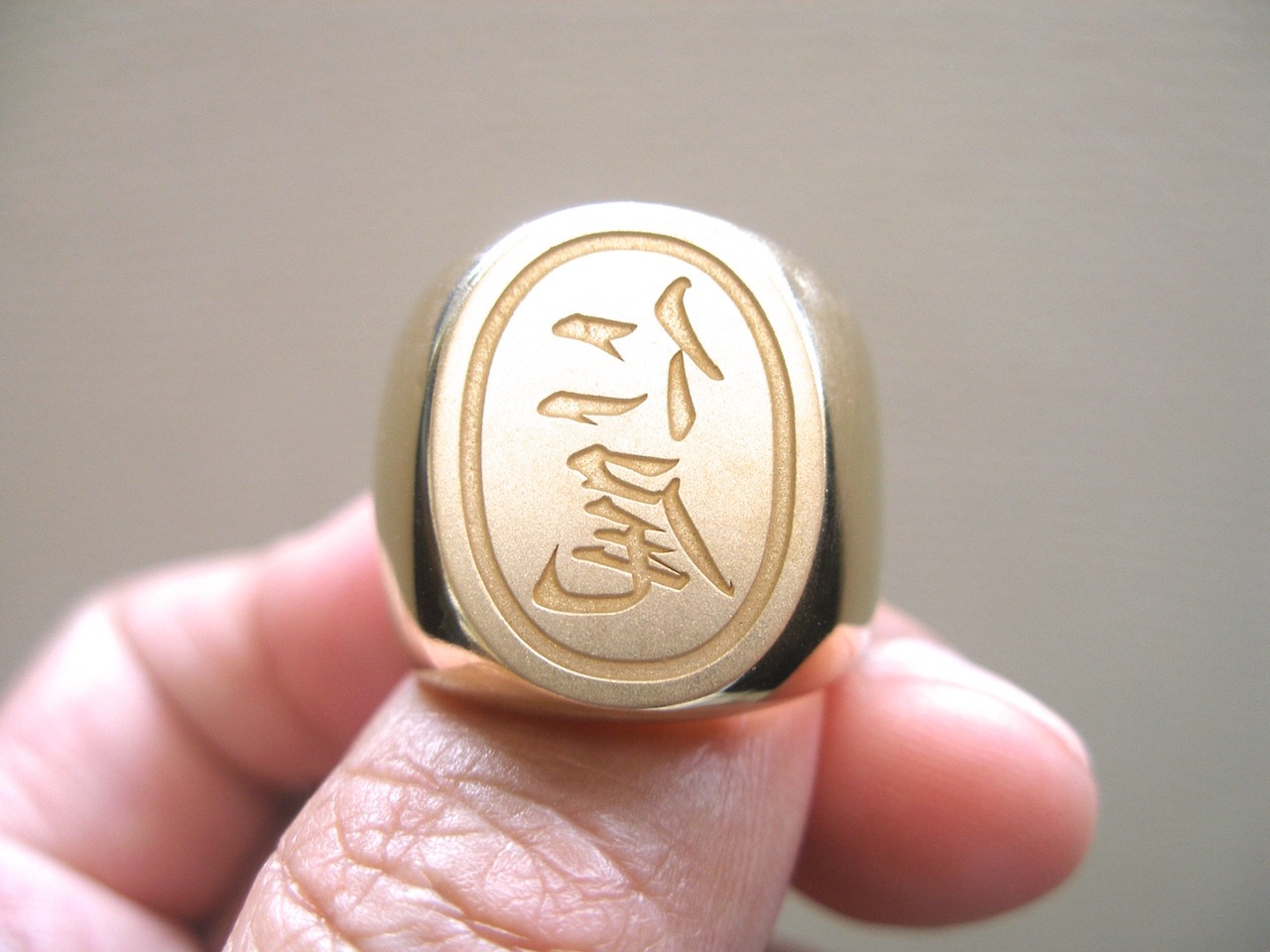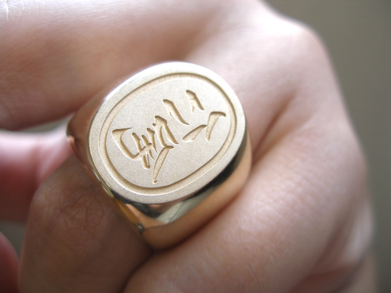 仁尾彫金『文字彫り楕円のゴールド印台リング』ハンドメイド147