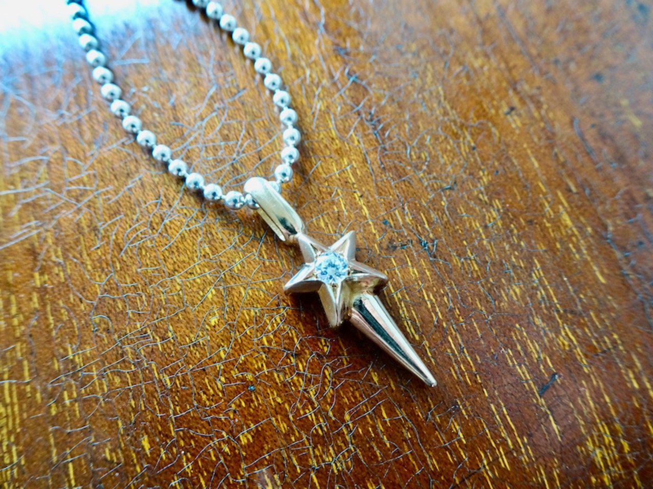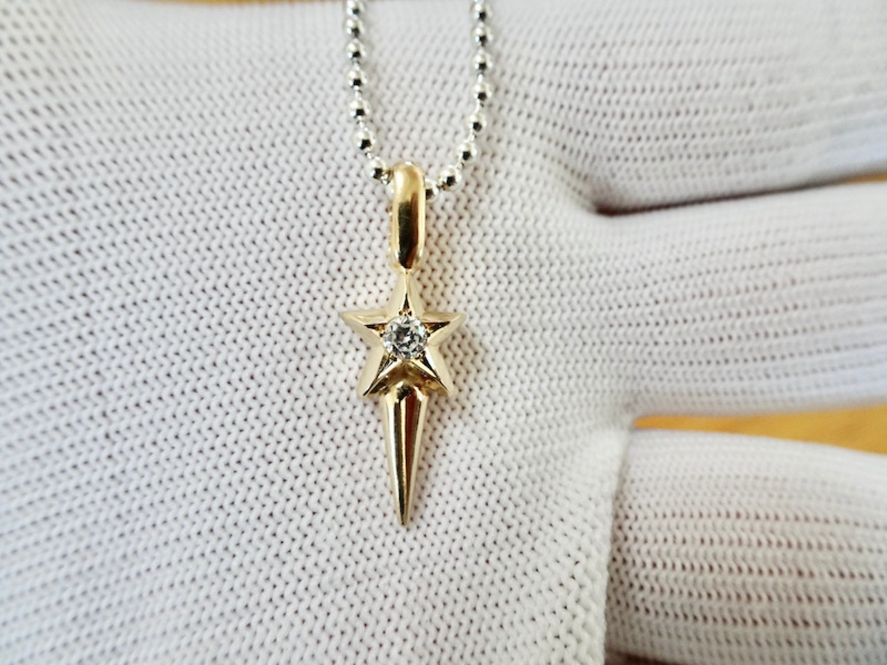 ごらん頂きありがとうございます。 オリジナルブランド 仁尾彫金『一つ星ダイヤ、ゴールドスタースパイク』を出品致します。オリジナルのアクセサリーを自ら制作しています。今回、幅9.5ミリの星のモチーフにスパイクを付けて制作致しました。縦はバチカン、スパイクを含めまして2.7cmになります。最大厚みは5ミリあります。そこに今回、光輝く星をイメージして上品質の3ミリ天然ダイヤを1石堀留しました。使用ダイヤは上品質なので無色透明で照り輝きは最上級です!!全て金の塊なので永久にゴールドに輝き続け輝く星をイメージしたダイヤも永久に輝き続けます!!デザイン、制作を私自身で行っている為、今回、新品をご用意致します!! シルバー925ボールチェーン45cm(40から45cmサイズ調節可)も付属致します。