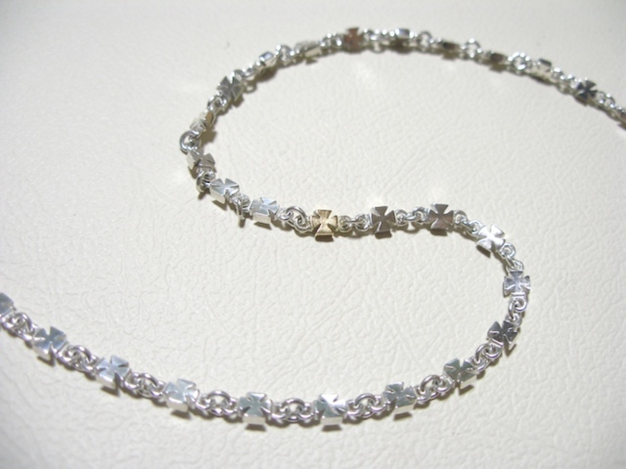 ごらん頂きありがとうございます。 オリジナルブランド 仁尾彫金『アイアンクロスネックレスチェーン60cm』を出品致します。オリジナルのアクセサリーを自ら制作しています。今回、 幅4ミリ、厚み1.6ミリのアイアンクロスモチーフパーツを62ピース繋げてネックレスチェーンを制作致しました。今回1ピースだけ8時の方向にK18のアイアンクロスパーツを使用しました。 通常、市販のネックレスチェーンは全て機械で自動制作していますが、こちらの作品は全て私自身の手作業でパーツ接続し1つ1つ丁寧に磨き仕上げしていますので非常に手間がかかっています!!デザイン、制作を私自身で行っている為、今回、新品をご用意致します!!長さは60cmでございます。