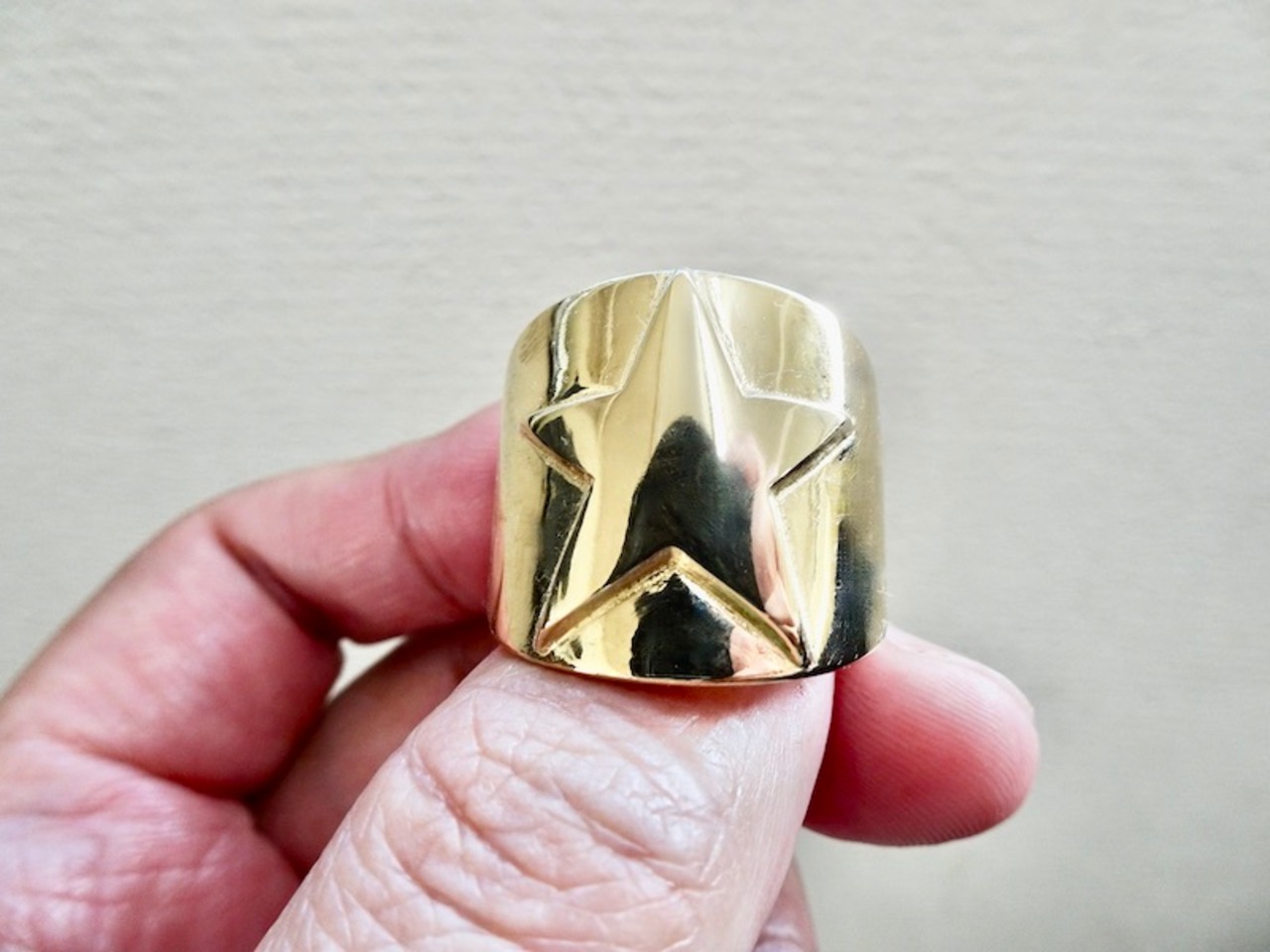 ごらん頂きありがとうございます。 オリジナルブランド仁尾彫金『ゴールドスターリング磨き』を出品致します。オリジナルのアクセサリーを制作しています。今回、最大幅2.3cm厚み5mm弱の星のモチーフのリングを制作致しました。星モチーフの部分も磨いています。リングの厚みも2.5mmあり全てk18 の塊で重量も約45gと金を大胆に使用しています!!全て金の塊なので永久にゴールドに輝き続けます!!オリジナリティを追求しデザイン、制作を私自身で行って為、今回、新品をご用意致します!!