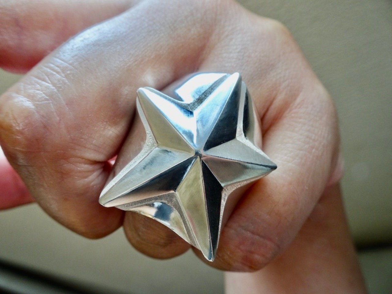 ごらん頂きありがとうございます。 オリジナルブランド仁尾彫金『ビッグスターリング』を出品致します。宇宙をテーマにしたアクセサリーをオリジナルで自ら制作しています。今回、最大幅3.2cm最大厚み約1cmの立体的な星のモチーフのリングを制作致しました。リングの腹部分も幅1.7cm厚み3mmで非常に肉厚です。重量は約79gと圧倒的な重量感がありズシリとしっかりとした作りになっています!!シルバーなので使い込むと味が出てきます。オリジナリティを追求しデザイン、制作を私自身で行って為、今回、新品をご用意致します!!