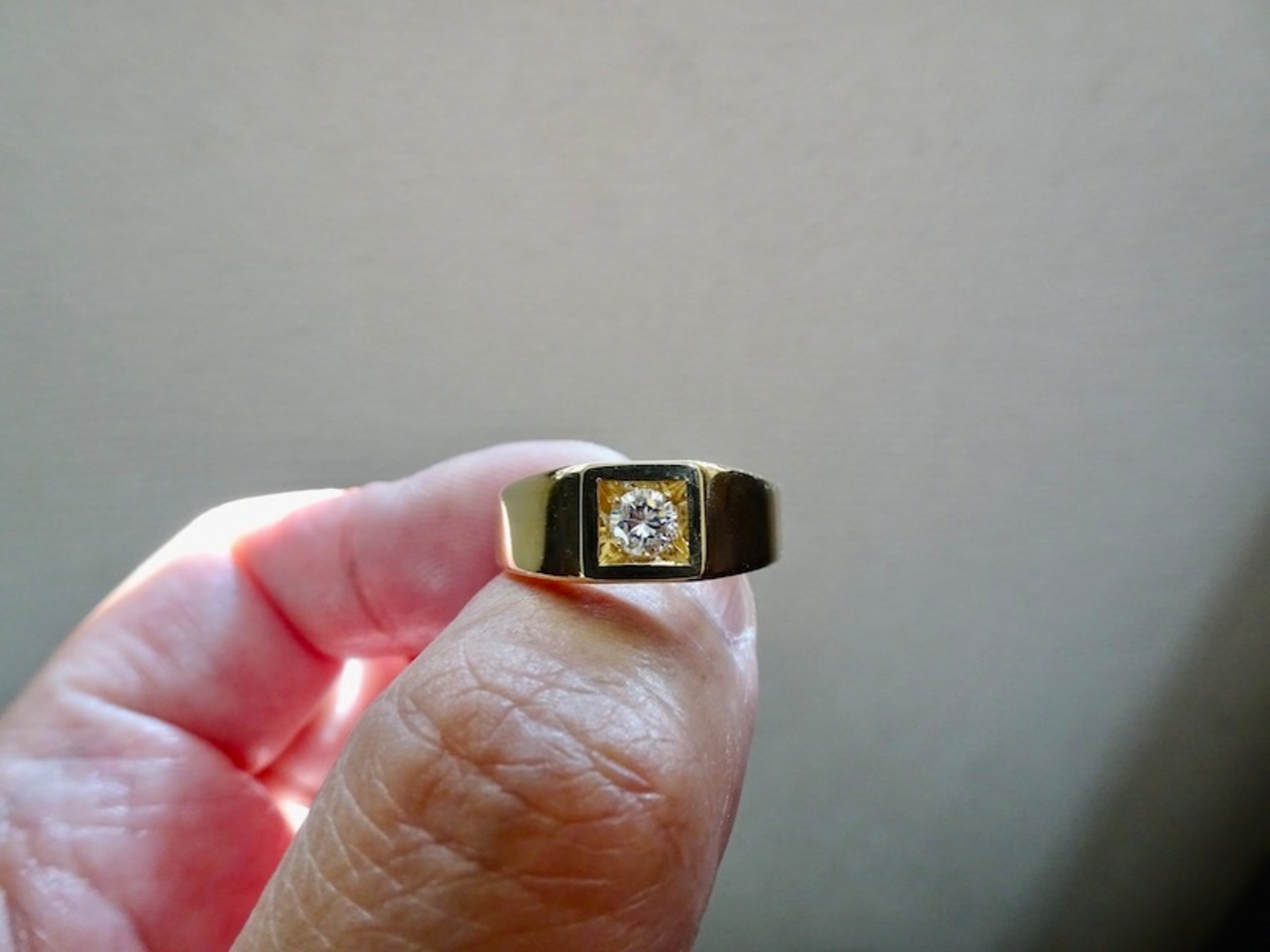 ごらん頂きありがとうございます。 オリジナルブランド 仁尾彫金『一つ星ジルコニア、マス留めゴールドリング』を出品致します。オリジナルのアクセサリーを自ら制作しています。今回、幅7ミリ強、厚み4ミリの印台リングに4ミリのジルコニアをマス留め致しました。 k18の使用重量も約15gと全て金の塊なので永久にゴールドに輝き続けます。 デザイン制作を私自身で行っている為、今回、新品をご用意致します!!