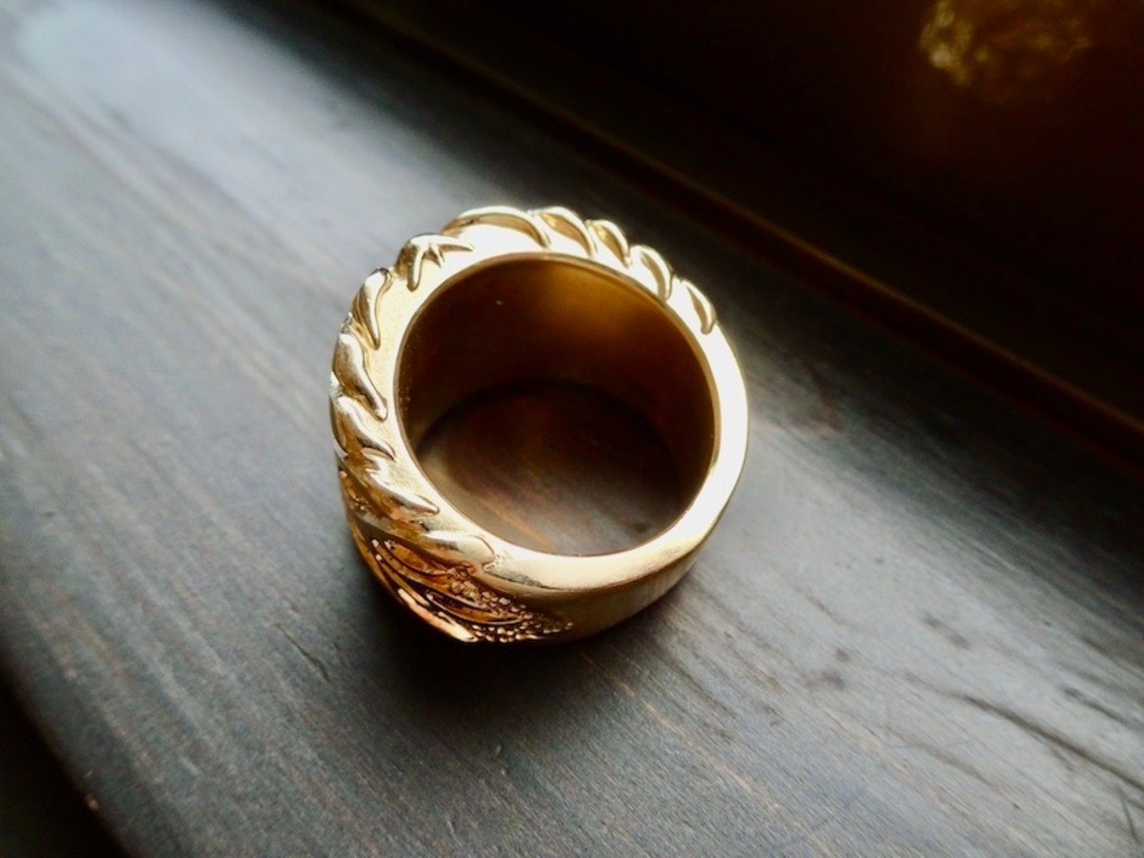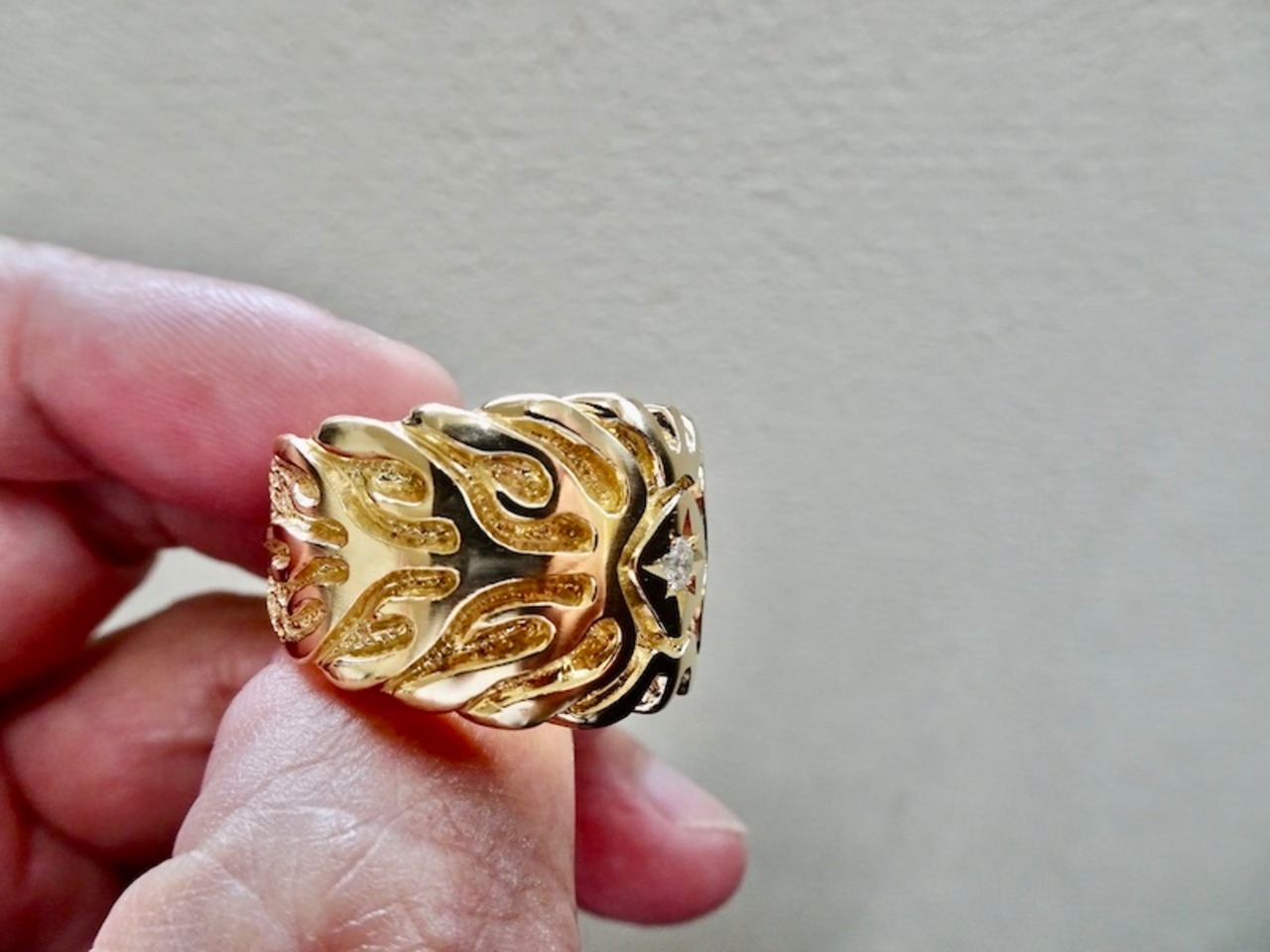 ごらん頂きありがとうございます。 オリジナルブランド 仁尾彫金『一つ星3mmダイヤ、ゴールドファイヤーパターン、リング』を出品致します。オリジナルのアクセサリーを自ら制作しています。今回、最大幅1.7cmのリングにファイヤーパターンのモチーフを表現したリングを制作致しました。 そこに今回、輝く一つ星をイメージして3ミリの上級クラス天然ダイヤを1石堀留しました。ダイヤは上級クラスなので無色透明で照り輝きは最高です!!最大厚みは5ミリ強と肉厚、全てk18の塊でk18を約40gと金を大胆にを使用しています!!全て金の塊なので永久にゴールドに輝き続けます!!デザイン制作を私自身で行っている為、今回、新品をご用意致します!!