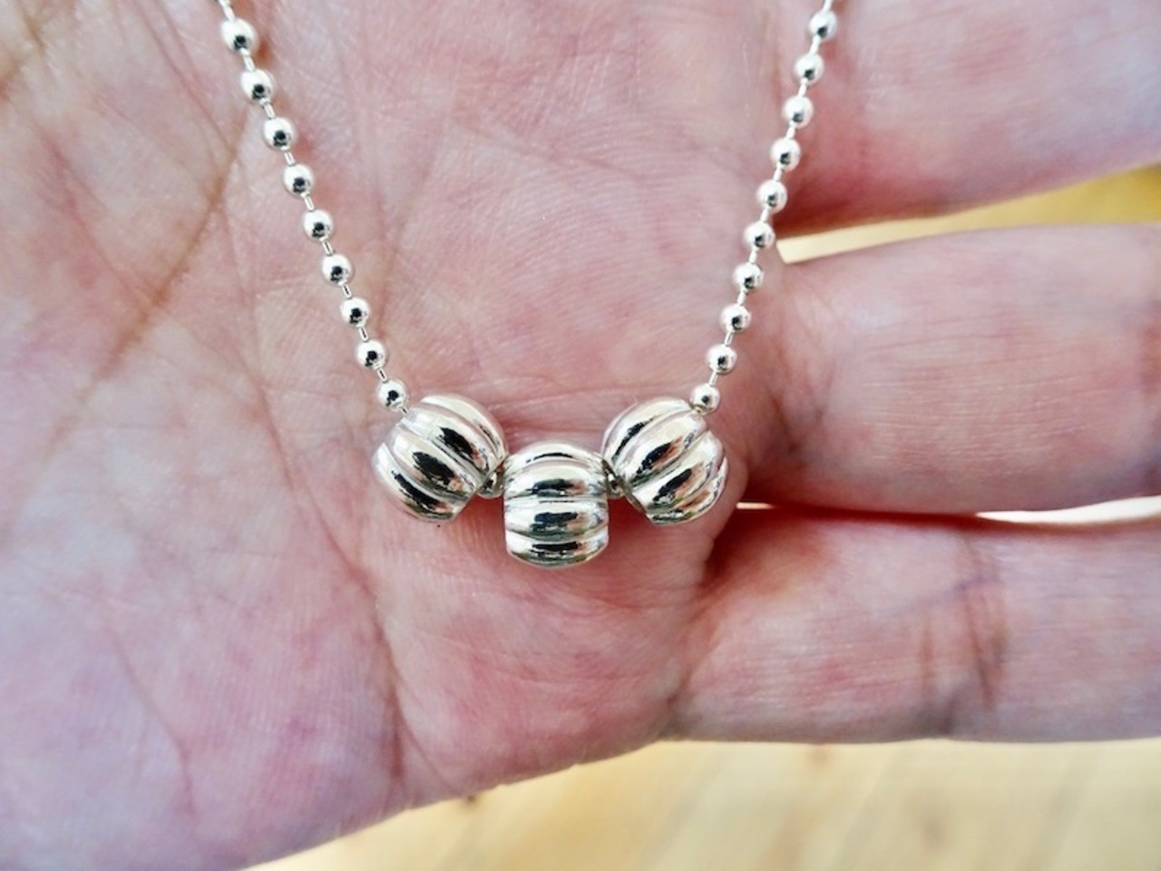 ごらん頂きありがとうございます。 オリジナルブランド 仁尾彫金『プラチナ、みかん玉ネックレス3ピース』を出品致します。オリジナルのアクセサリーを自ら制作しています。今回、 大きさ約8ミリ、幅6ミリの、みかん玉を造形しチェーンに通しました。みかん玉3つになります。全てプラチナの塊なので変色する事はありません。デザイン、制作を私自身で行っている為、今回、新品をご用意致します!!ネックレス50cm(シルバー925ボールチェーン(45から50cmサイズ調節可)も付属致します。
