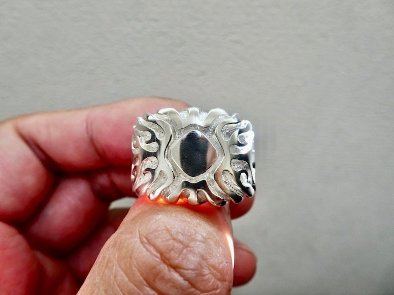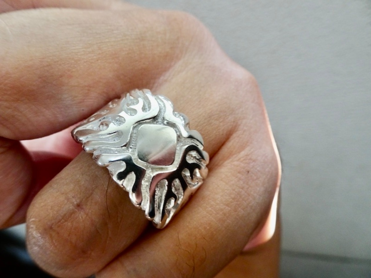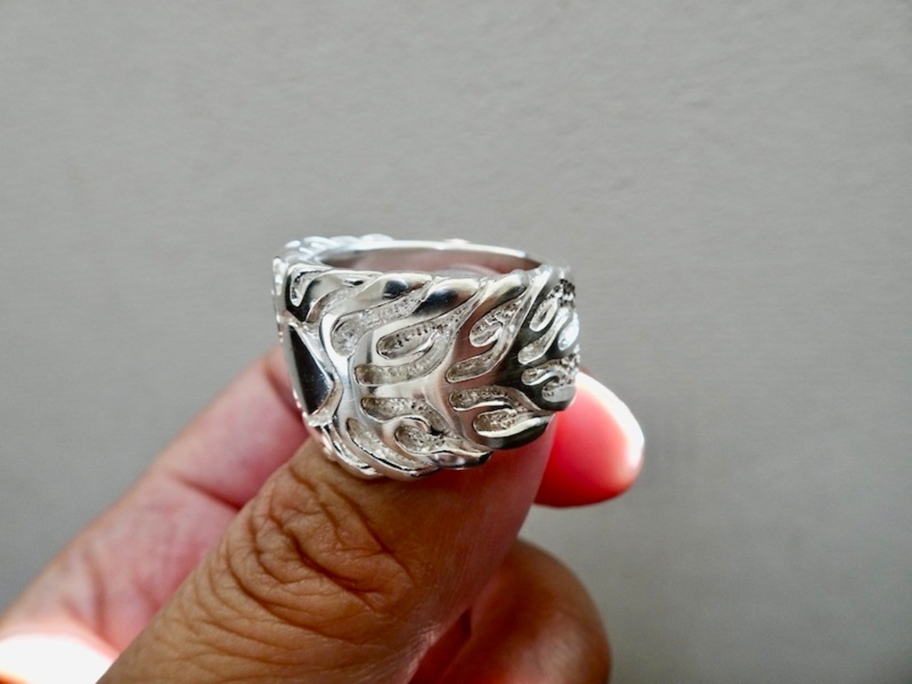 ごらん頂きありがとうございます。 オリジナルブランド 仁尾彫金『ファイヤーパターン、プラチナリング』を出品致します。オリジナルのアクセサリーを自ら制作しています。今回、最大幅1.7cmのリングにファイヤーパターンのモチーフを表現したリングを制作致しました。 全てプラチナ900の塊で最大厚みは5ミリ強と肉厚でプラチナを約53gと大胆に使用しています!!デザイン制作を私自身で行っている為、今回、新品をご用意致します!!