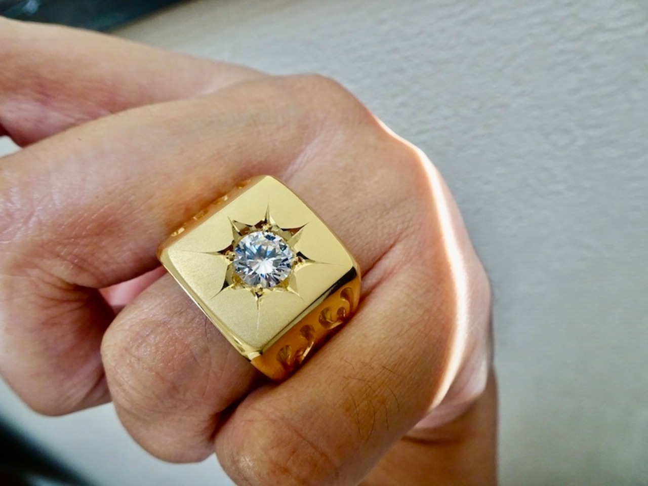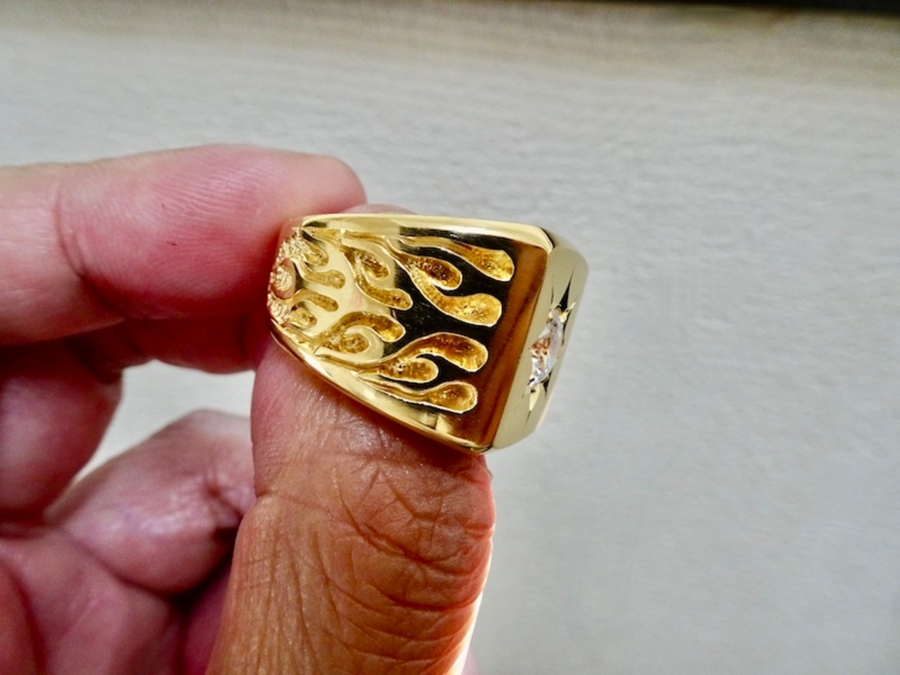 ごらん頂きありがとうございます。 オリジナルブランド 仁尾彫金『一つ星ジルコニア、ファイヤーパターン、ゴールド印台リング』を出品致します。 オリジナルのアクセサリーを自ら制作しています。今回、ファイヤーパターンモチーフをシンプルな印台リングの両サイドに造形致しました。印台面は艶消し処理をしています。そこに今回、星の輝きをイメージして7mmのジルコニアを彫り留め致しました。リングの最大幅は1.9cm弱です。全てk18の絡まりで約52gとズシリと大胆に金を使用しています。全て金の塊なので永久にゴールドに輝き続けます!!デザイン、制作を私自身で行っている為、今回、新品をご用意致します!!