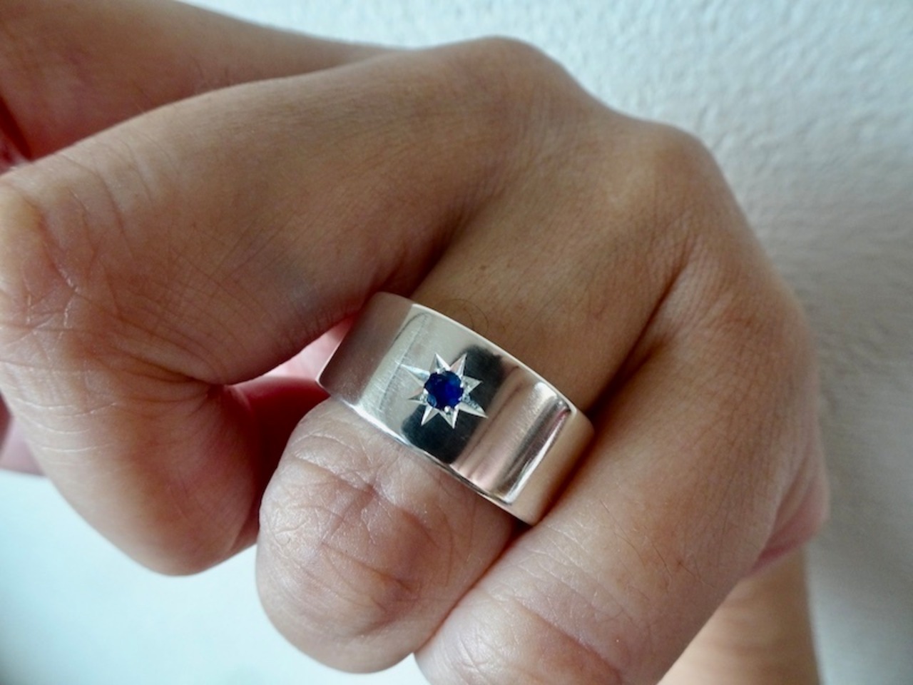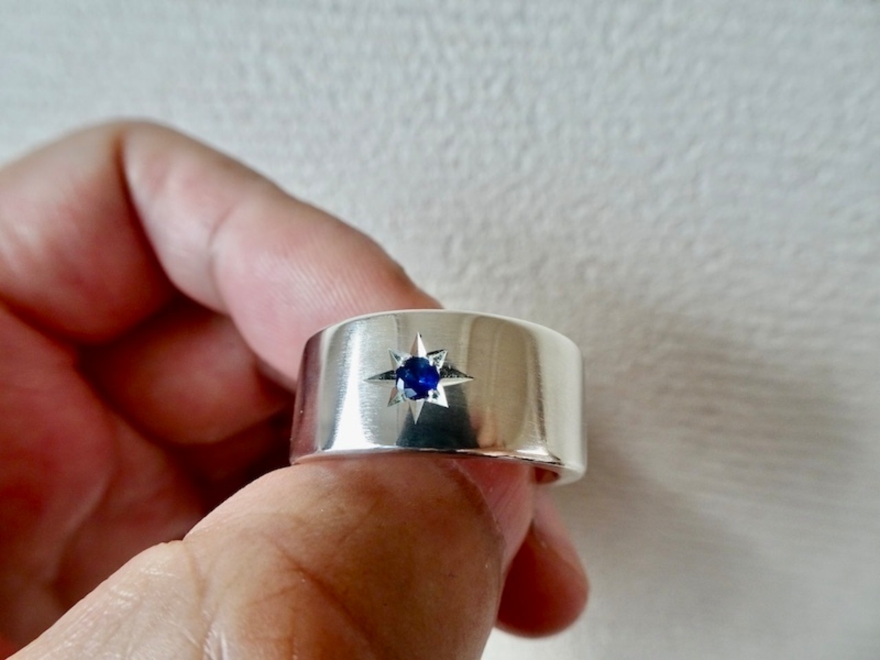 仁尾彫金『一つ星3mmサファイヤ、幅1cm、プラチナ平打リング』ハンドメイド271