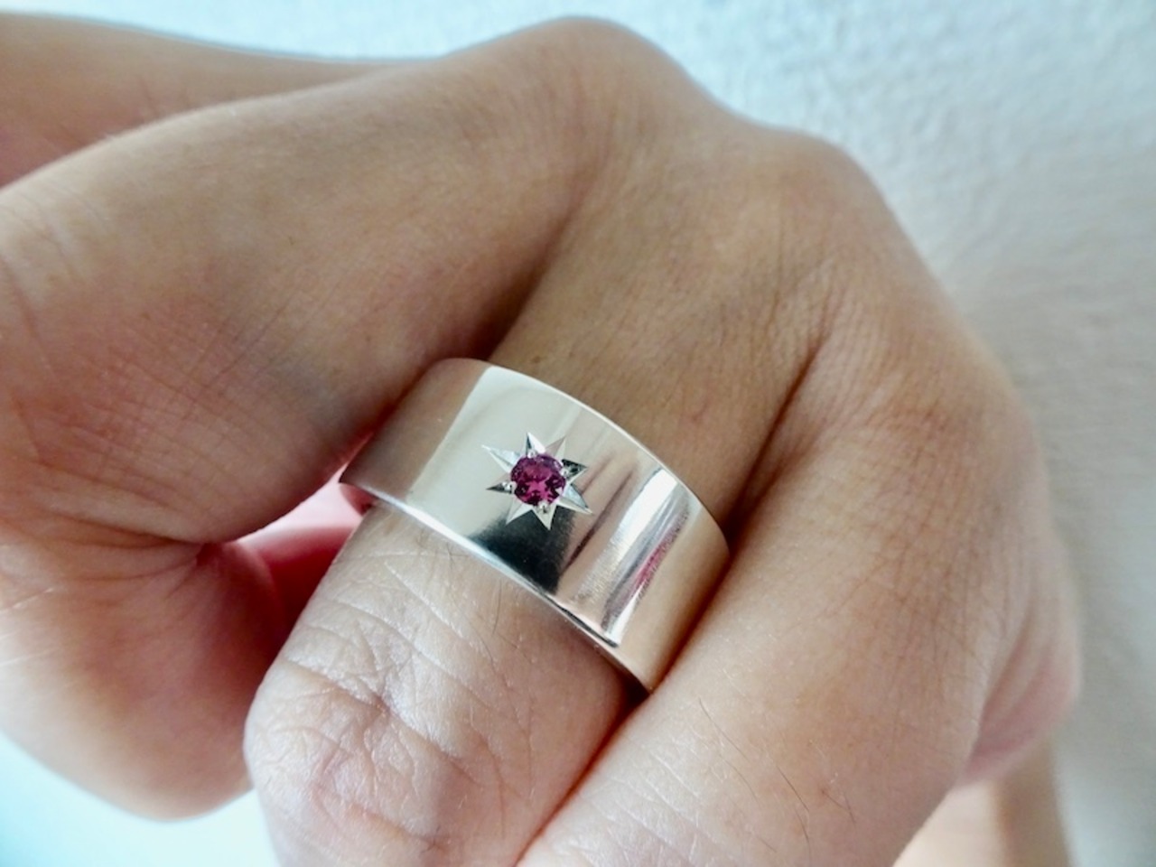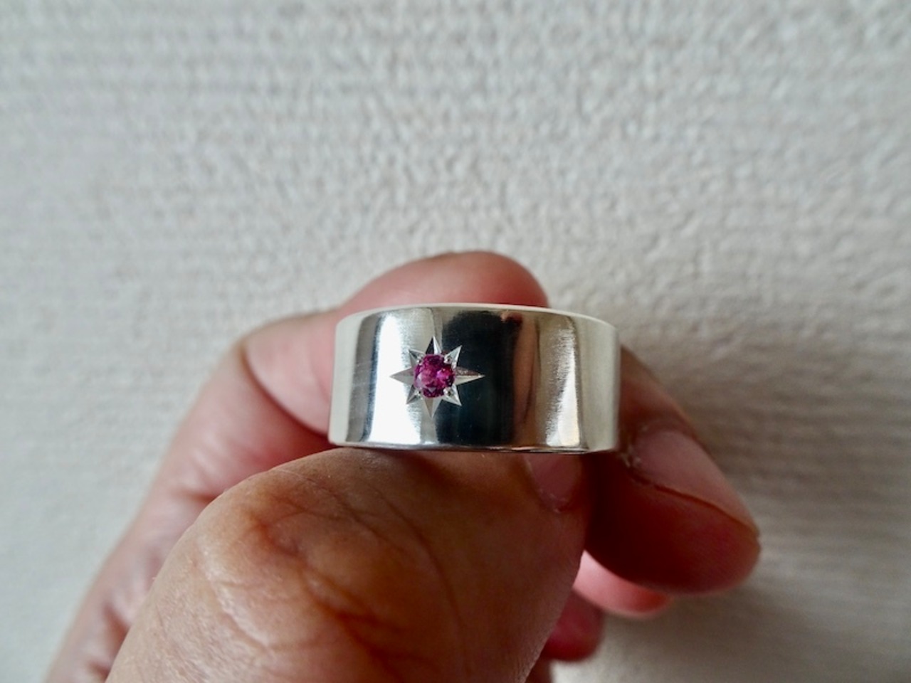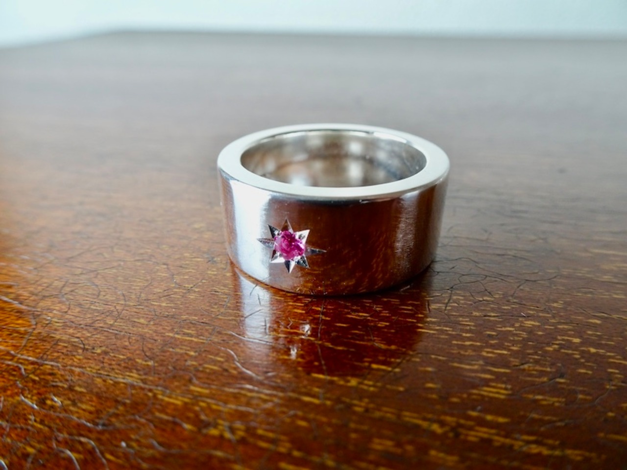 仁尾彫金『一つ星2.7mmピンクスピネル、幅1cm、プラチナ平打リング』ハンドメイド273