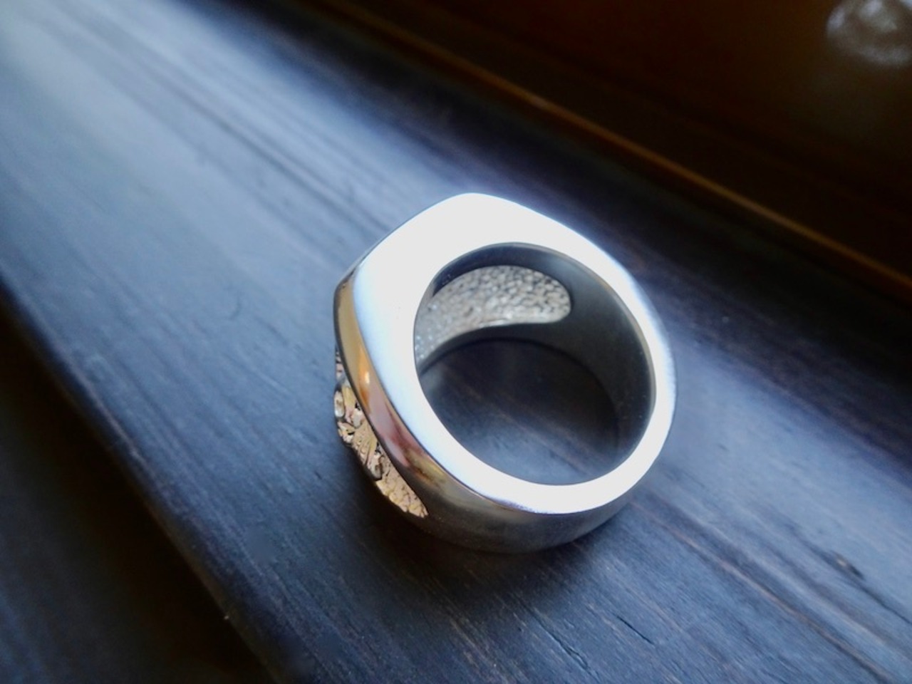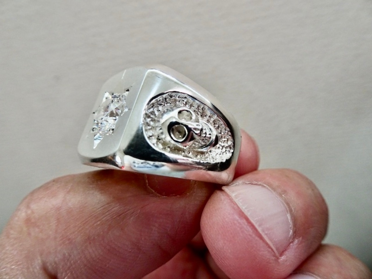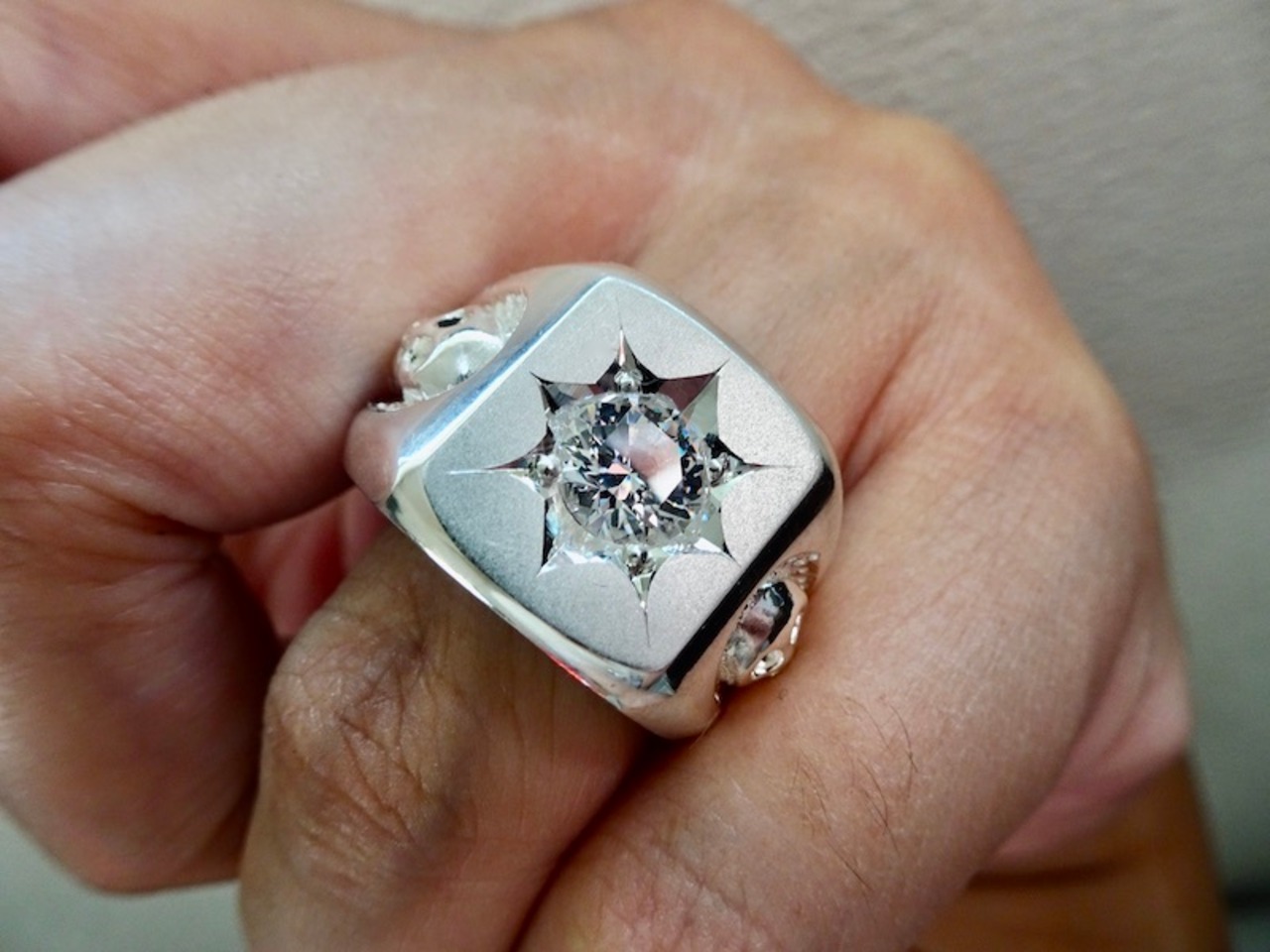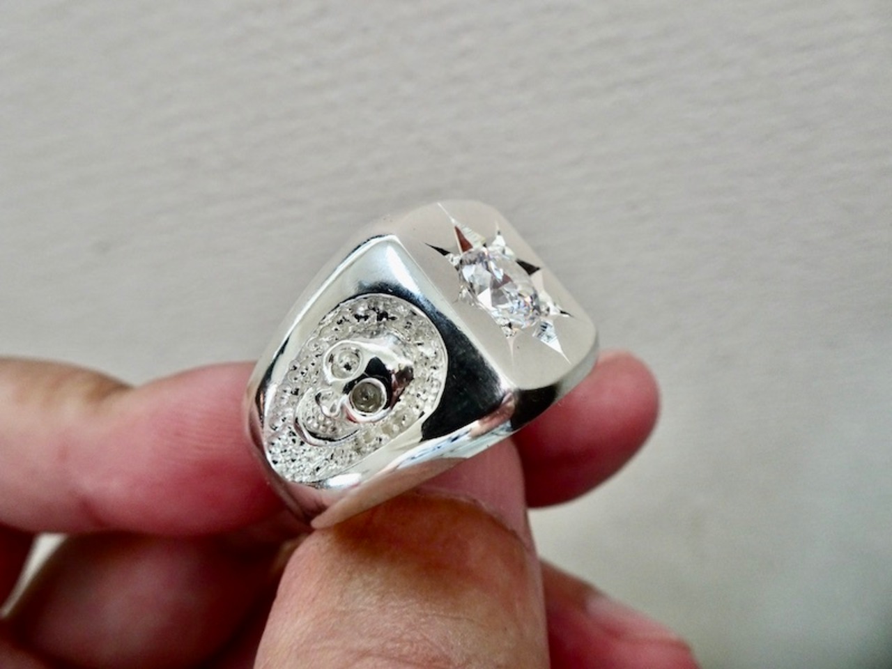 仁尾彫金『一つ星ジルコニア、プラチナ、ラッキースカル印台リング』ハンドメイド199