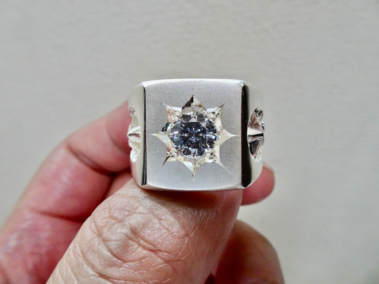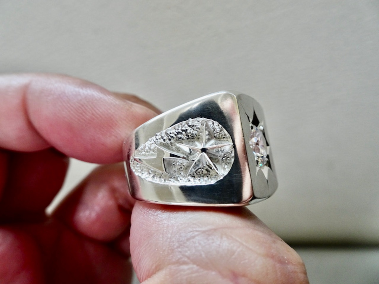 仁尾彫金『一つ星ジルコニア、プラチナ、星とサンダーの印台リング』ハンドメイド215