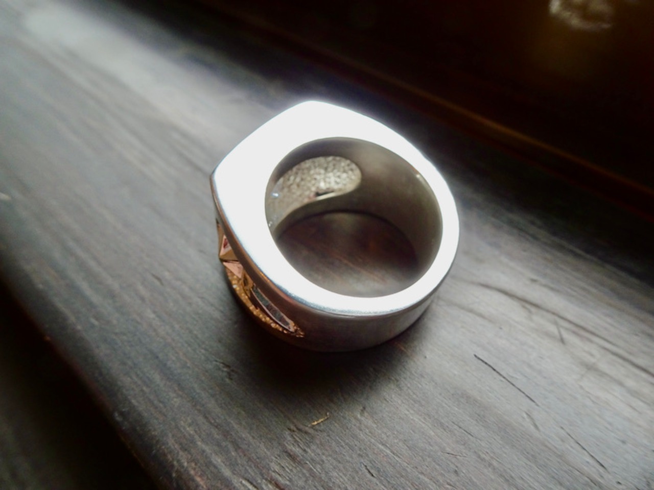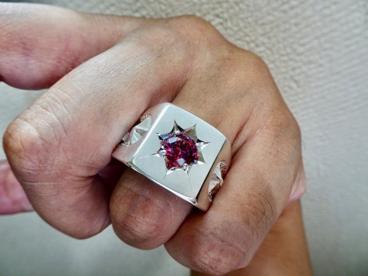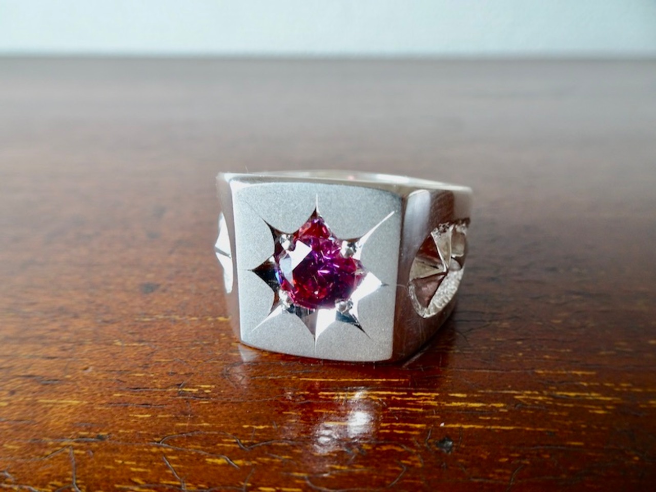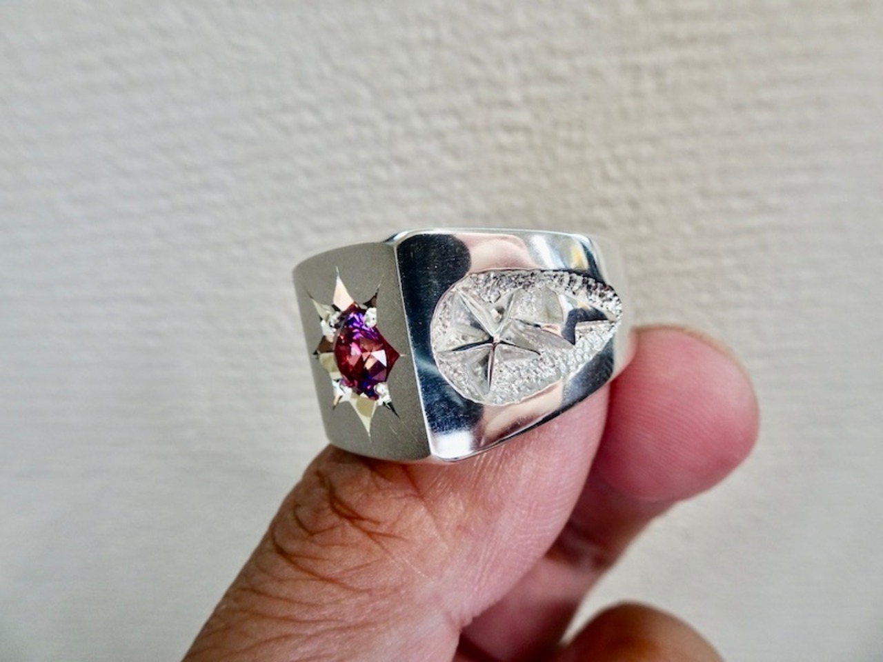 仁尾彫金『一つ星レッドジルコニア、プラチナ、星とサンダーの印台リング』ハンドメイド215