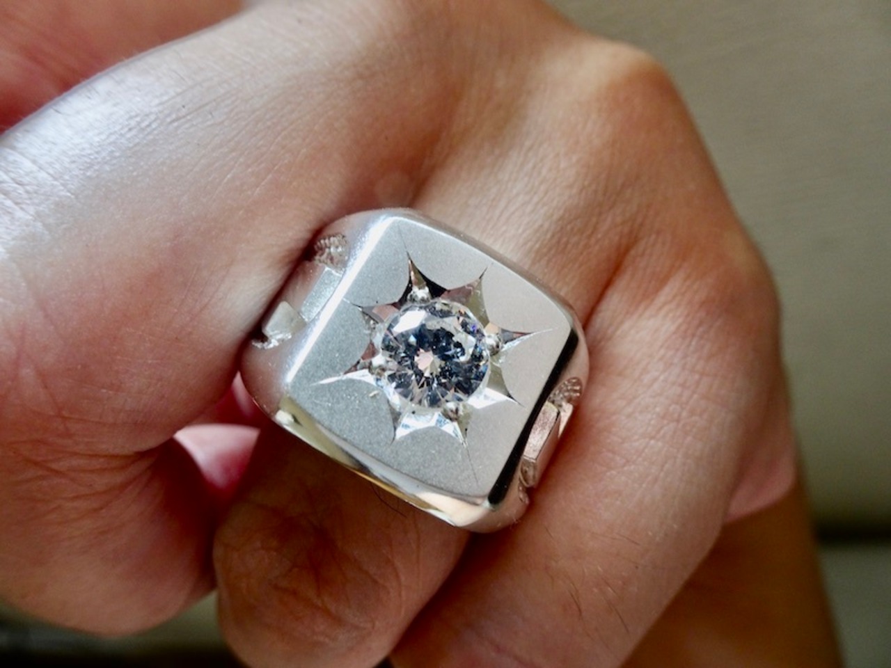 仁尾彫金『一つ星ジルコニア、プラチナ、サンダー印台リング』ハンドメイド191
