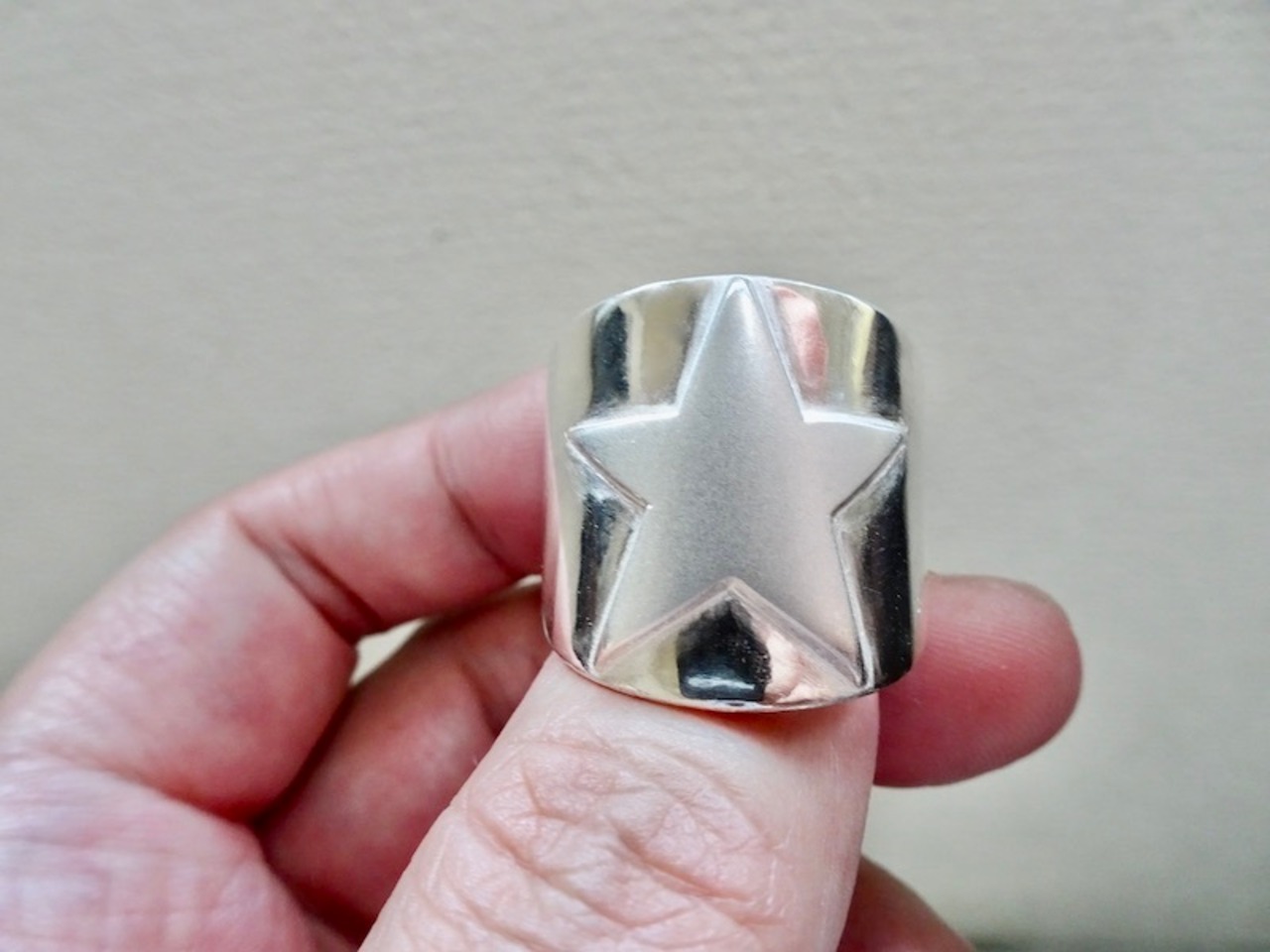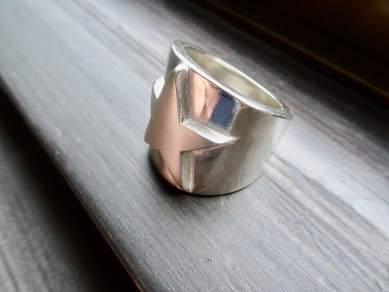 ごらん頂きありがとうございます。 オリジナルブランド仁尾彫金『プラチナ、スターリング』を出品致します。オリジナルのアクセサリーを制作しています。今回、最大幅2.3cm厚み5mm弱の星のモチーフのリングを制作致しました。星モチーフの部分は艶消し加工をしています。リングの厚みも2.5mmあります。全てプラチナの塊でプラチナ900を約62gとズッシリと大胆に使用しています!!オリジナリティを追求しデザイン、制作を私自身で行って為、今回、新品をご用意致します!!