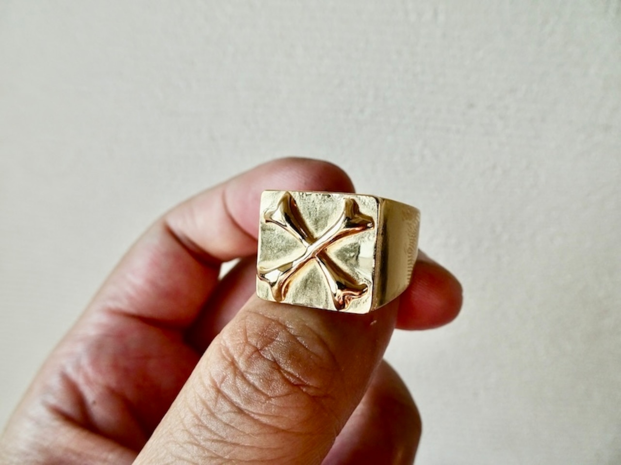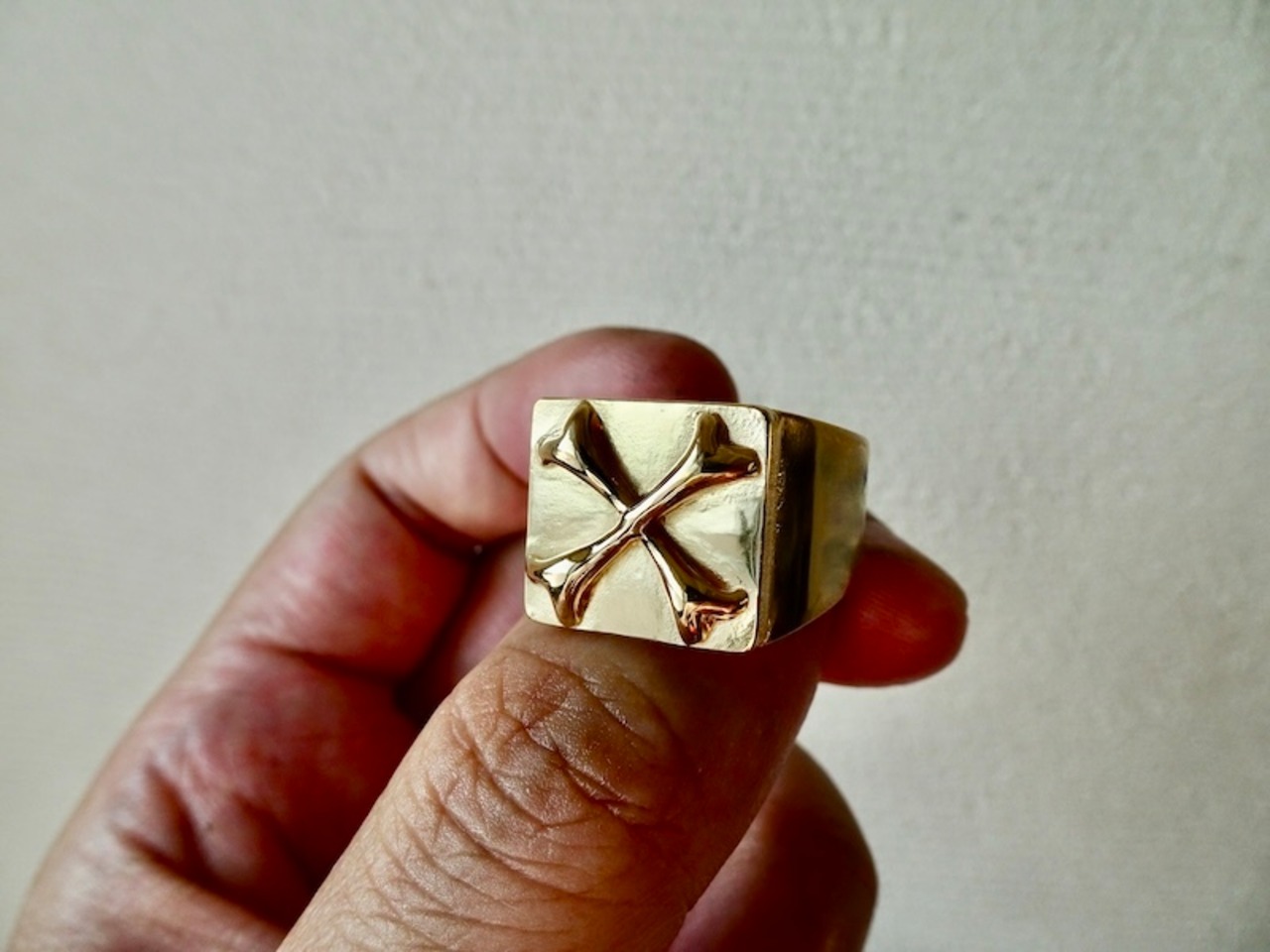 仁尾彫金『クロスボーンプレート、k18印台リング』ハンドメイド298