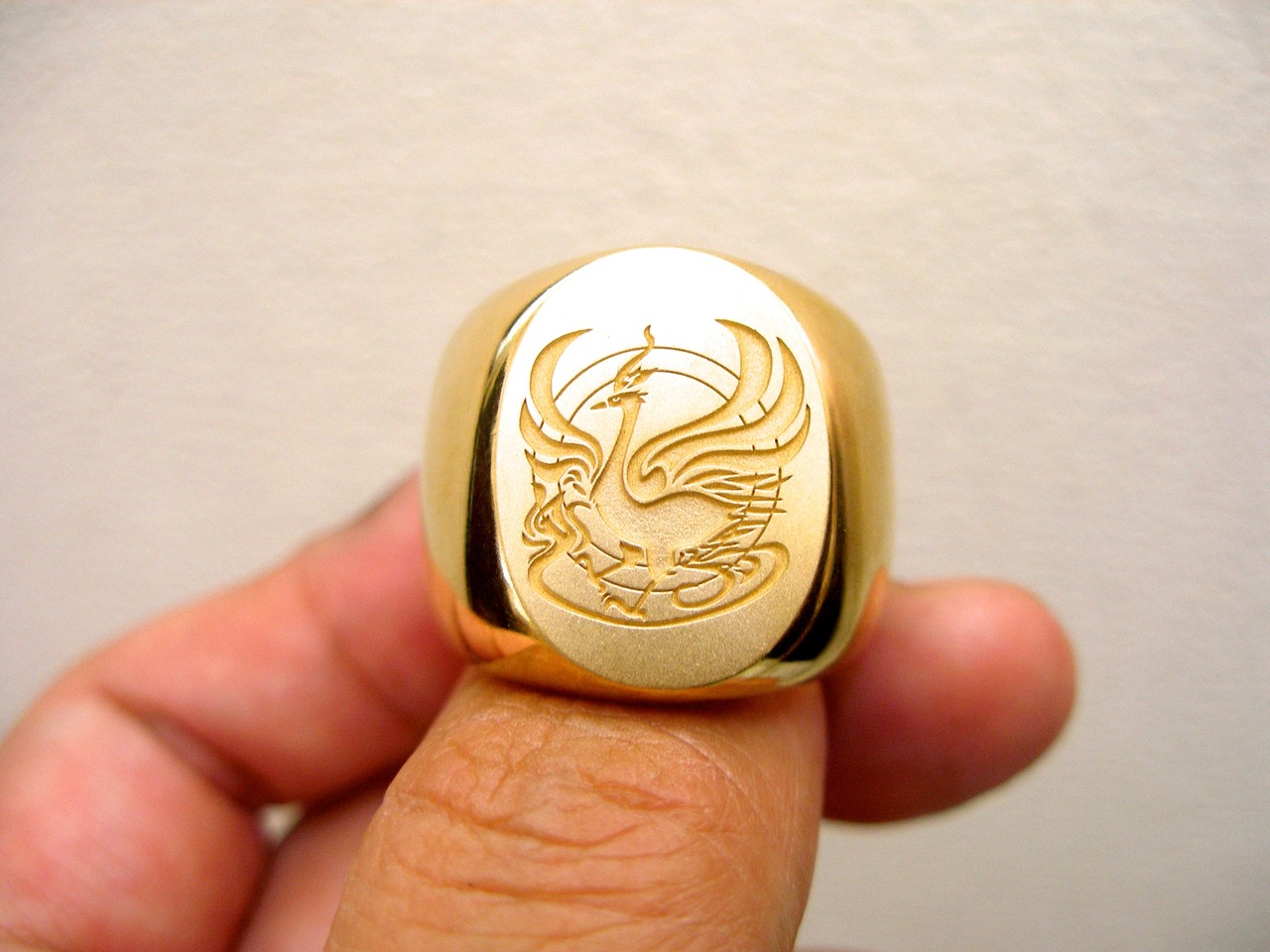 ごらん頂きありがとうございます。 オリジナルブランド 仁尾彫金『鳳凰のゴールド印台リング』を出品致します。オリジナルのアクセサリーを自ら制作しています。今回、幅2.2cmの楕円をつや消し加工したシンプルな印台リングに縁起物の鳳凰のモチーフをレーザー刻印致しました。重量も約52gと全てK18の塊で金をズッシリと大胆に使用しています。全て金の塊なので永久にゴールドに輝き続けます!! オリジナリティを追求しデザイン、制作を私自身で行っている為、今回、新品をご用意致します!!