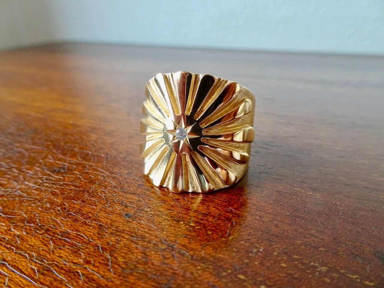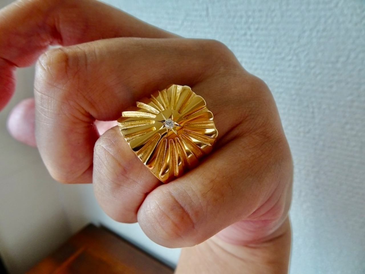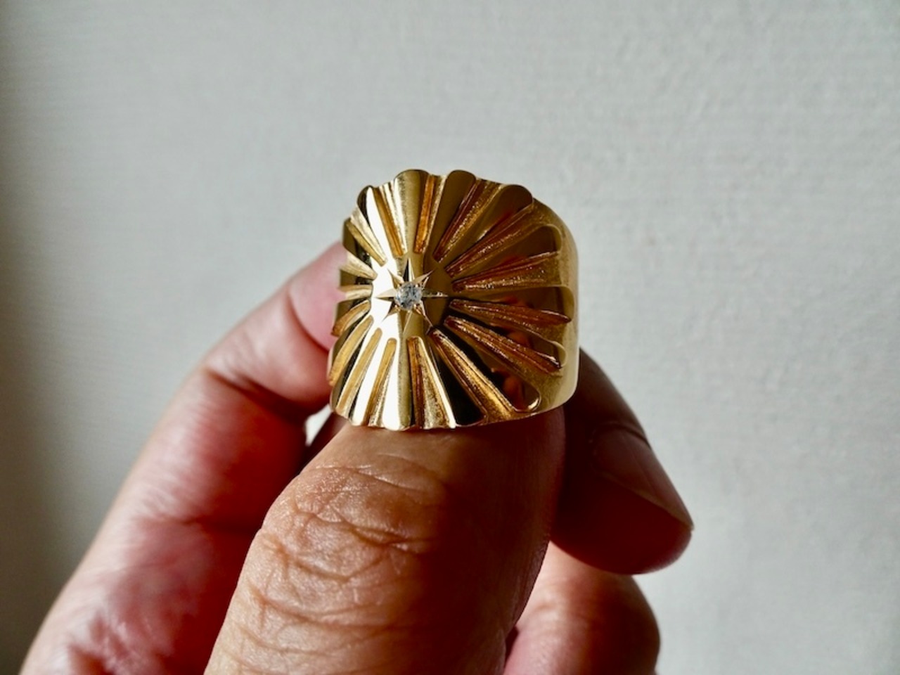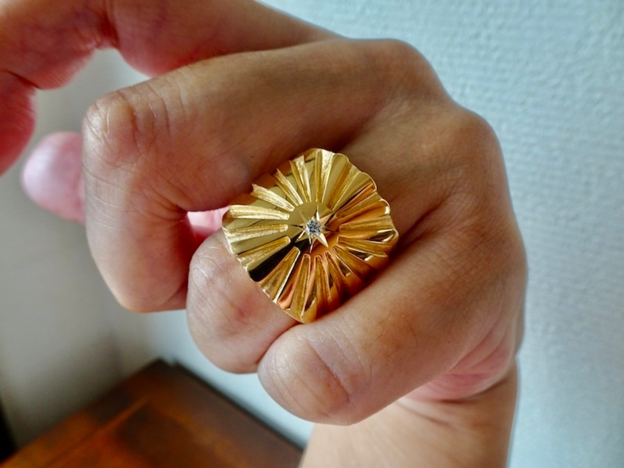 仁尾彫金『一つ星ダイヤ、k18、最大幅2.1cm太陽の平打ちリング』ハンドメイド327
