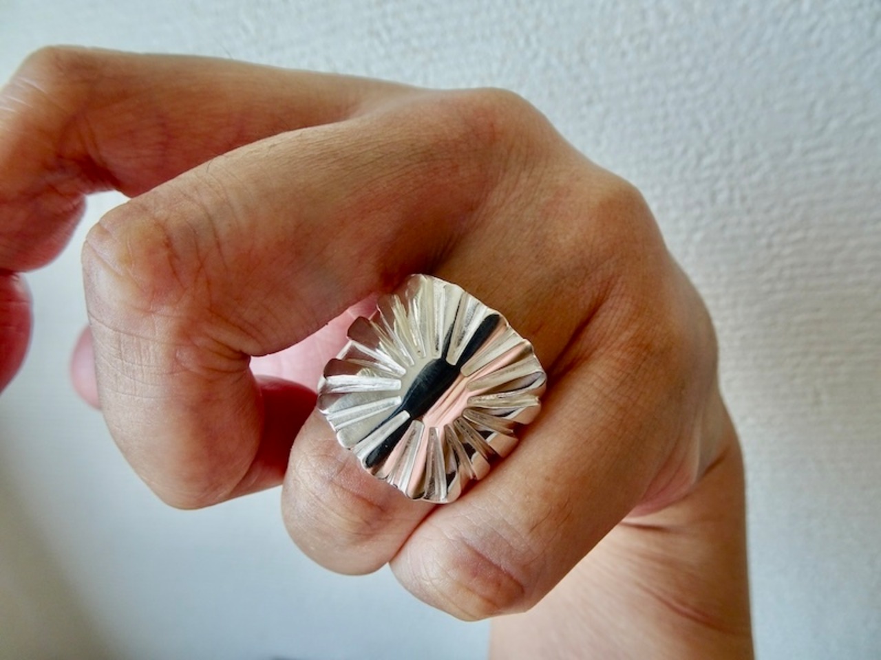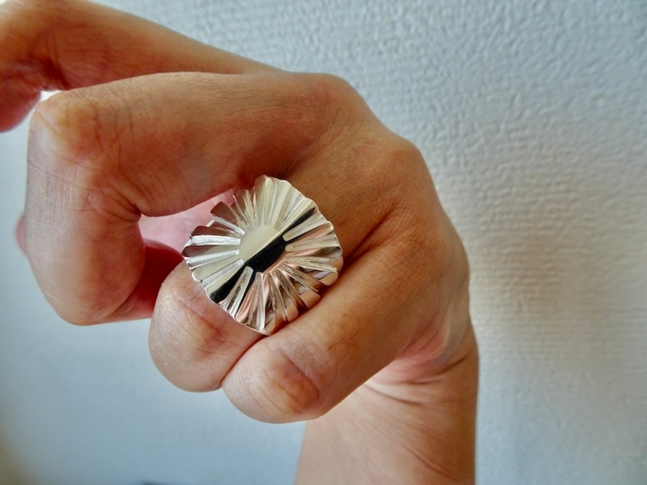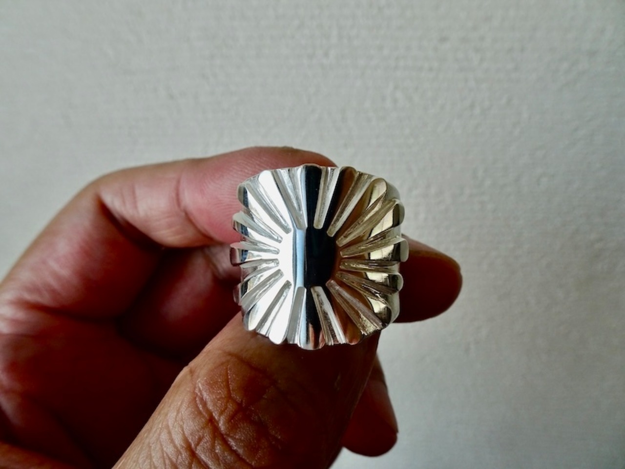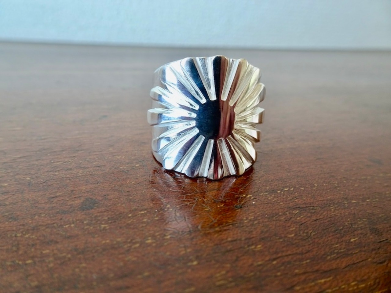 仁尾彫金『最大幅2.1cm、プラチナ、太陽の平打ちリング』ハンドメイド309