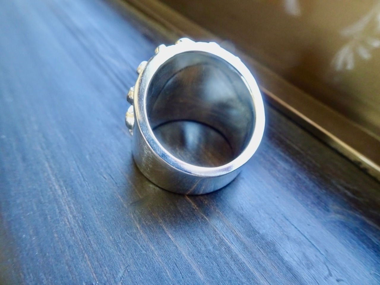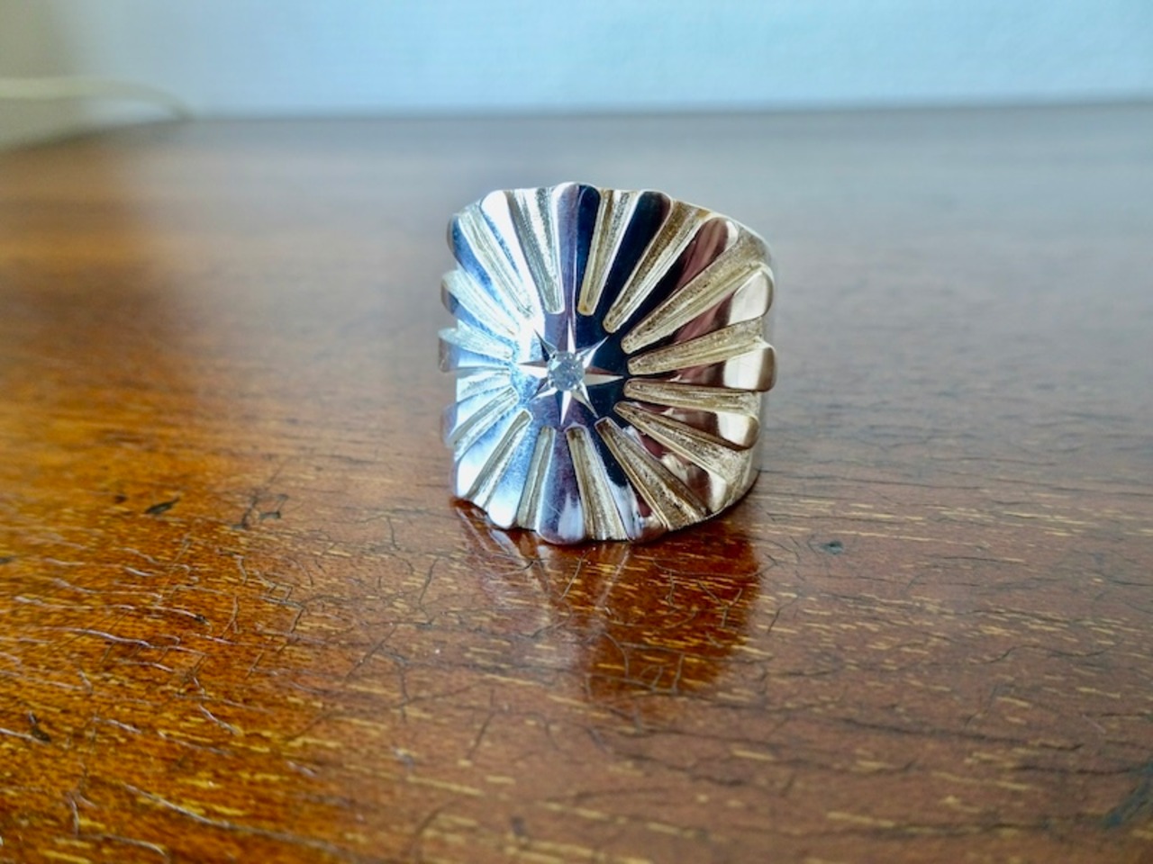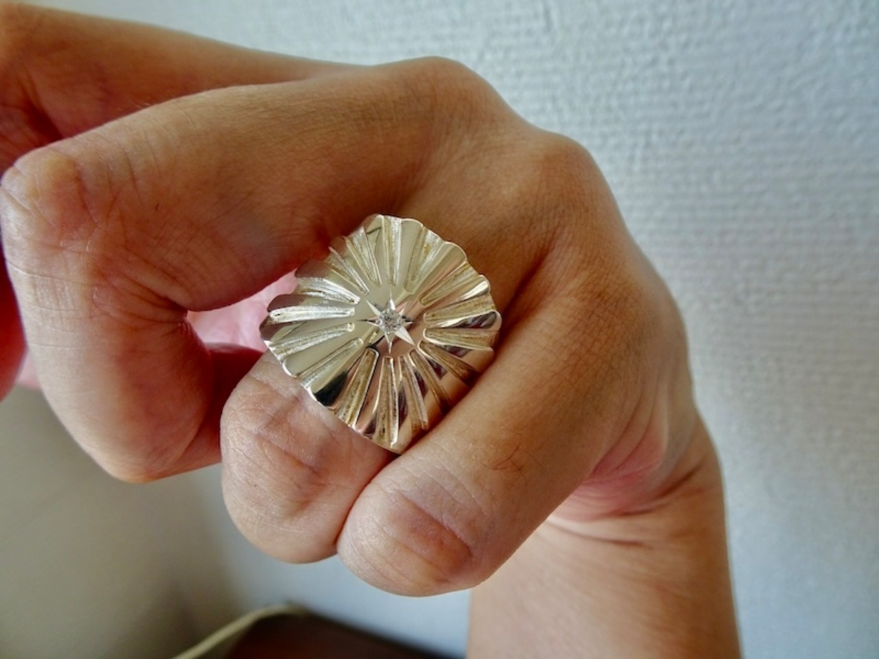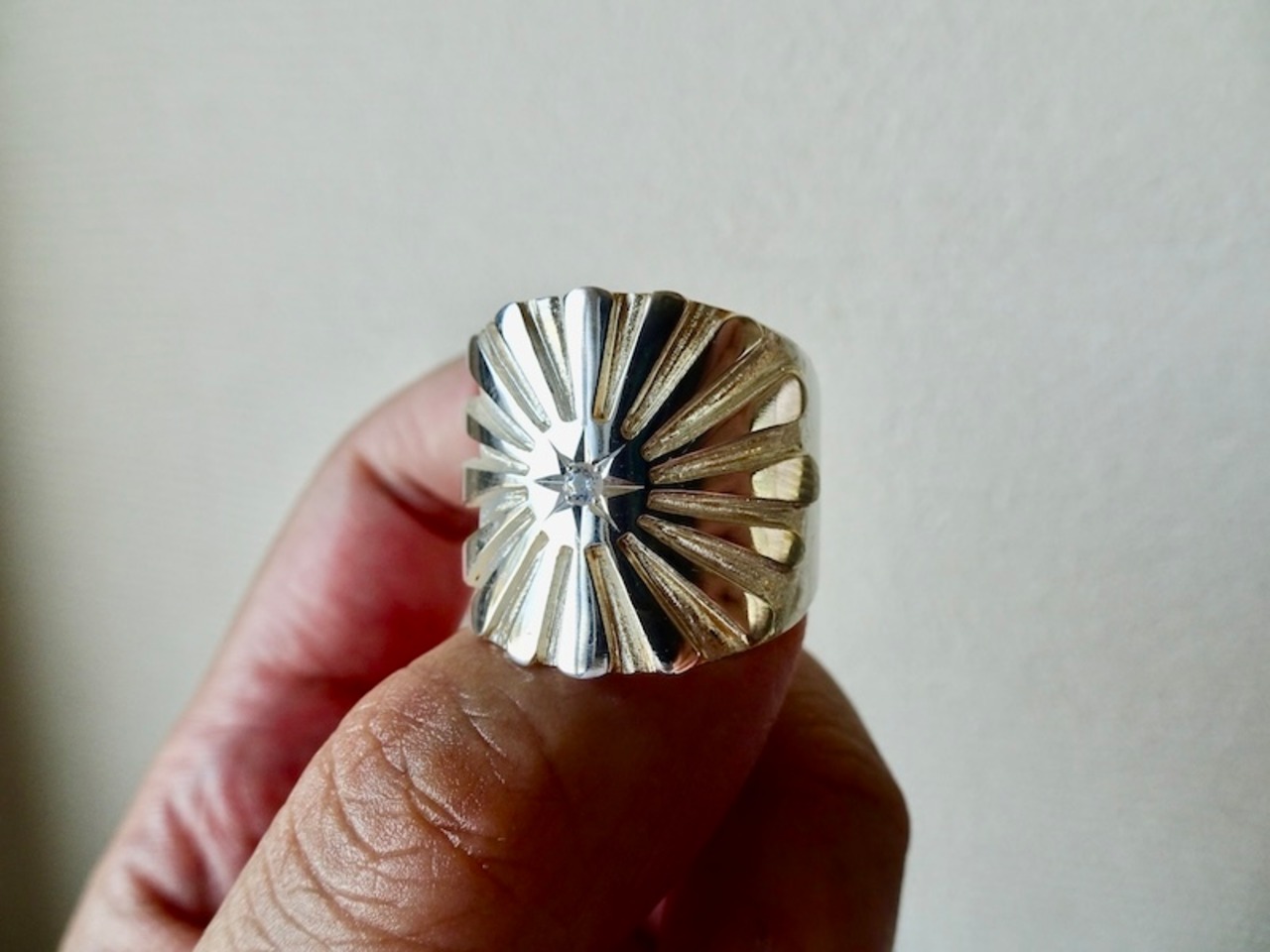 仁尾彫金『一つ星ダイヤ、最大幅2.1cm、プラチナ太陽の平打ちリング』ハンドメイド327