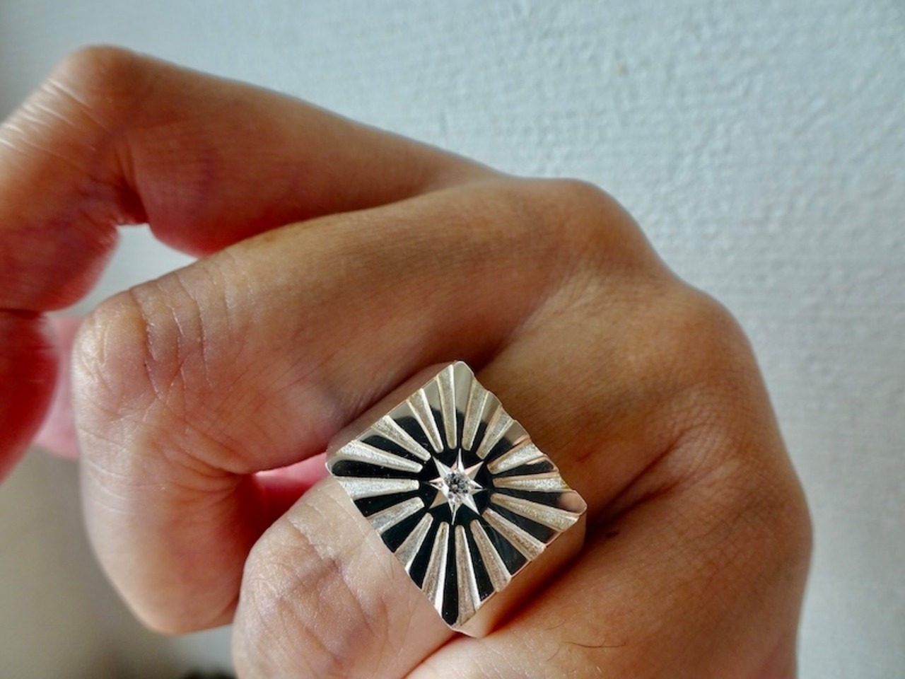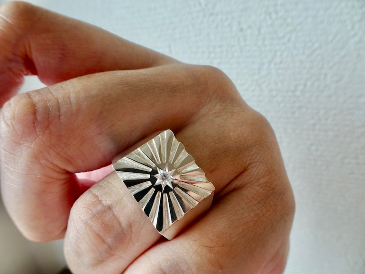 ごらん頂きありがとうございます。 オリジナルブランド 仁尾彫金『一つ星ダイヤ、プラチナ、太陽の印台リング2、磨き』を出品致します。 オリジナルのアクセサリーを自ら制作しています。今回、縦横1.4×1.6cmの印台面に太陽のモチーフを造形致しました。光の部分も磨いています。そこに今回、太陽と重なる輝く星をイメージした2.3mmの天然ダイヤを1石堀留致しました。使用ダイヤは上級クラスのダイヤなので無色透明で照り、輝きは最高です!!全てプラチナの塊でpt900を約41gとズッシリとしっかりとした作りになっています。全てプラチナの塊なので変色する事はありません。オリジナリティを追求しデザイン、制作を私自身で行っている為、今回、新品をご用意致します!!