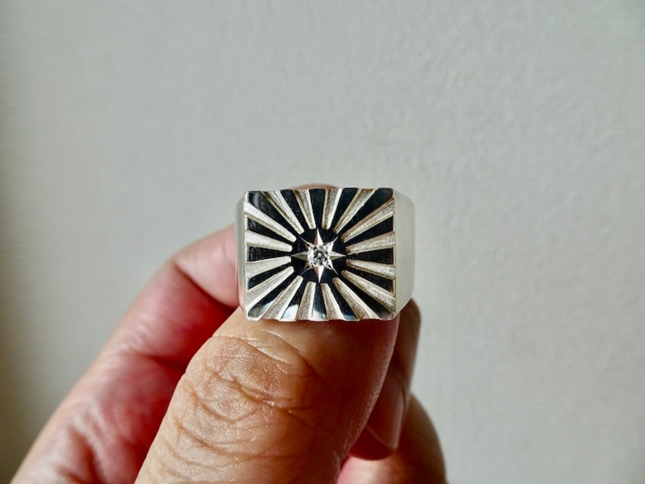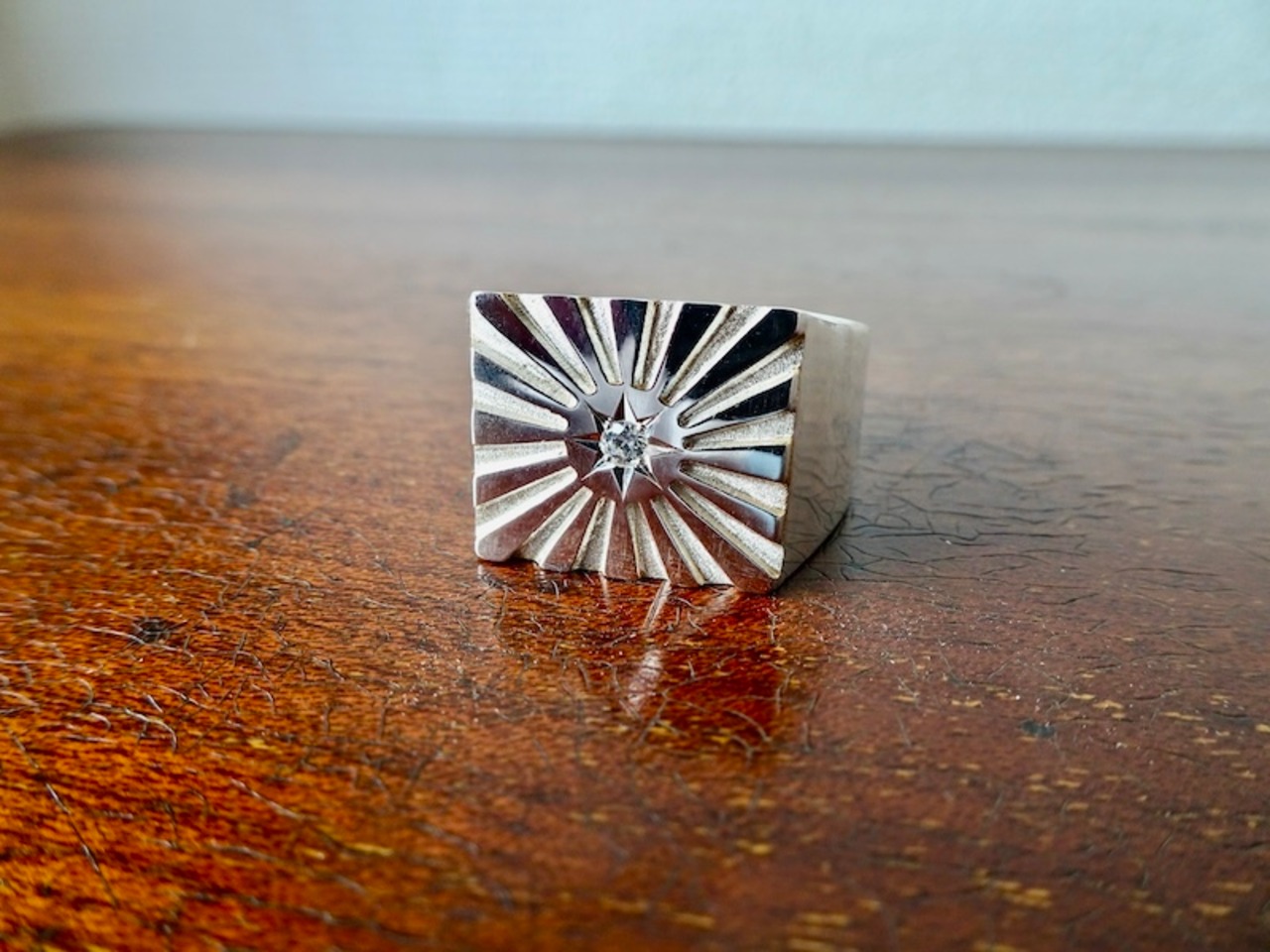 仁尾彫金『一つ星ダイヤ、プラチナ、太陽の印台リング2、磨き』ハンドメイド332
