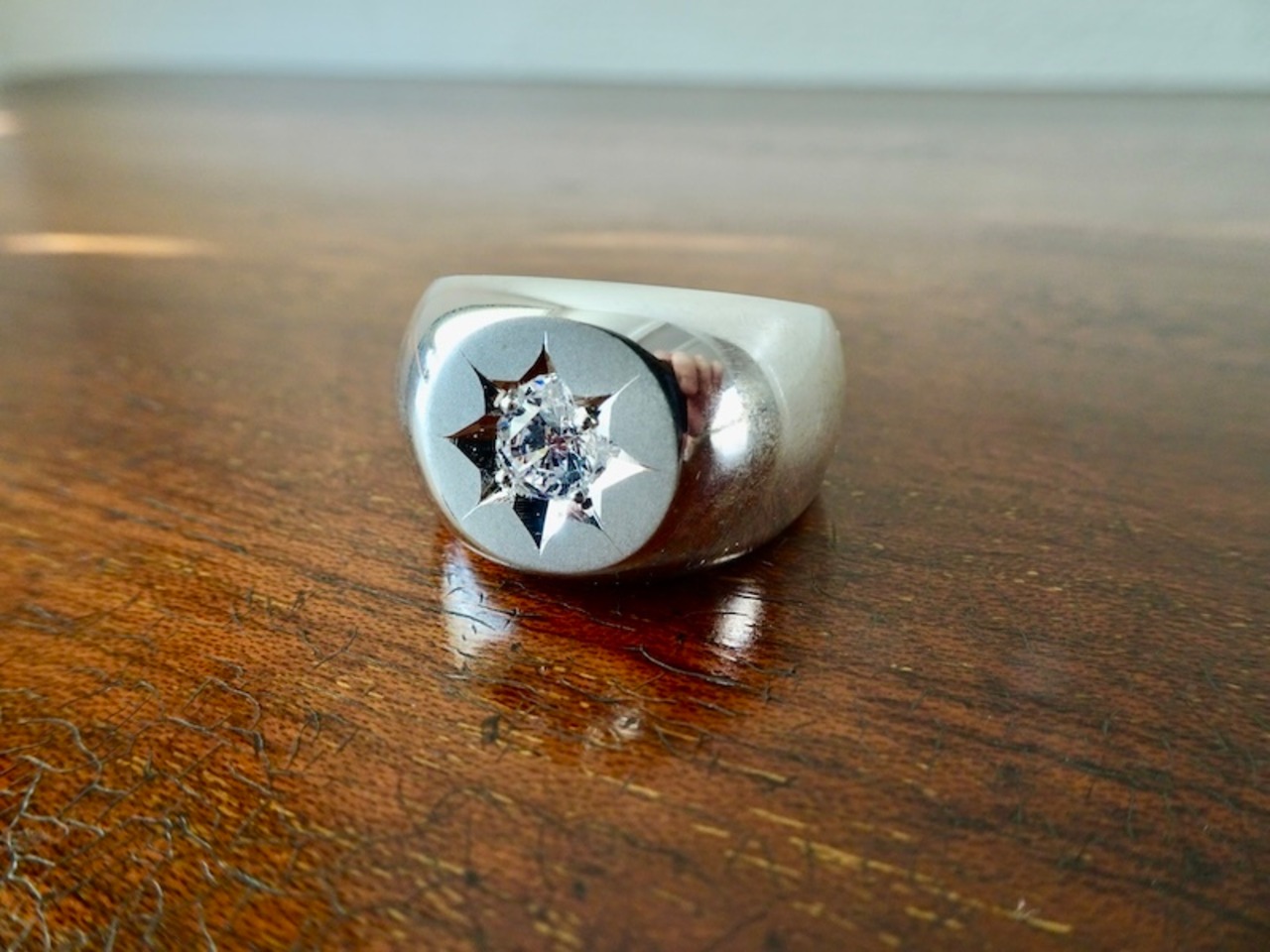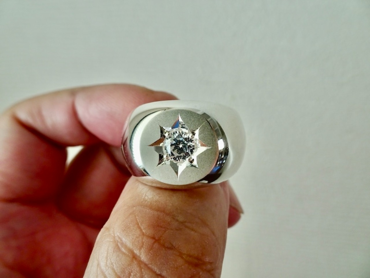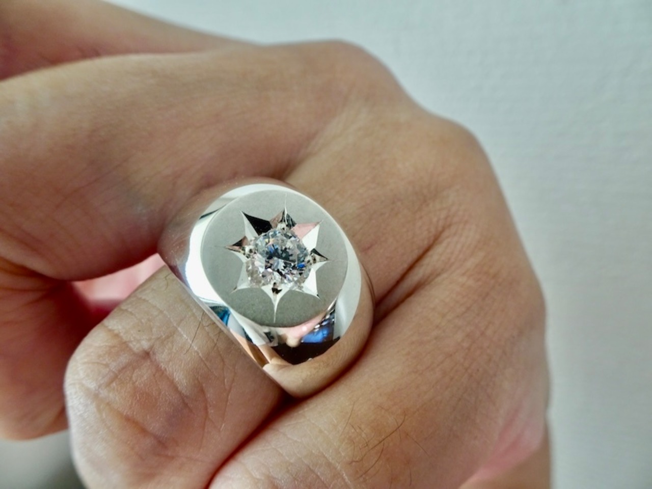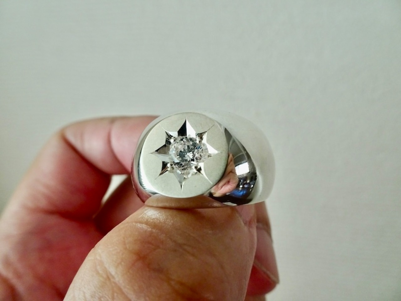 仁尾彫金『一つ星ジルコニア、プラチナ、丸の印台リング』ハンドメイド338