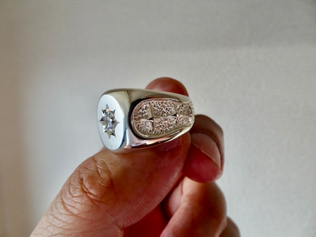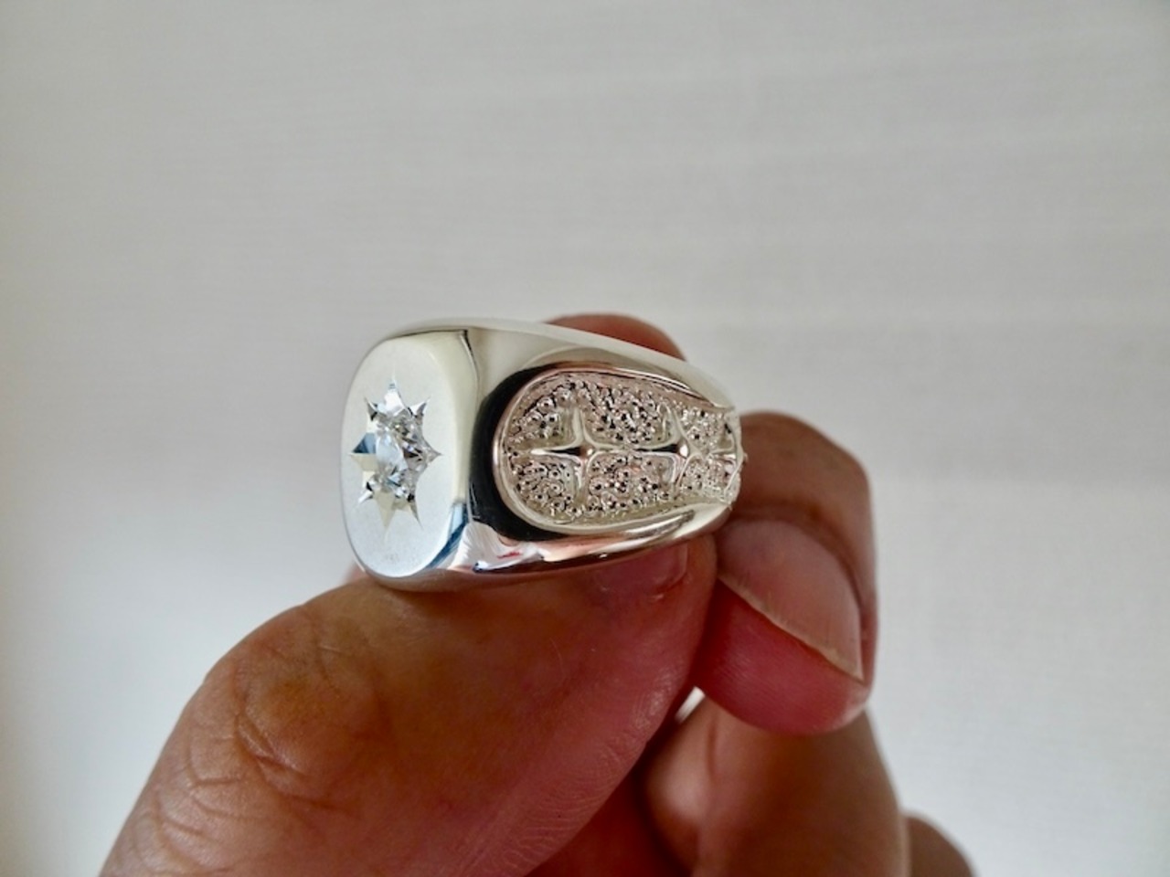 仁尾彫金『一つ星ジルコニア、プラチナ、ギャラクシー楕円の印台リング』ハンドメイド344