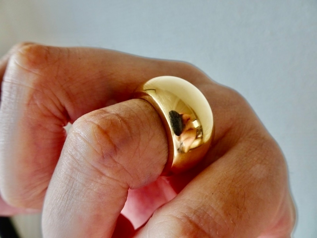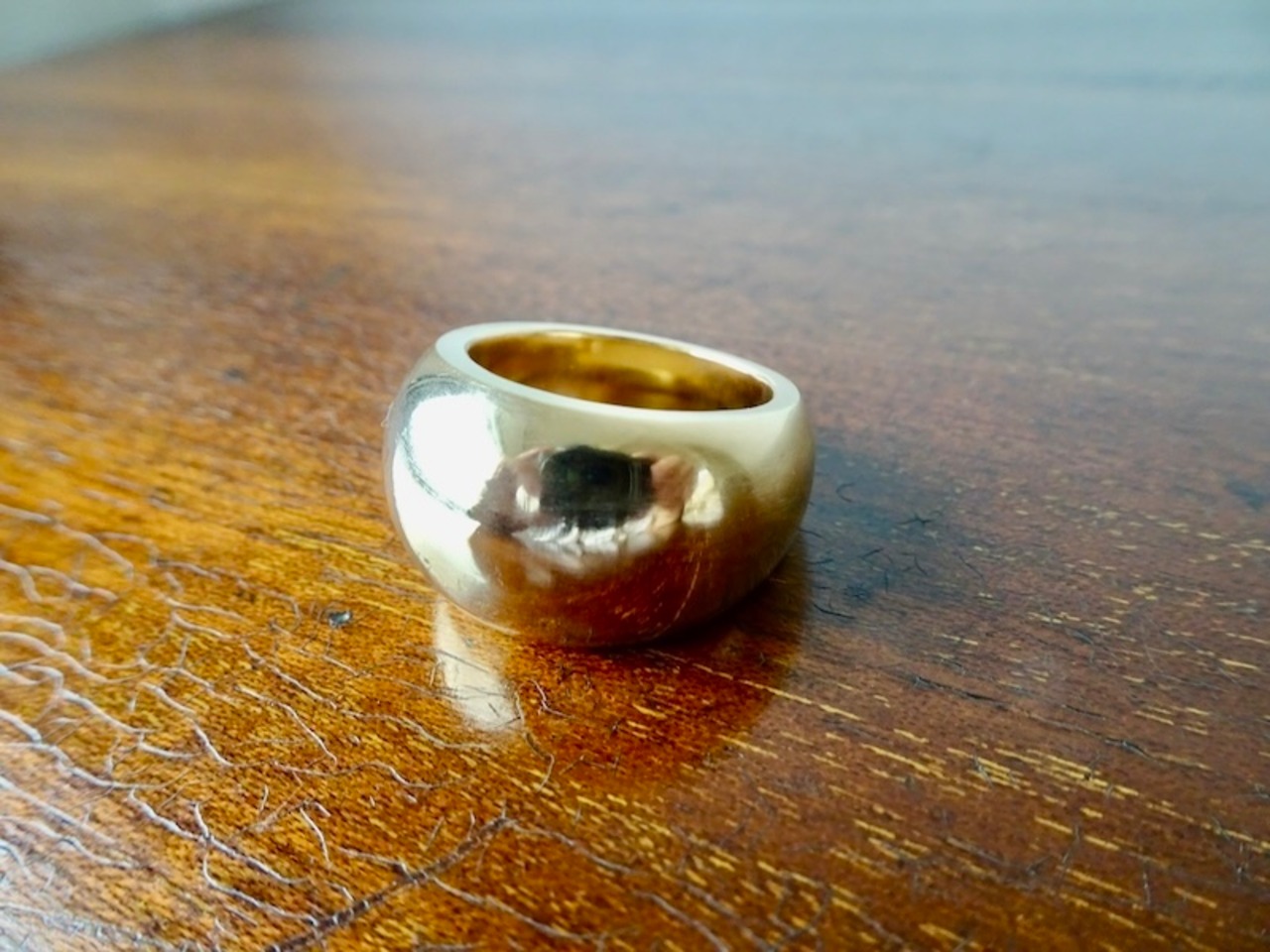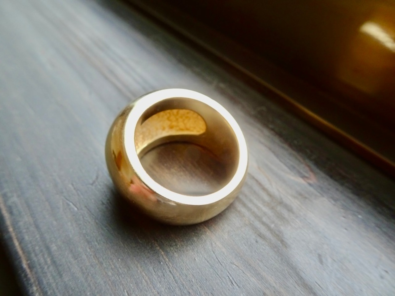 ごらん頂きありがとうございます。 オリジナルブランド 仁尾彫金『k18、甲丸リング』を出品致します。オリジナルのアクセサリーを自ら制作しています。今回、シンプルな甲丸リングを制作致しましました。最大幅は約1.4cm弱、最大厚みは約6mm弱で、全て金の塊で重量も約34gとk18をズシリとしっかりとした作りになっています。全て金の塊なので永久にゴールドに輝き続けます!!オリジナリティを追求しデザイン、制作を私自身で行っている為、今回、新品をご用意致します!!