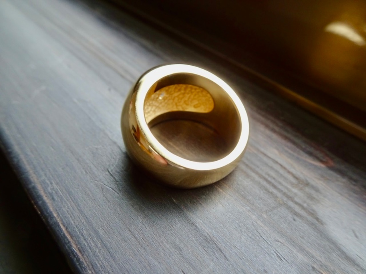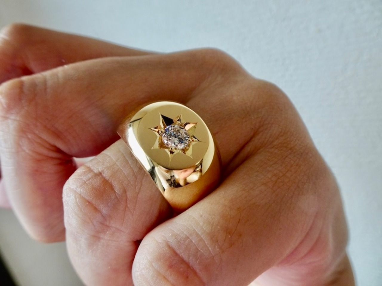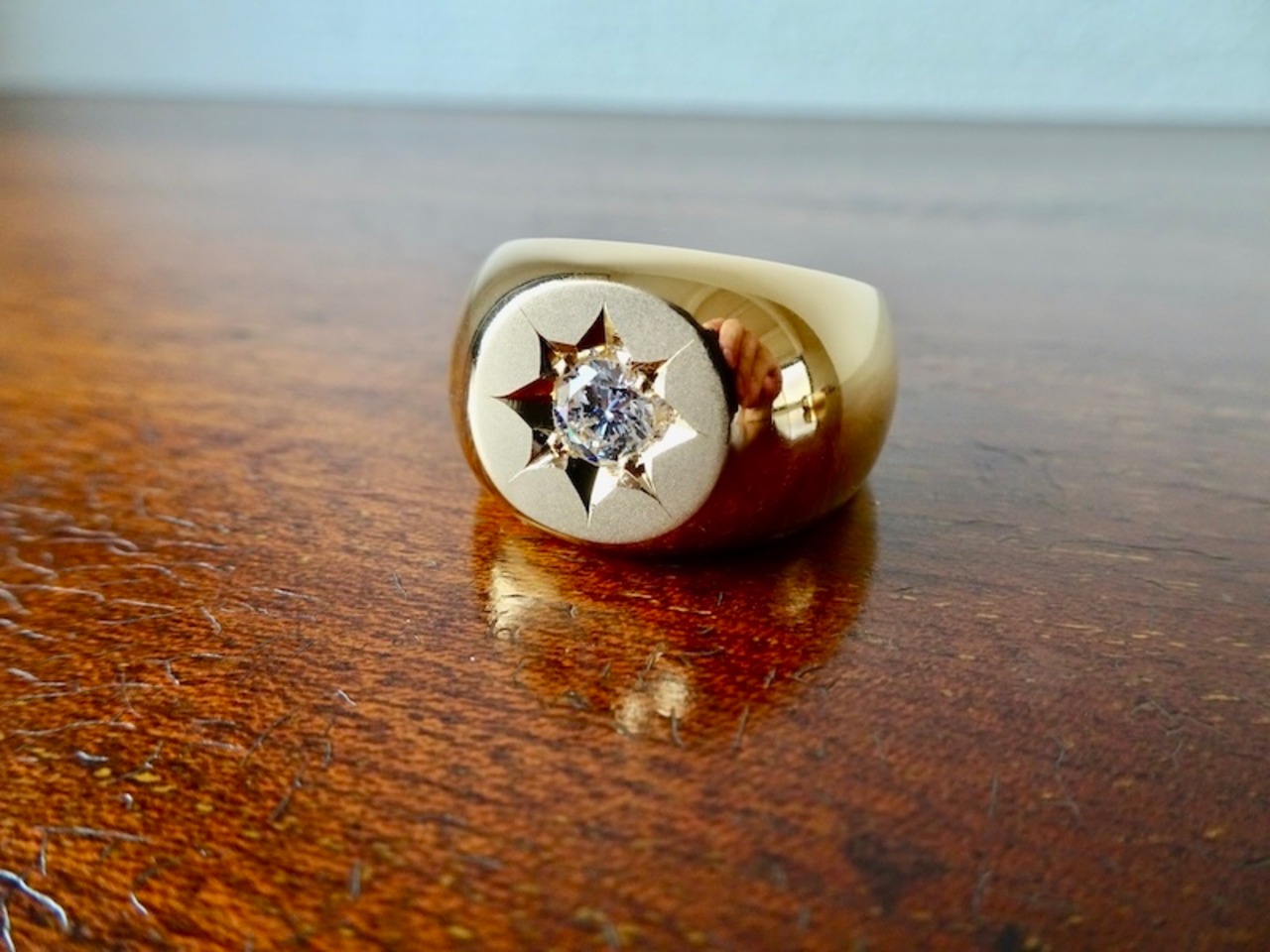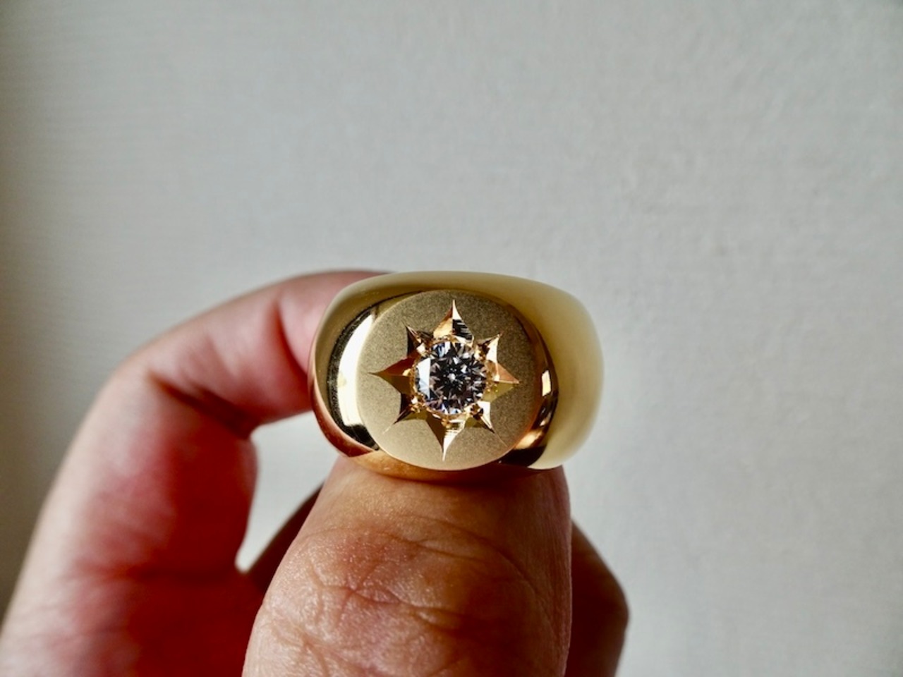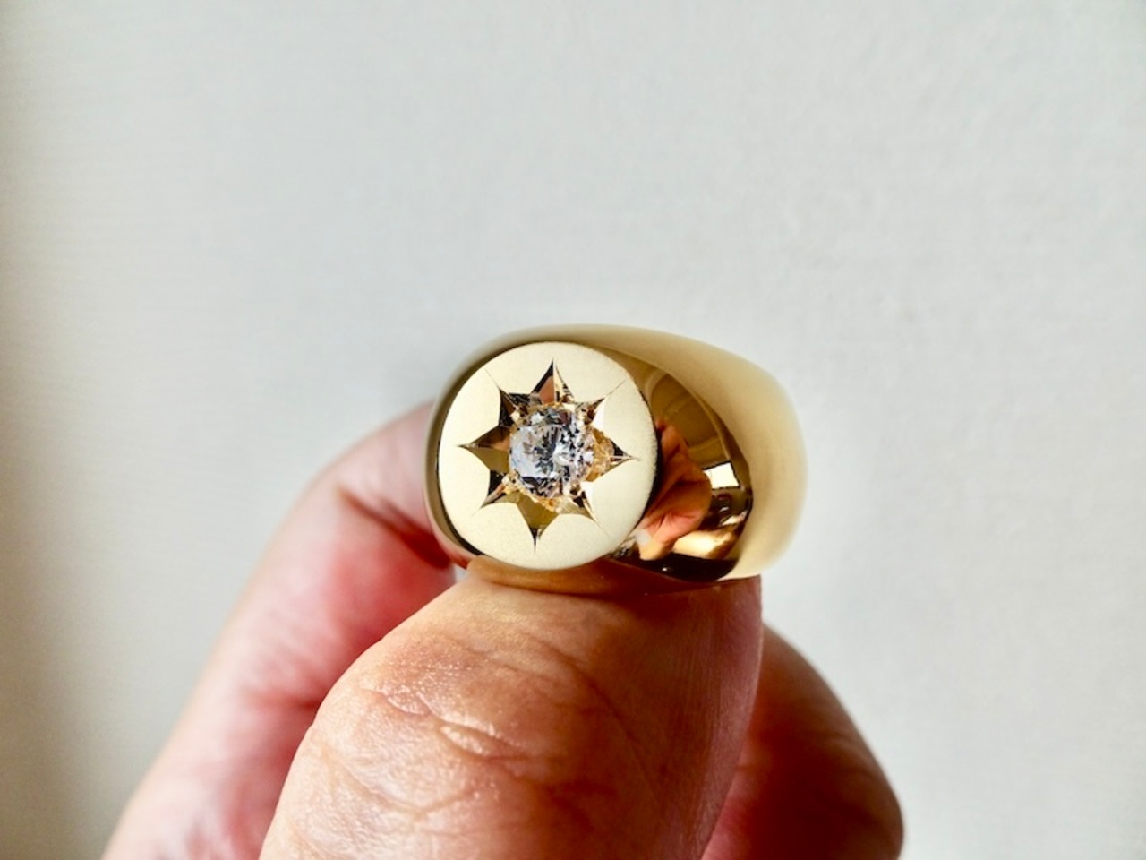 仁尾彫金『一つ星ジルコニア、k18、丸の印台リング』ハンドメイド338