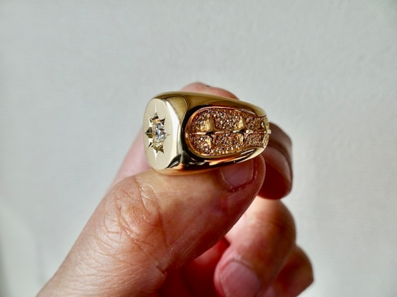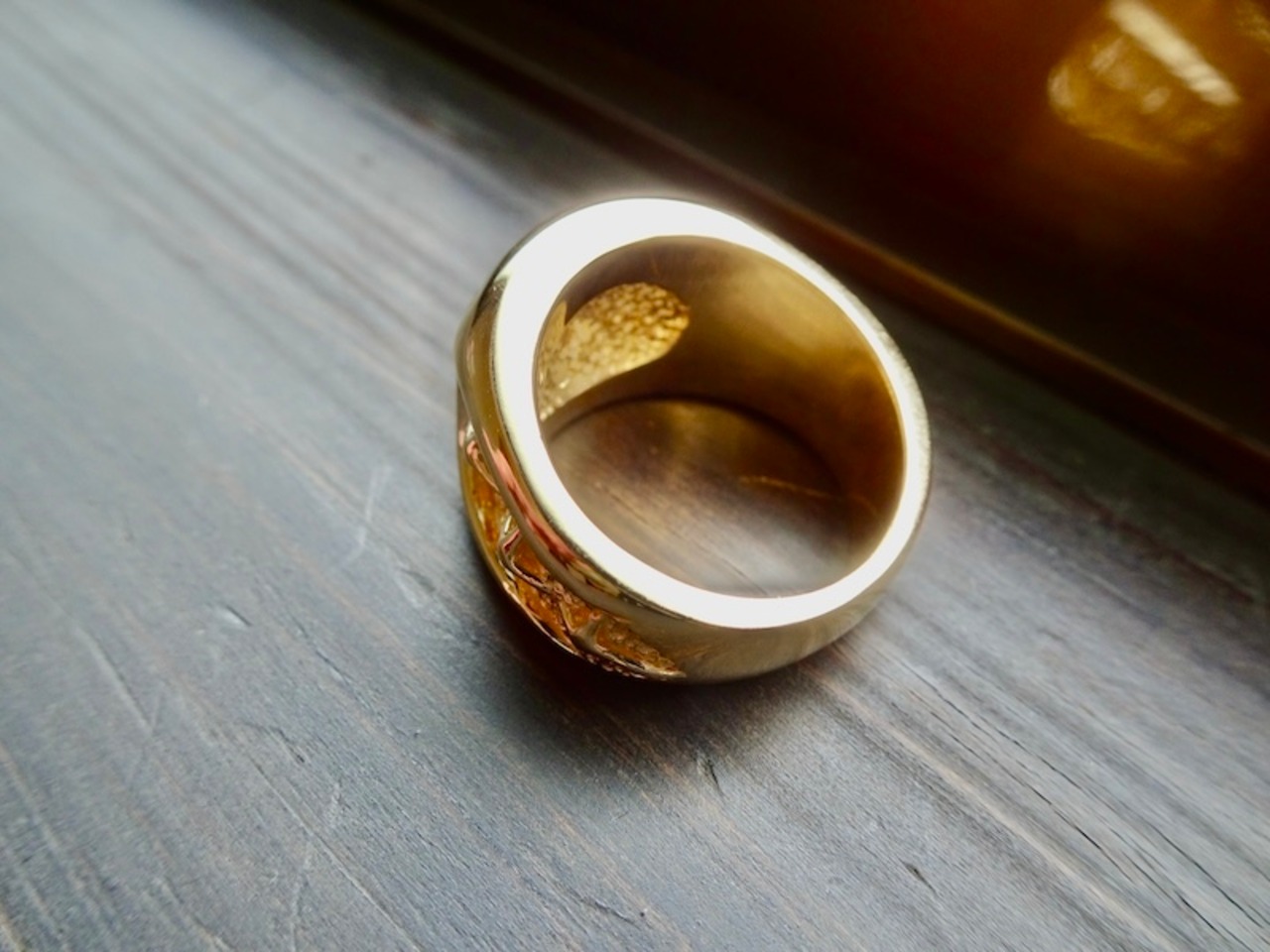 ごらん頂きありがとうございます。 オリジナルブランド 仁尾彫金『一つ星ジルコニア、k18、ギャラクシー楕円の印台リング』を出品致します。宇宙をテーマにしたアクセサリーをオリジナルで自ら制作しています。今回、 楕円の印台を中心にサイドに流れる様な動きをつけた造形を表現致しました。サイドには3つづつ十字星のモチーフを配置しています。印台部分は艶消し加工しています。そこに今回、星の輝きをイメージして4.5mmのジルコニアを彫り留め致しました。リングの最大幅は約1.5cm、最大厚みは約4ミリとなり全て金の塊で重量もk18を約27gとズッシリしっかりとした作りになっています。全て金の塊なので永久にゴールドに輝き続けます!! オリジナリティを追求しデザイン、制作を私自身で行っている為、今回、新品をご用意致します!!