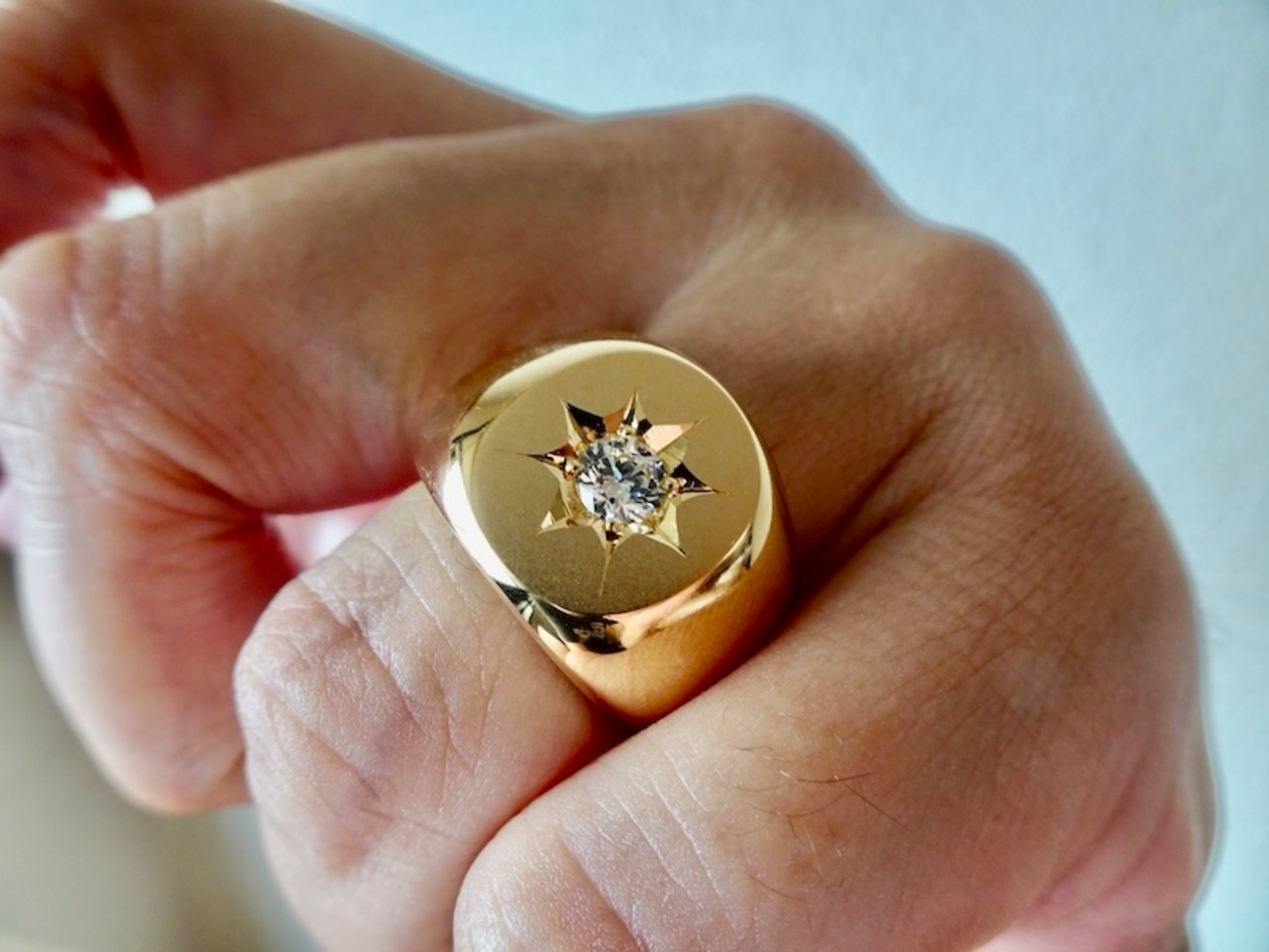 ごらん頂きありがとうございます。 オリジナルブランド 仁尾彫金『一つ星ジルコニア、k18、楕円の印台リング2』を出品致します。オリジナルのアクセサリーを自ら制作しています。シンプルな楕円の印台リングを制作致しましました。印台面は艶消ししています。そこに今回、星の輝きをイメージして4.5mmのジルコニアを彫り留め致しました。最大幅は約1.5cm、最大厚みは約4.5mm重量も全て金の塊でk18を約27gと大胆に使用し、しっかりとした作りになっています。全て金の塊なので永久にゴールドに輝き続けます!!オリジナリティを追求しデザイン、制作を私自身で行っている為、今回、新品をご用意致します!!