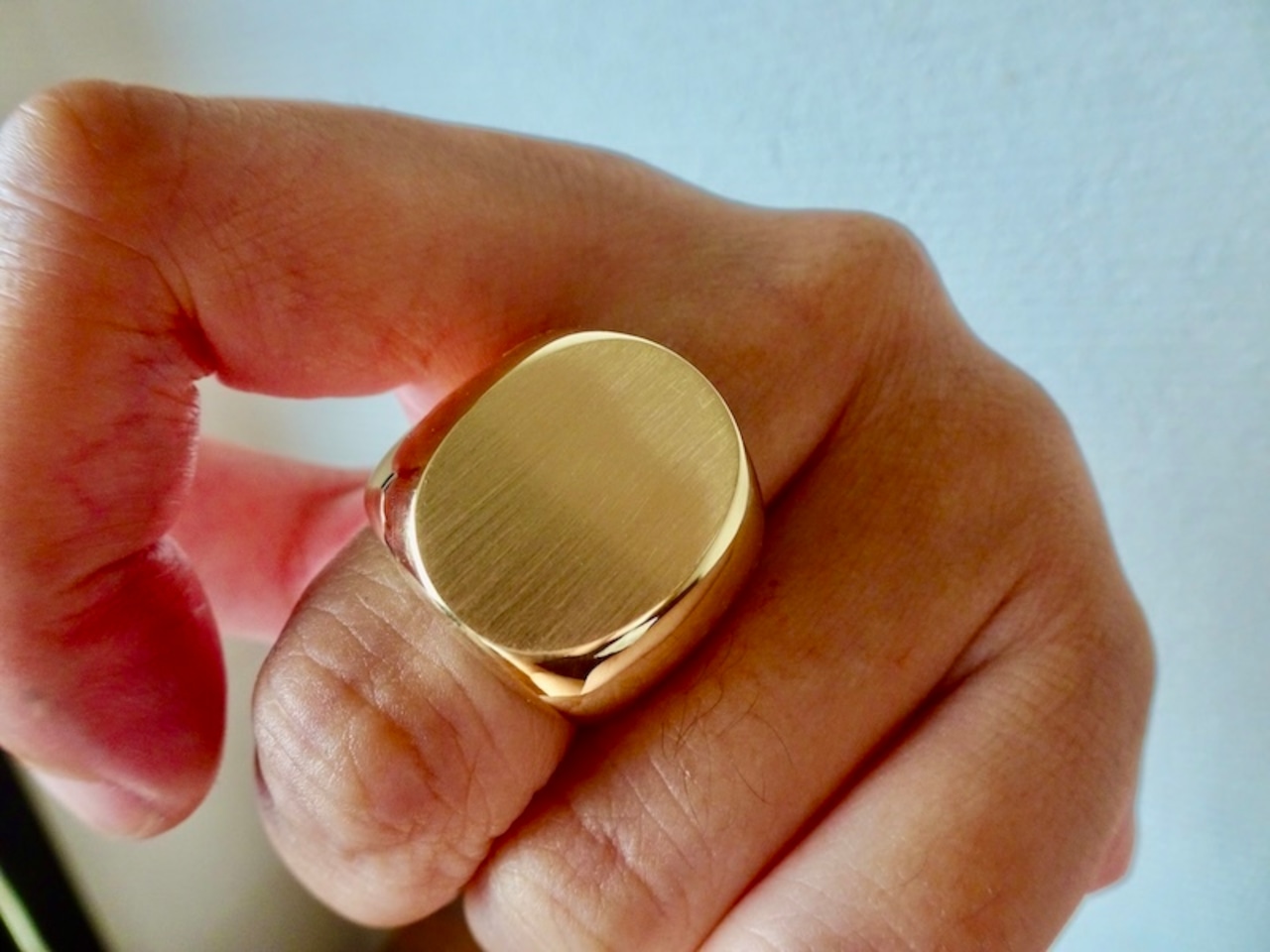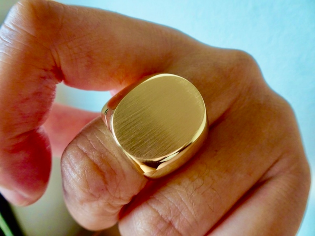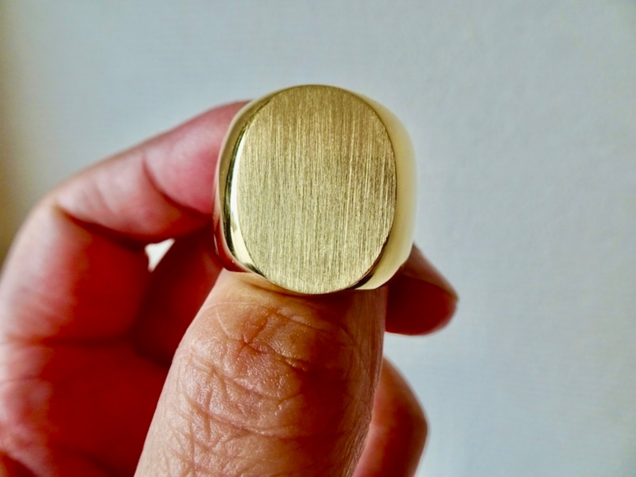 ごらん頂きありがとうございます。 オリジナルブランド 仁尾彫金『楕円のk18印台リング、ヘアライン』を出品致します。オリジナルのアクセサリーを自ら制作しています。今回、幅2.2cmの楕円のシンプルな印台リングを制作致しました。印台面はヘアラインの艶消しをしています。意外に楕円の印台リングは無いと思い作りました。重量も約54gと全てK18の塊で金をズシリと大胆に使用しています。全て金の塊なので永久にゴールドに輝き続けます!!オリジナリティを追求しデザイン、制作を私自身で行っている為、今回、新品をご用意致します!!