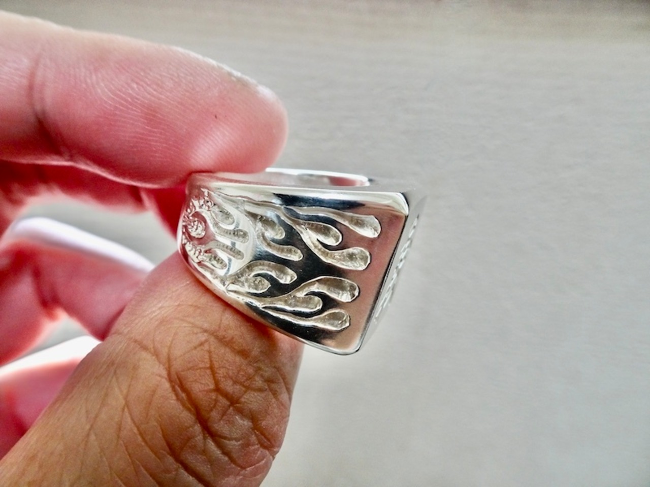 ごらん頂きありがとうございます。 オリジナルブランド 仁尾彫金『文字彫り、ファイヤーパターン、プラチナ印台リング』を出品致します。 オリジナルのアクセサリーを自ら制作しています。ファイヤーパターンモチーフをシンプルな印台リングの両サイドに造形致しました。印台面は艶消し処理をしています。そこに今回、印台面にお客様のご希望の文字をレーザー彫り致します。リングの最大幅は1.9cm弱で、全てプラチナの塊でプラチナ900を約70gとズッシリと大胆に使用しています。全てプラチナの塊なので永久に変色する事はありません!!デザイン、制作を私自身で行っている為、今回、新品をご用意致します!!