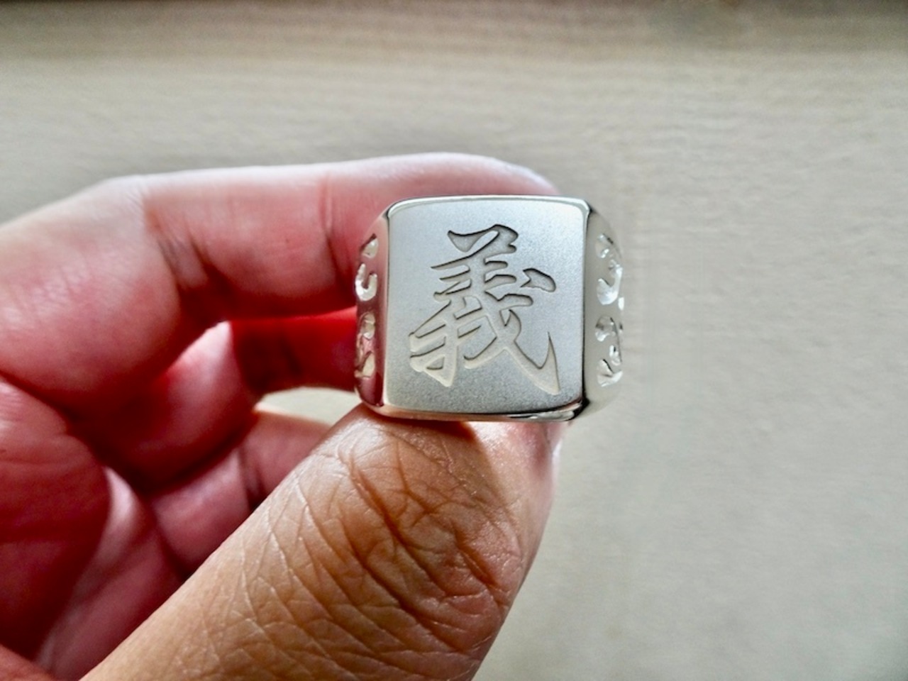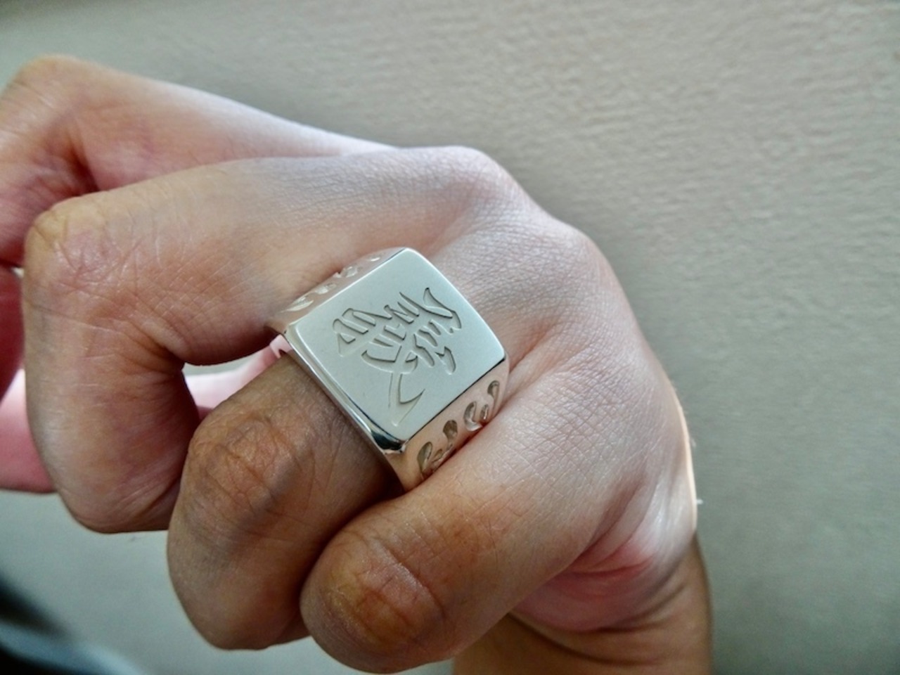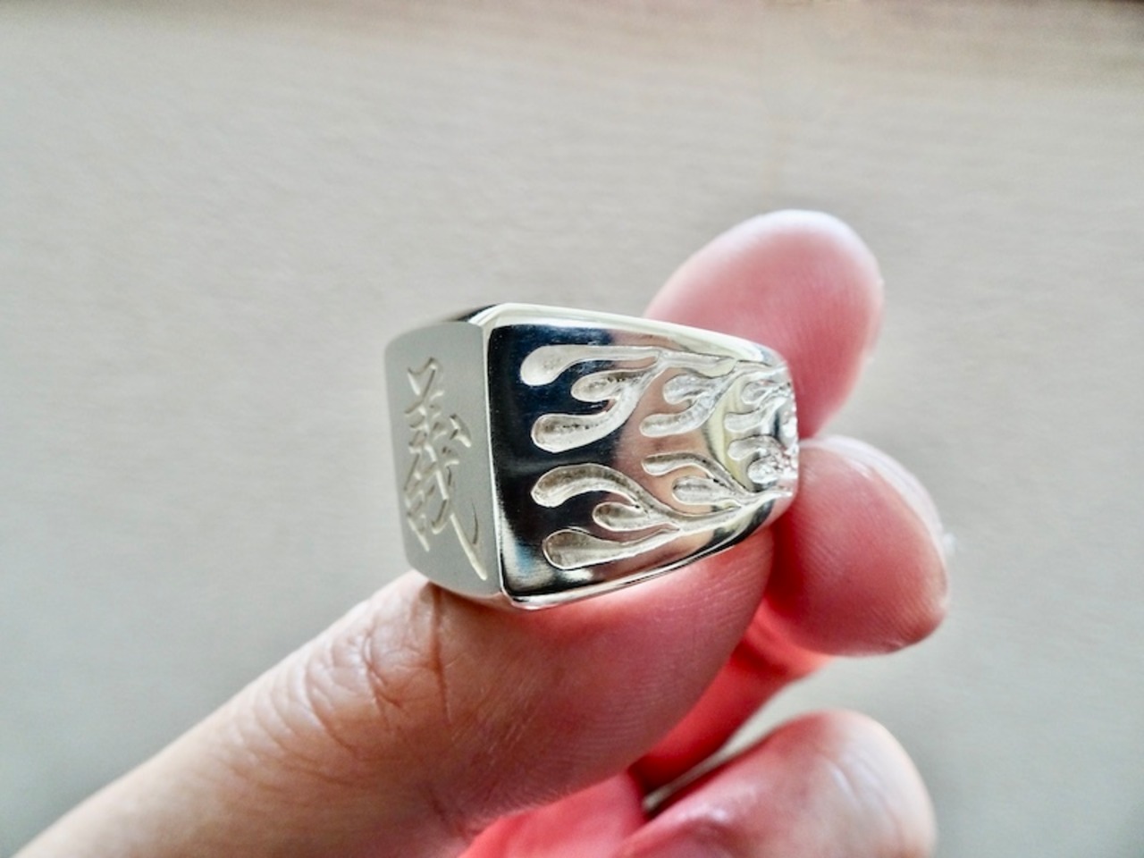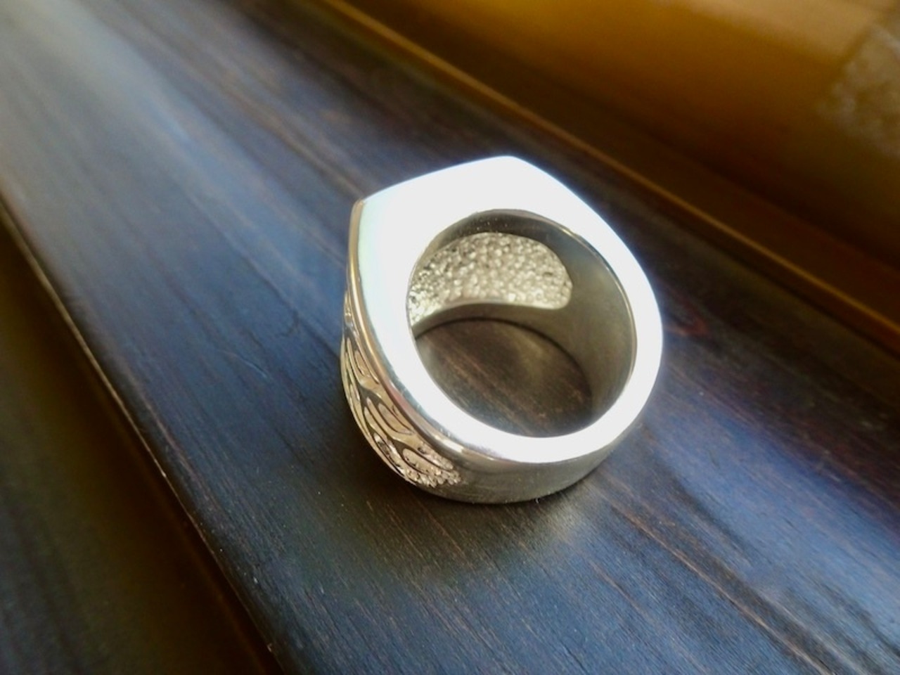 仁尾彫金『文字彫り、ファイヤーパターン、プラチナ印台リング』ハンドメイド274