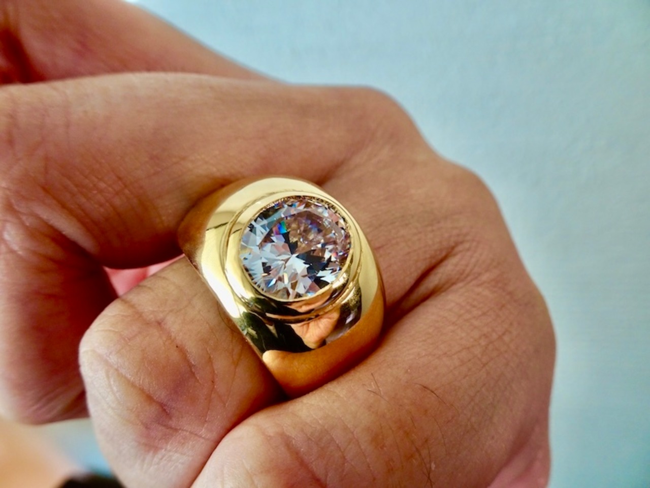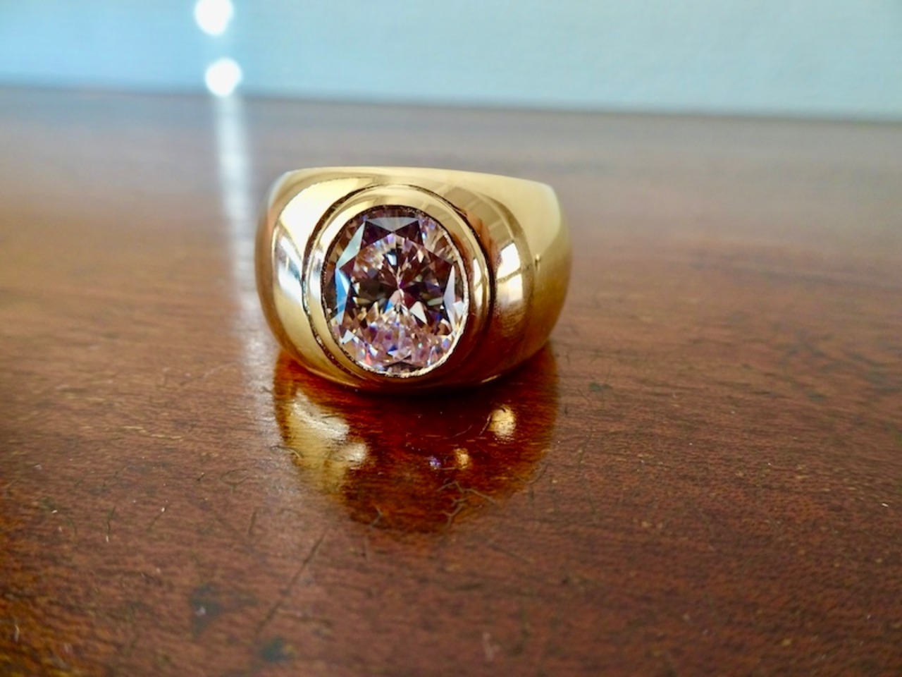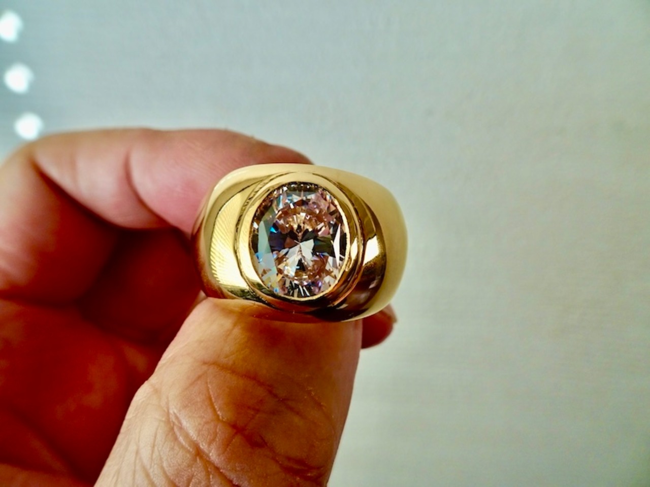 ごらん頂きありがとうございます。 オリジナルブランド 仁尾彫金『オーバルカットジルコニア、k18覆輪リング』を出品致します。オリジナルのアクセサリーを自ら制作しています。今回、最大幅1.6cmのリングに縦12ミリ、横10ミリのオーバルカットのジルコニアを覆輪留め致しました。石も含め最大厚みは7mm弱と肉厚です。全て金の塊でk18を約42gとズシリ使用し、しっかりとした作りになっています。全て金の塊なので永久にゴールドに輝き続けます!!オリジナリティを追求しデザイン、制作を私自身で行っている為、今回、新品をご用意致します!!