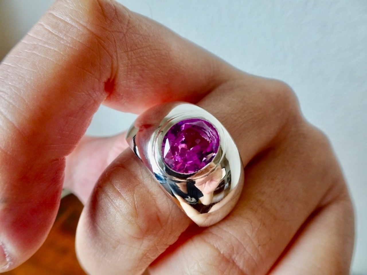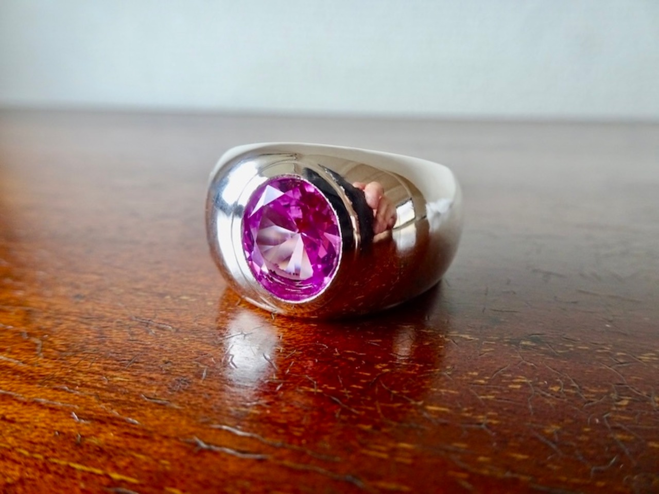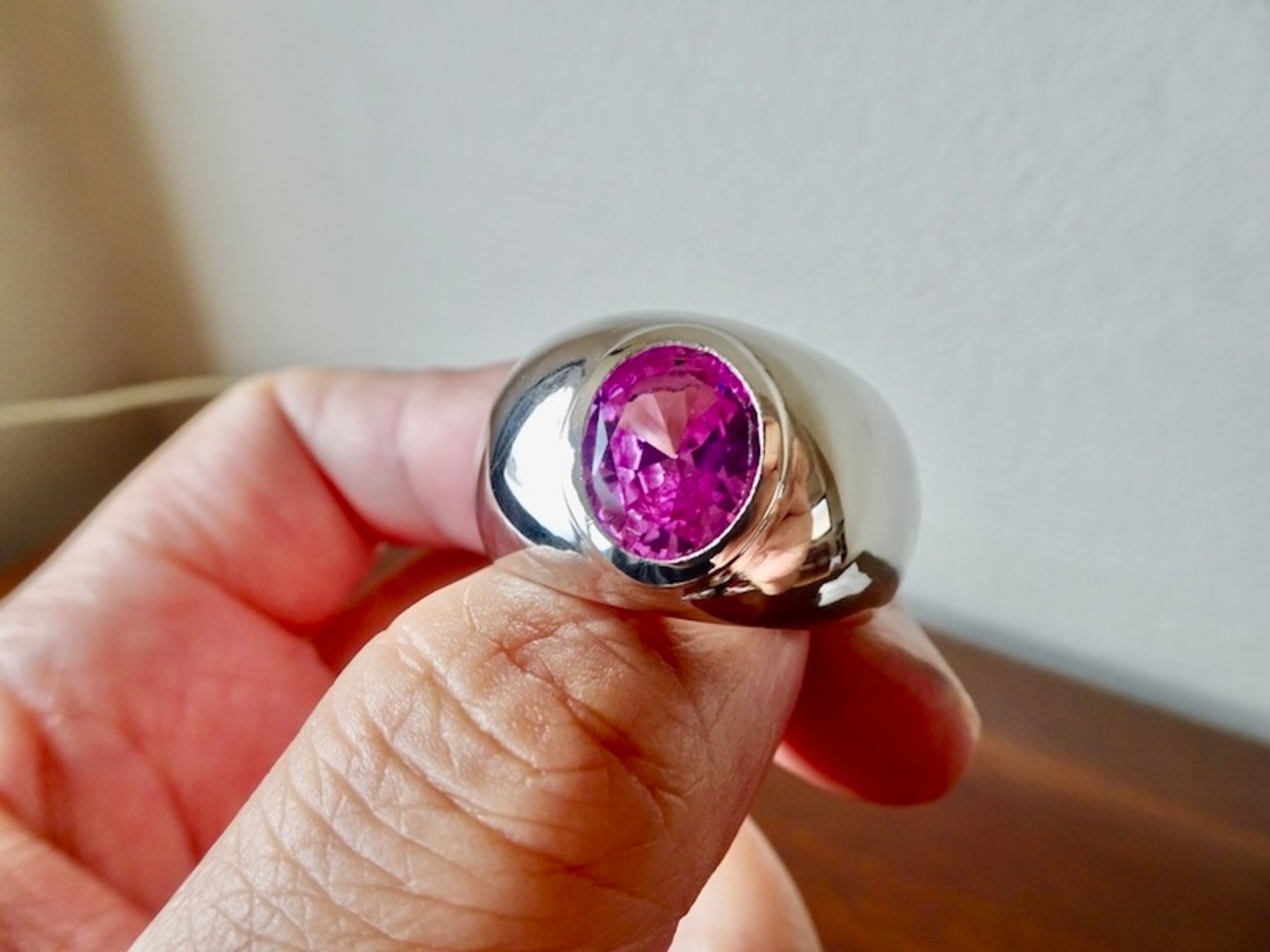 仁尾彫金『オーバルカット合成ローズサファイア覆輪プラチナ、リング』ハンドメイド359