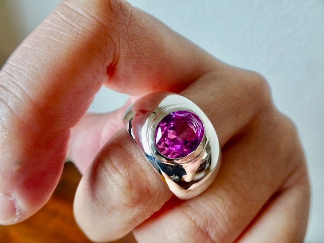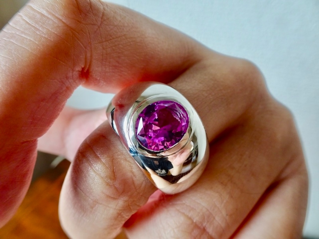 ごらん頂きありがとうございます。 オリジナルブランド 仁尾彫金『オーバルカット合成ローズサファイア覆輪プラチナ、リング』を出品致します。オリジナルのアクセサリーを自ら制作しています。今回、最大幅1.6cmのリングに縦12ミリ、横10ミリのオーバルカットの合成ローズサファイアを覆輪留め致しました。合成ですが本物と同じ成分、硬度になります。石も含め最大厚みは7mm弱と肉厚です。全てプラチナの塊でpt900を約55gとズシリと大胆に使用しています。全てプラチナの塊なので変色する事はありません!!オリジナリティを追求しデザイン、制作を私自身で行っている為、今回、新品をご用意致します!!