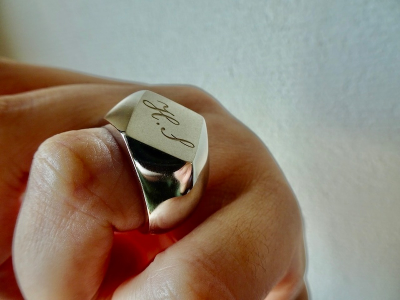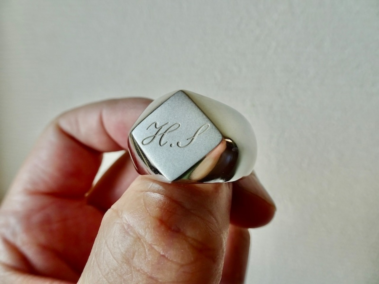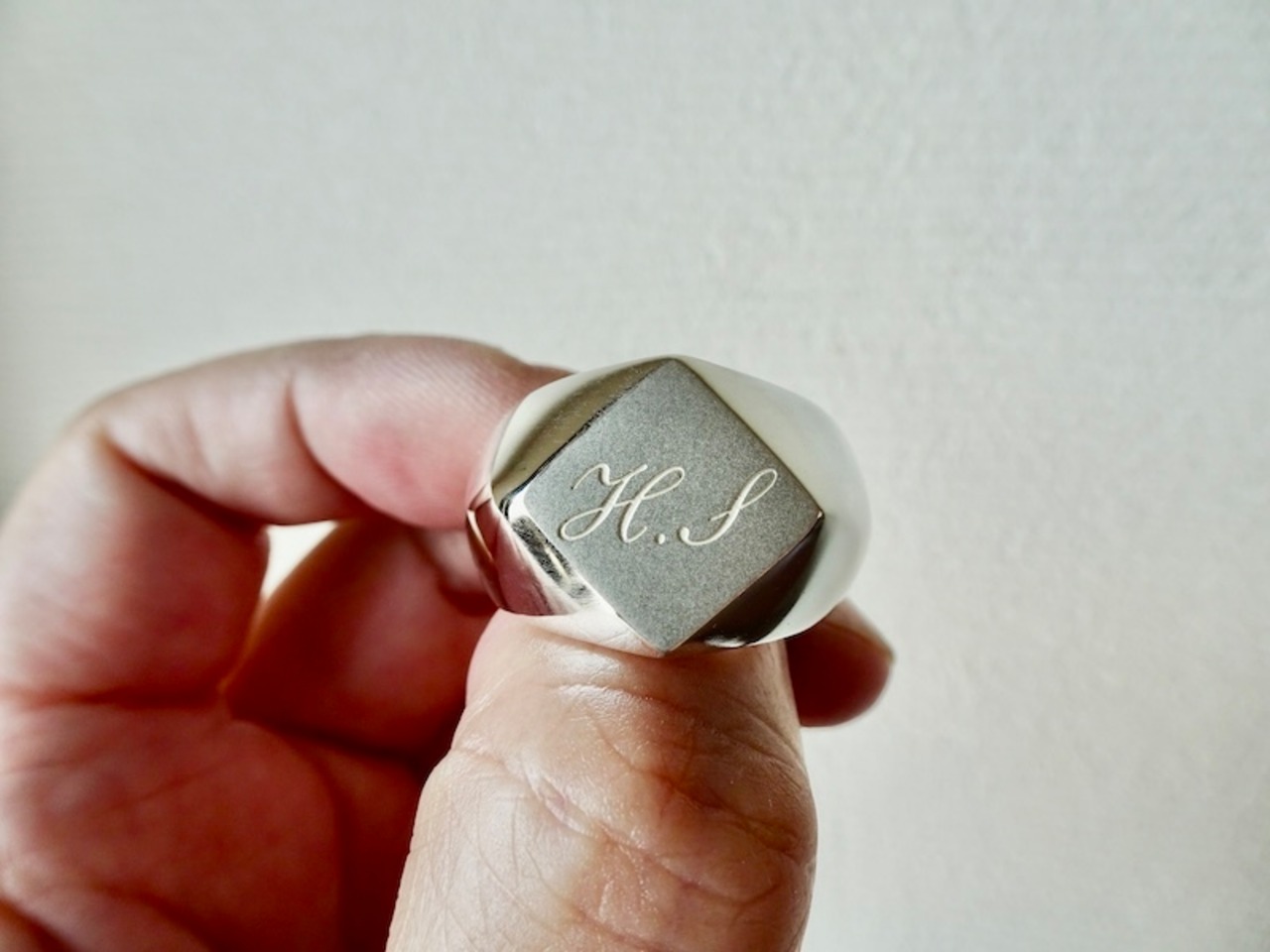仁尾彫金『文字彫り、プラチナ、菱形印台リング』ハンドメイド377